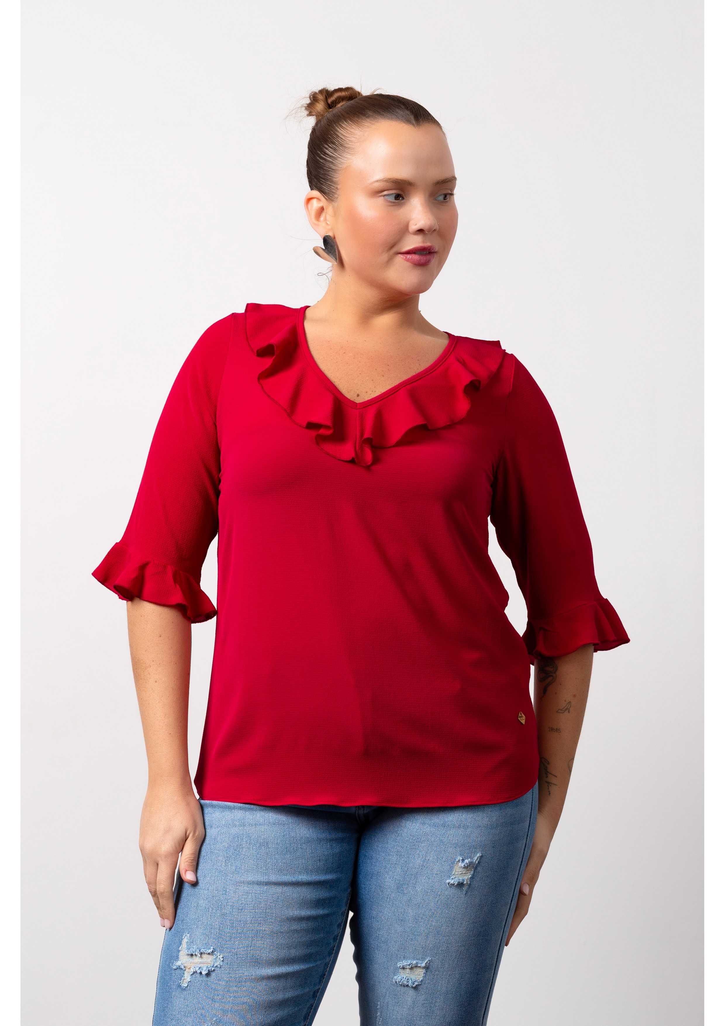 Túnica em tecido liso, decote em bico com folho, manga 3/4 com folhos. Acabamentos com rolinho. Modelo: Altura 1.70m e está a vestir o tamanho 2XL |