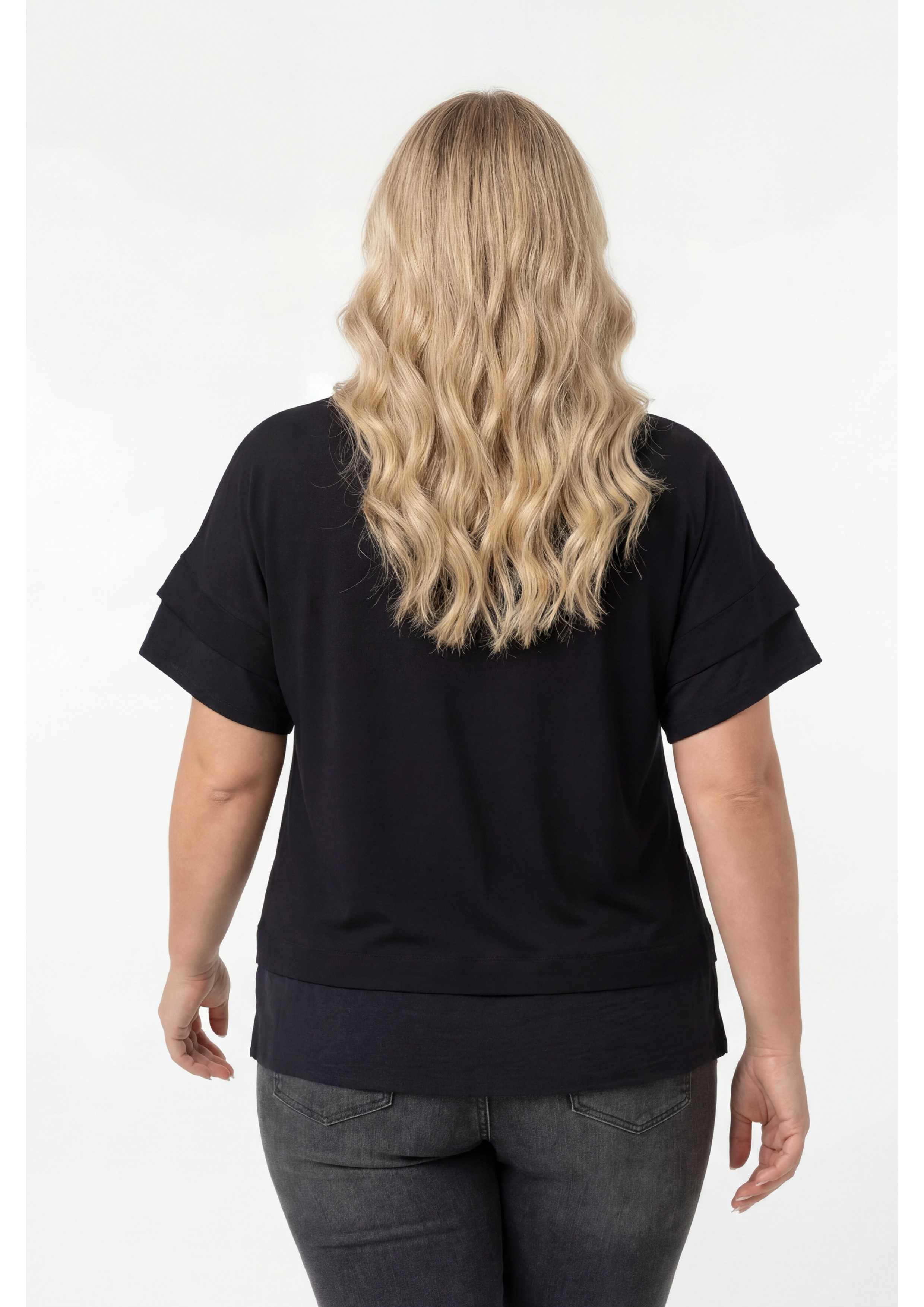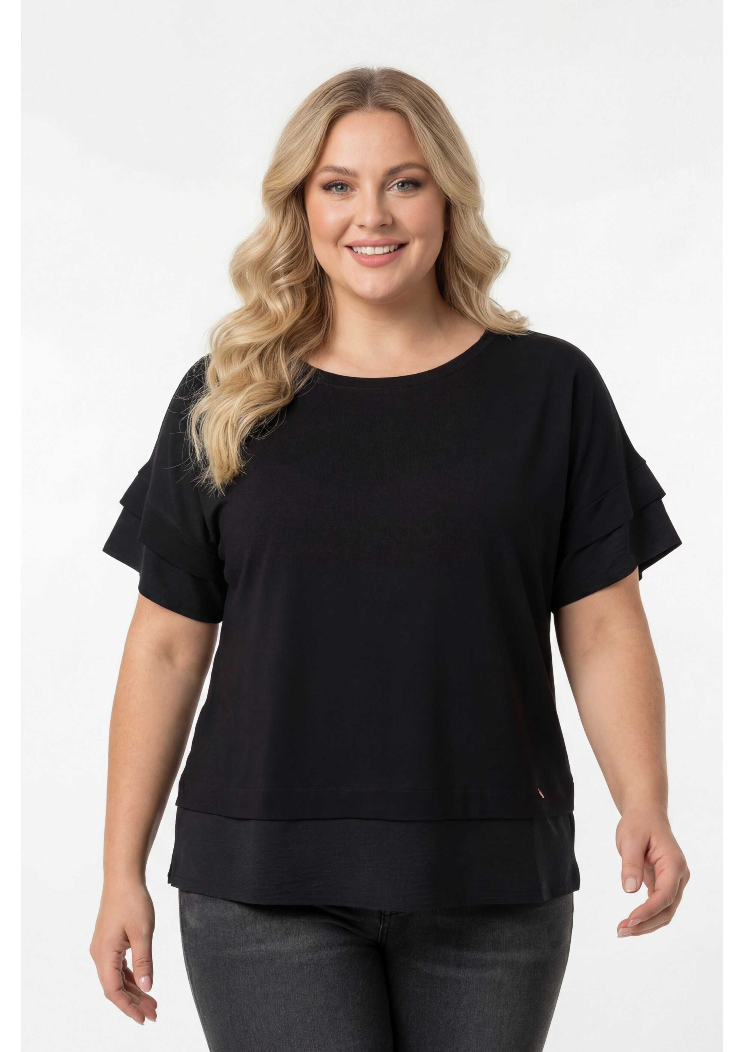 Túnica em malha lisa, encaixe manga e base em tecido liso. Decote redondo, manga curta e rachas laterais. |