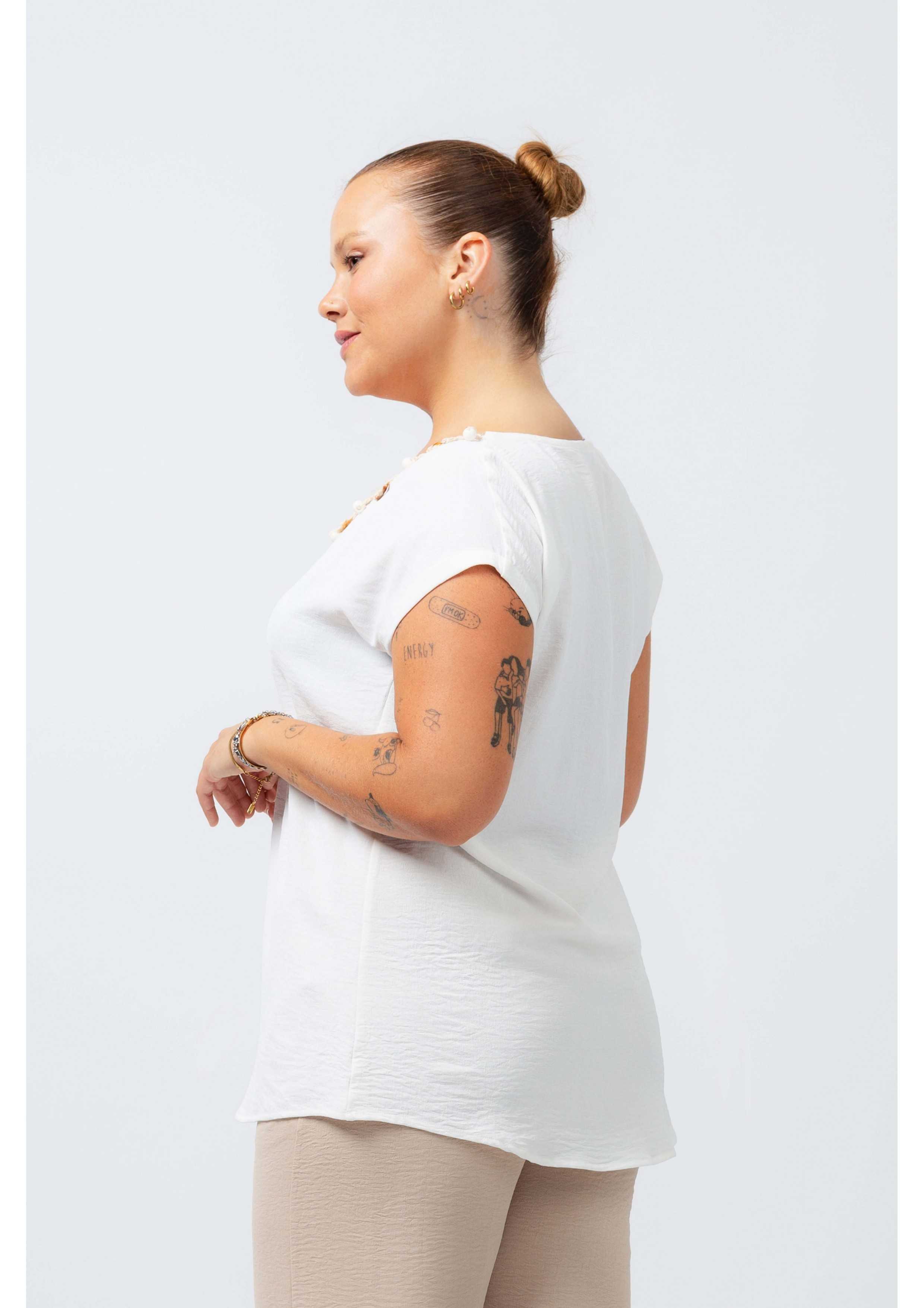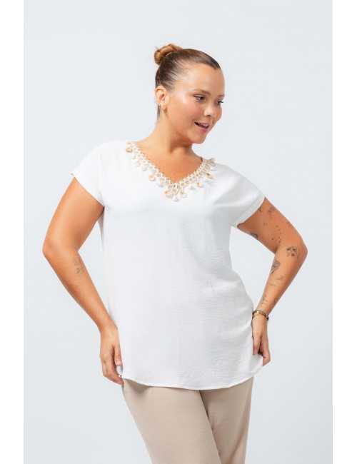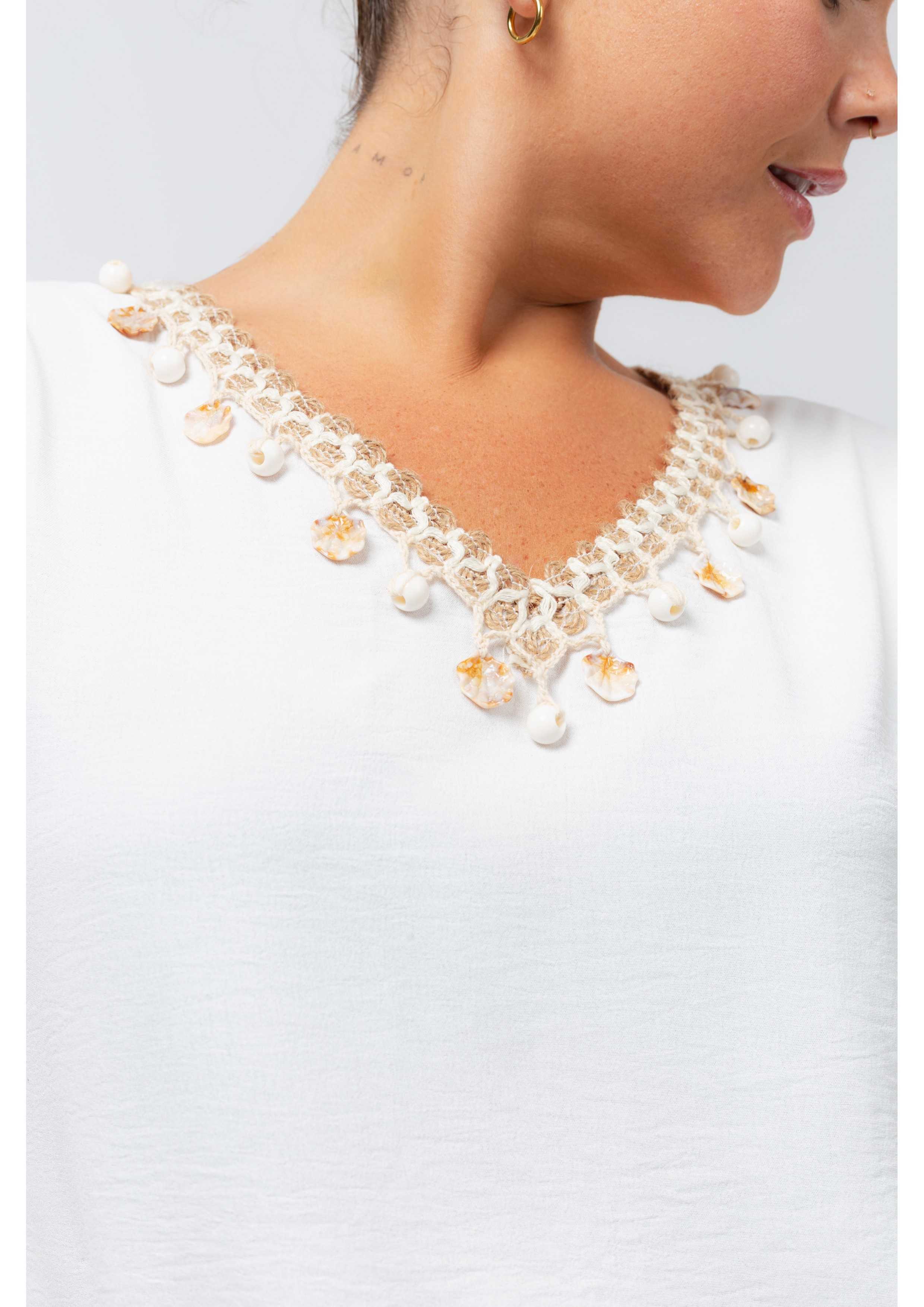 Túnica em tecido liso, ombros largos. Decote em bico com aplicação de franja motivos de praia. Modelo: Altura 1.70m e está a vestir o tamanho XL. |