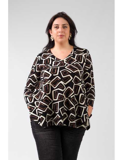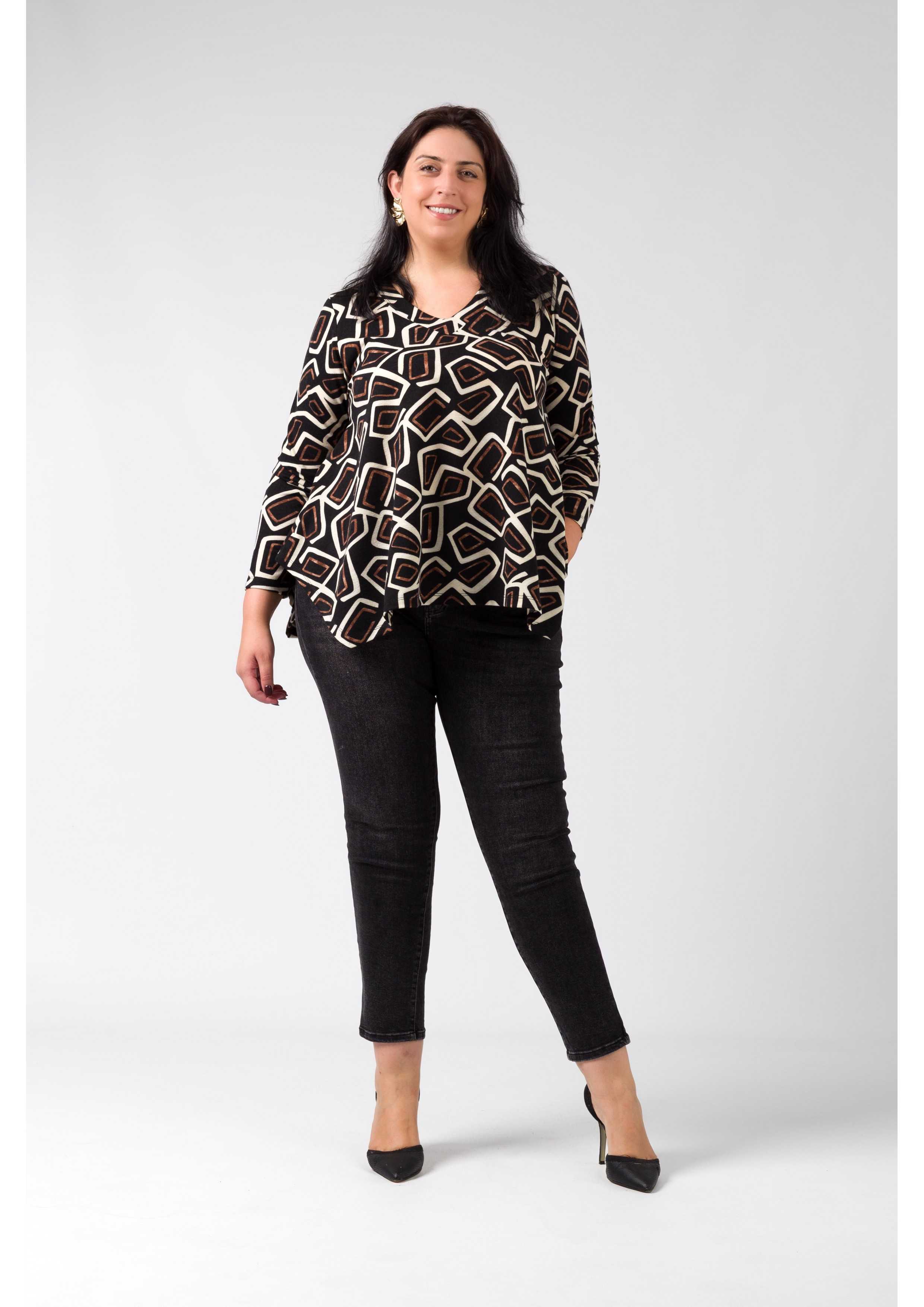 Túnica em malha estampada, tons pretos, decote em bico com gola na frente. Manga comprida, modelo evasé com bicos na base. Disponível em Tamanhos Grandes Produto de desenho e fabrico próprio. Somos uma marca de confeção de vestuário com mais de 50 anos de experiência Modelo: Altura 1.73m e está a vestir o tamanho 3XL.