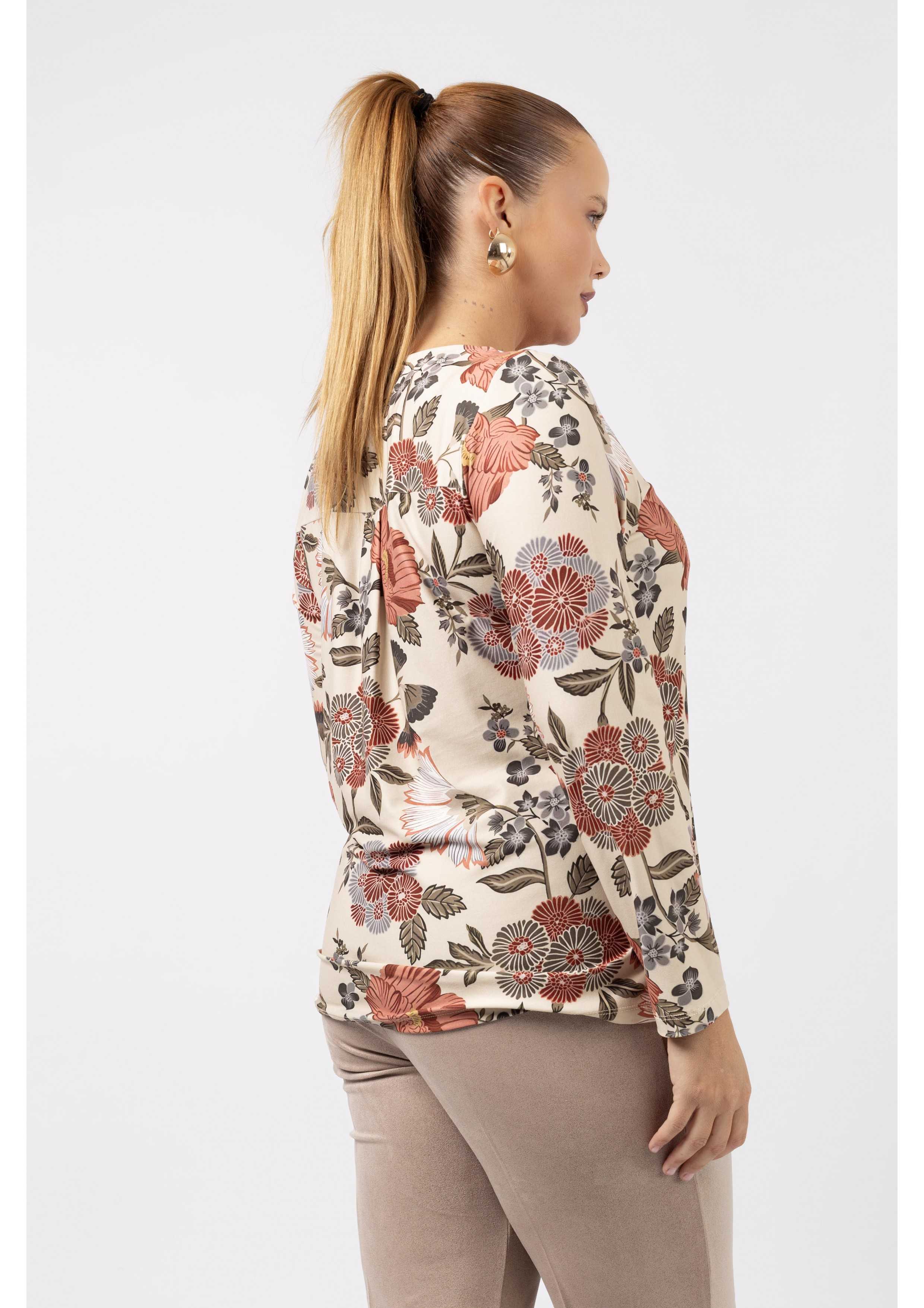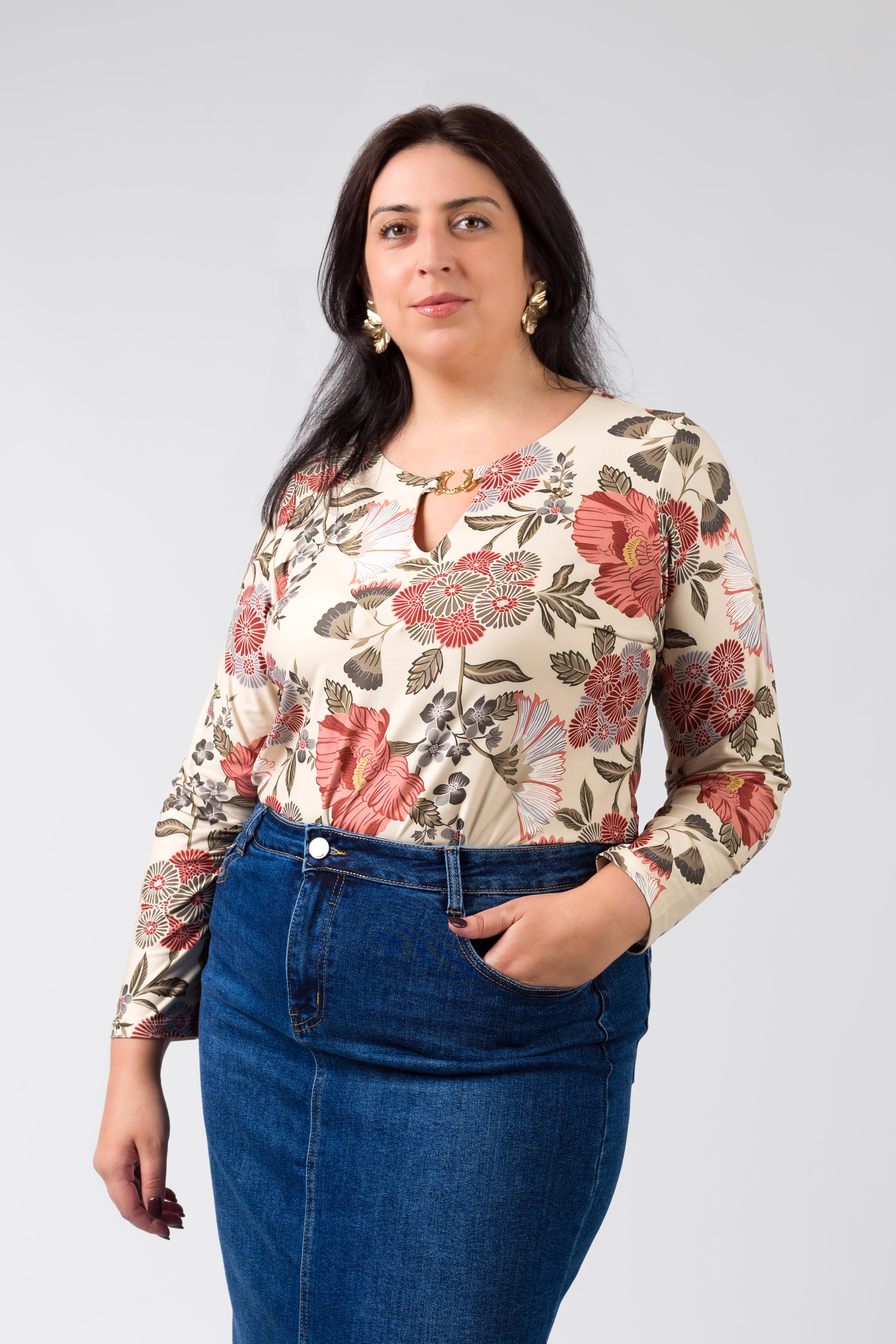 Túnica em malha estampada, manga comprida, decote redondo com aplicação metálica em forma de ferradura. Disponível em Tamanhos Grandes Produto de desenho e fabrico próprio. Somos uma marca de confeção de vestuário com mais de 50 anos de experiência Modelo: Altura 1.73m e está a vestir o tamanho 3XL.