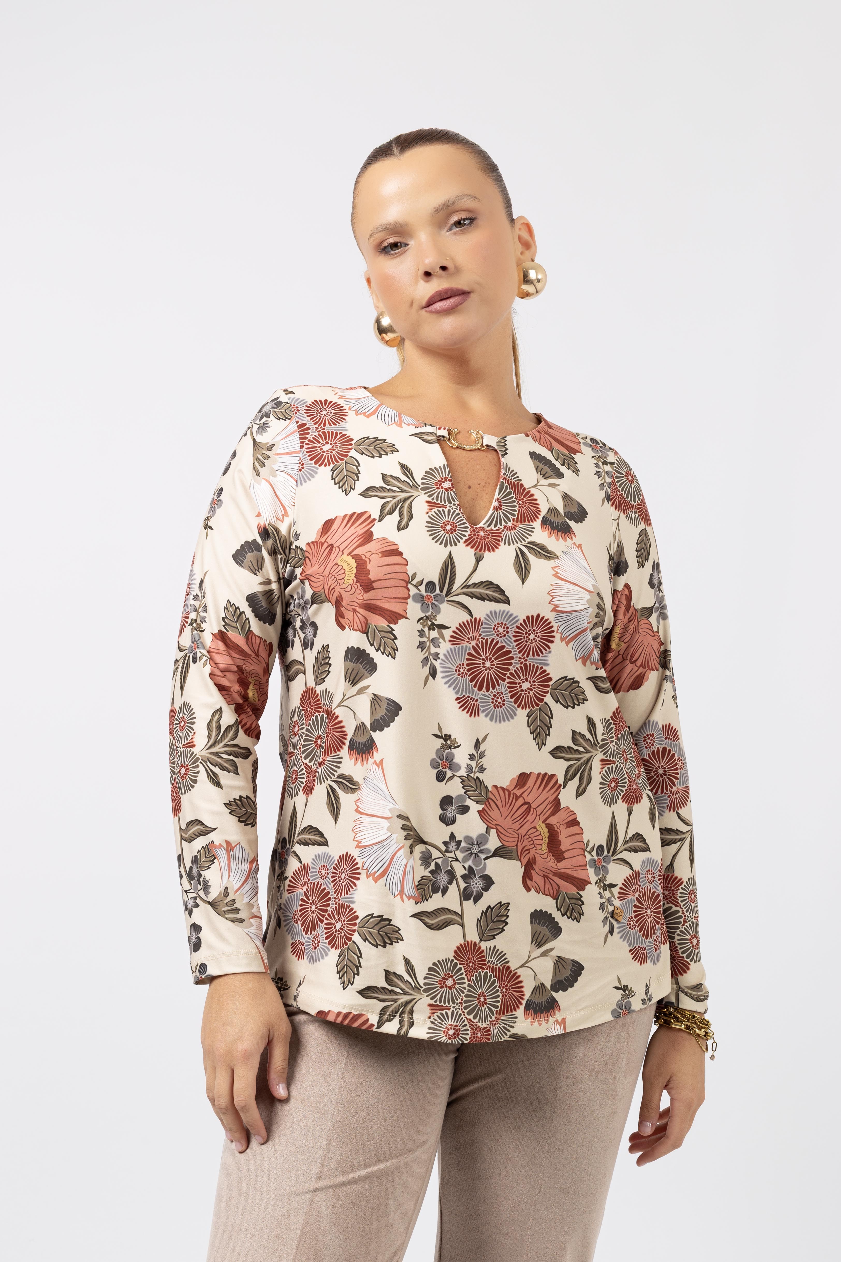Túnica em malha estampada, manga comprida, decote redondo com aplicação metálica em forma de ferradura.