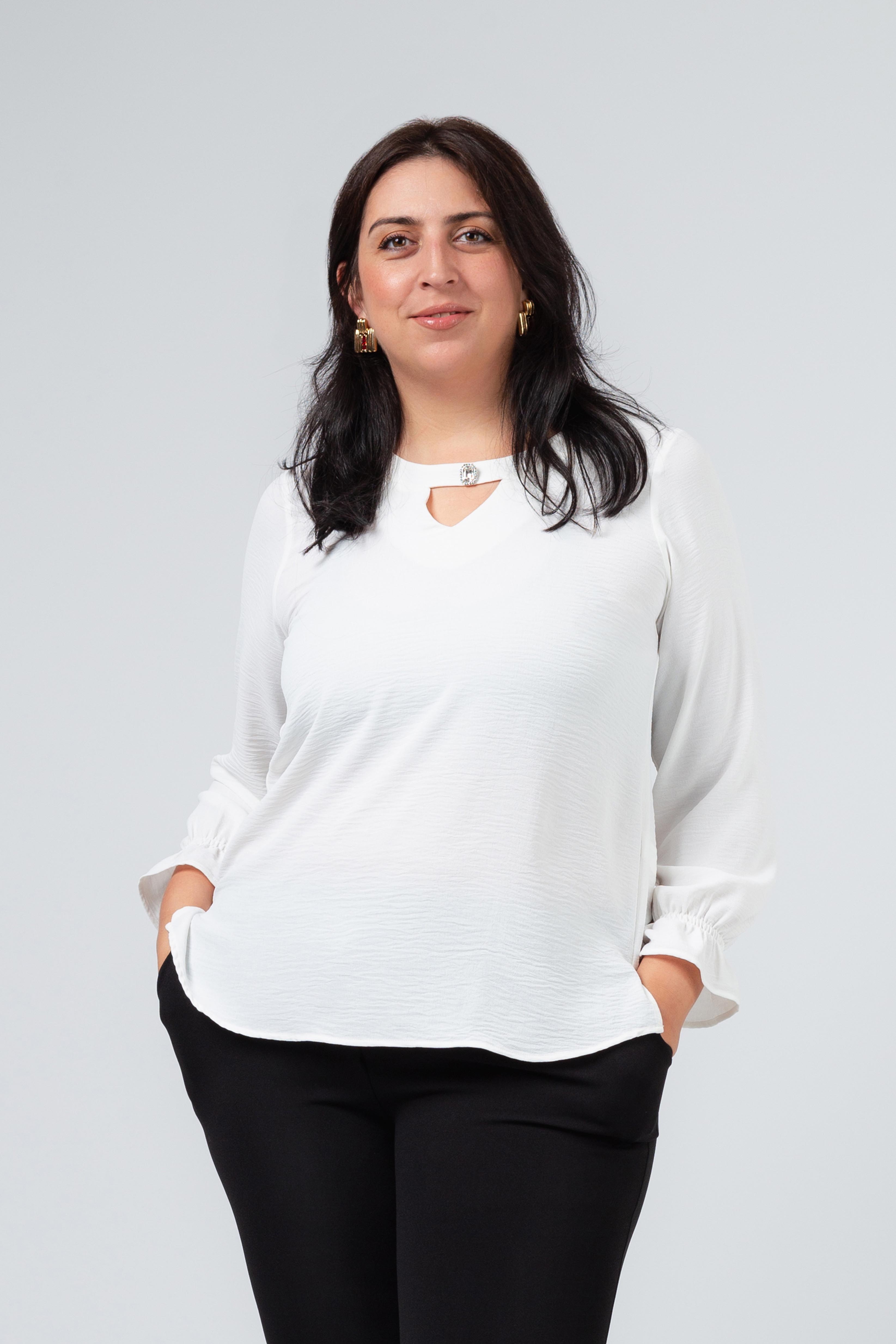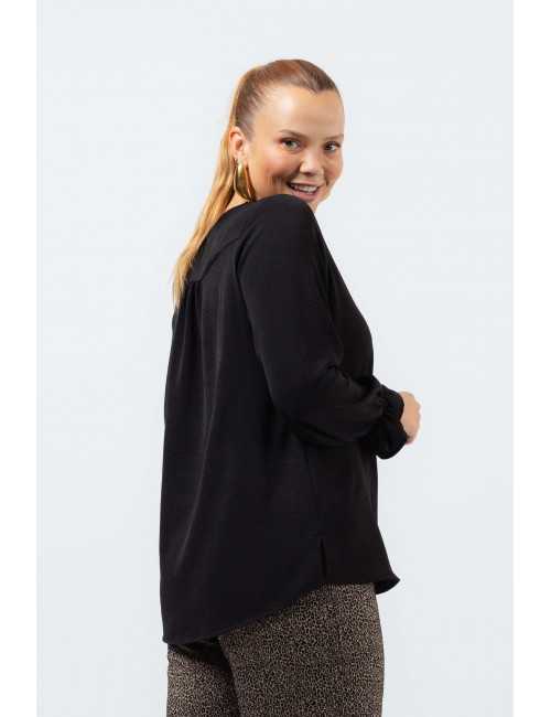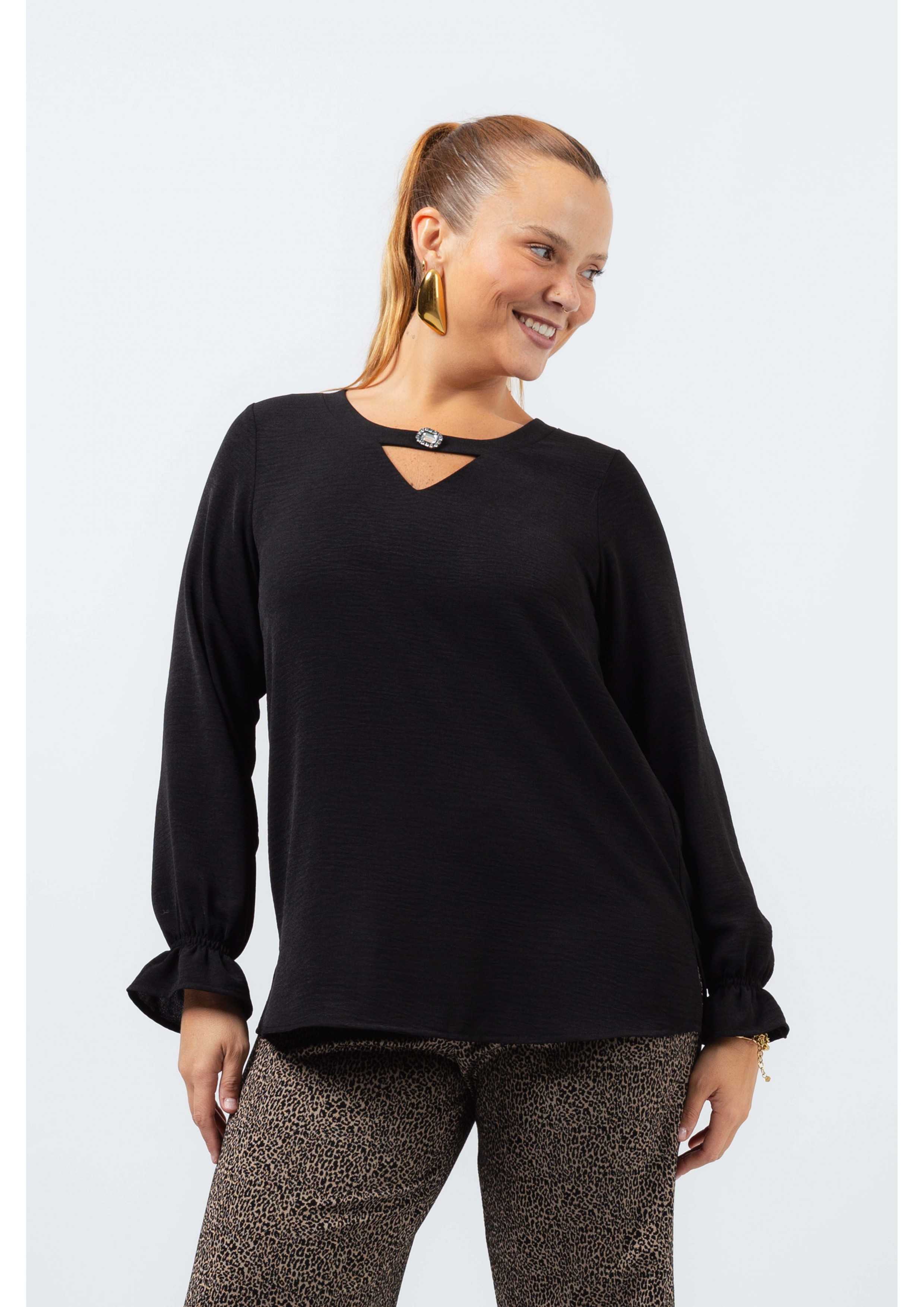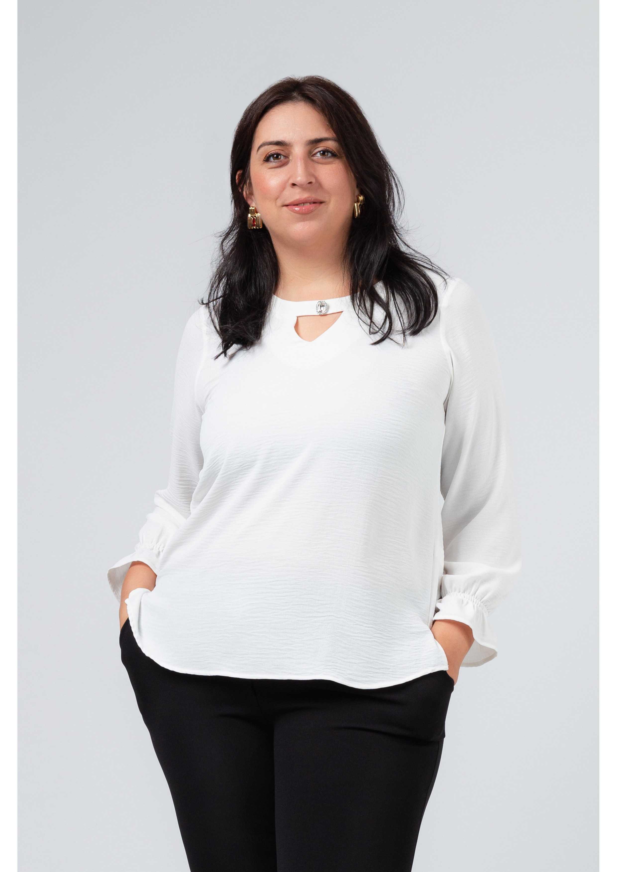 Túnica em tecido liso, manga comprida com elástico. Decote redondo com tira efeito 1/2 gola trespasse c/ botão.