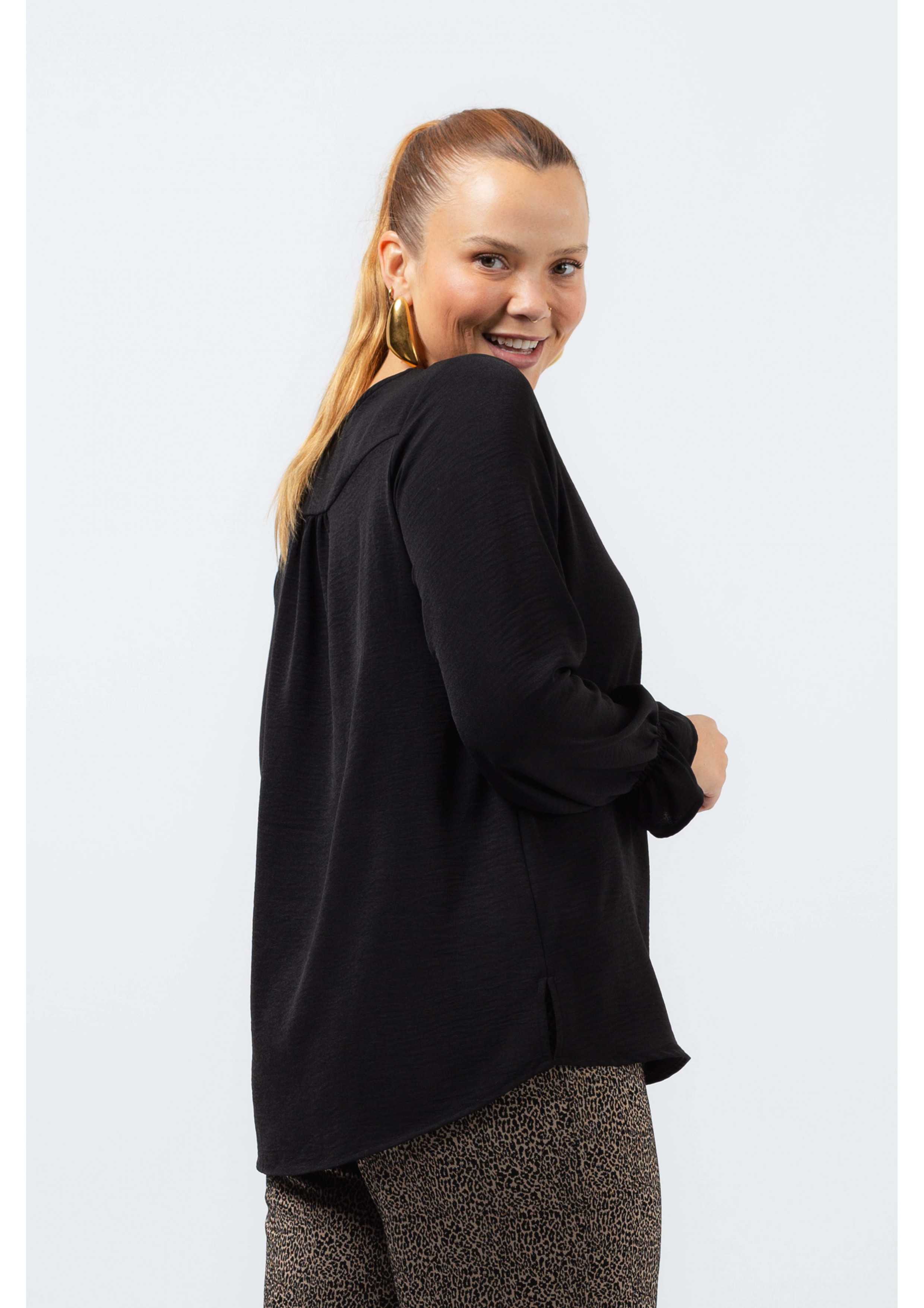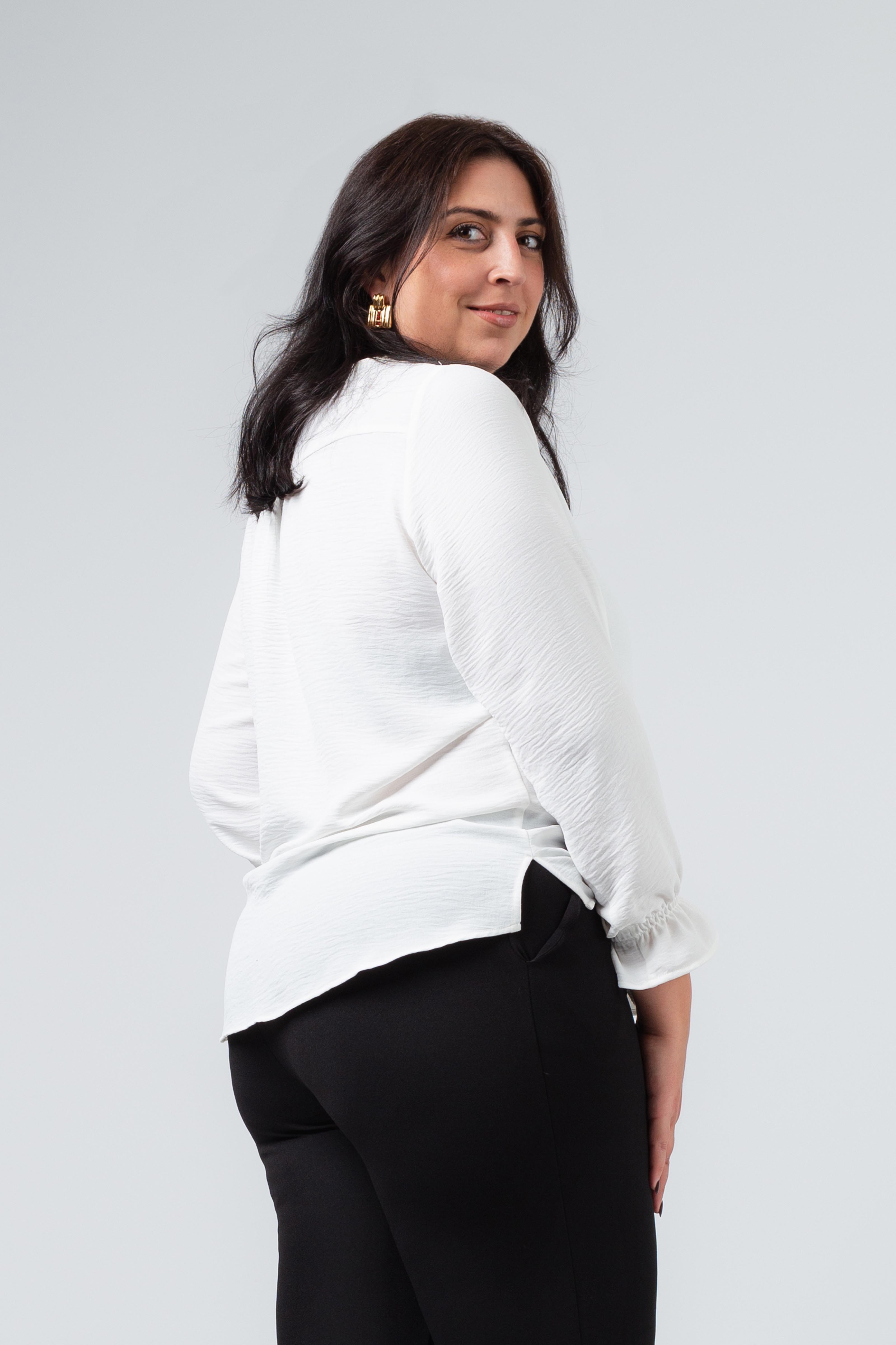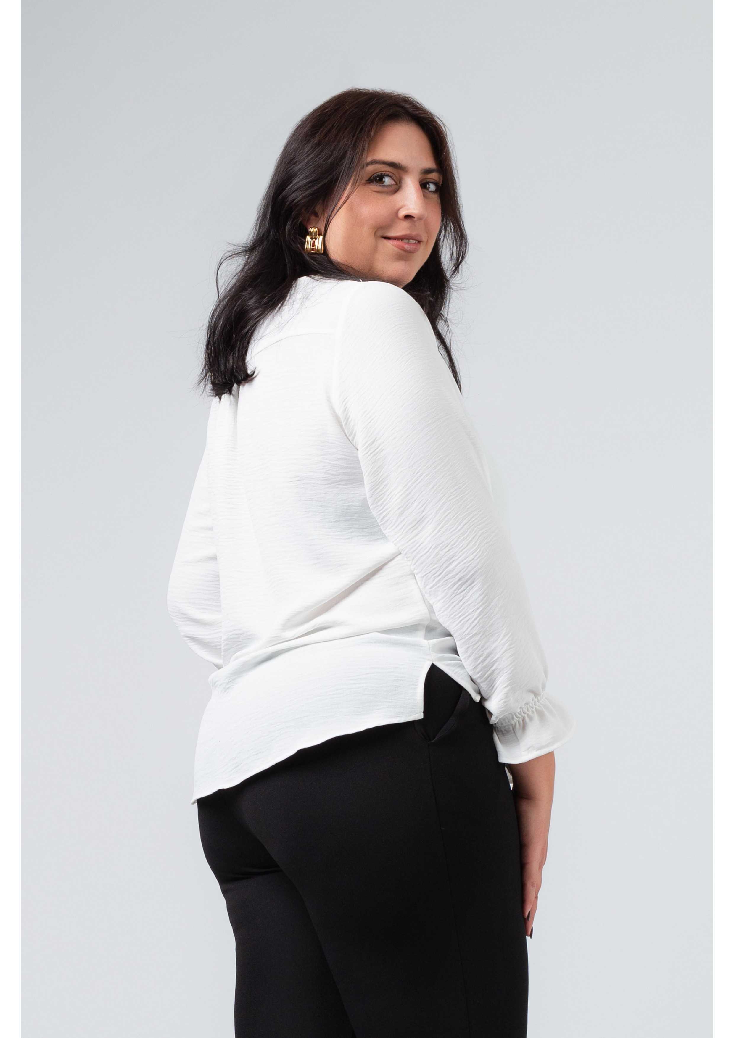 Túnica em tecido liso, manga comprida com elástico. Decote redondo com tira efeito 1/2 gola trespasse c/ botão.