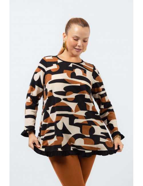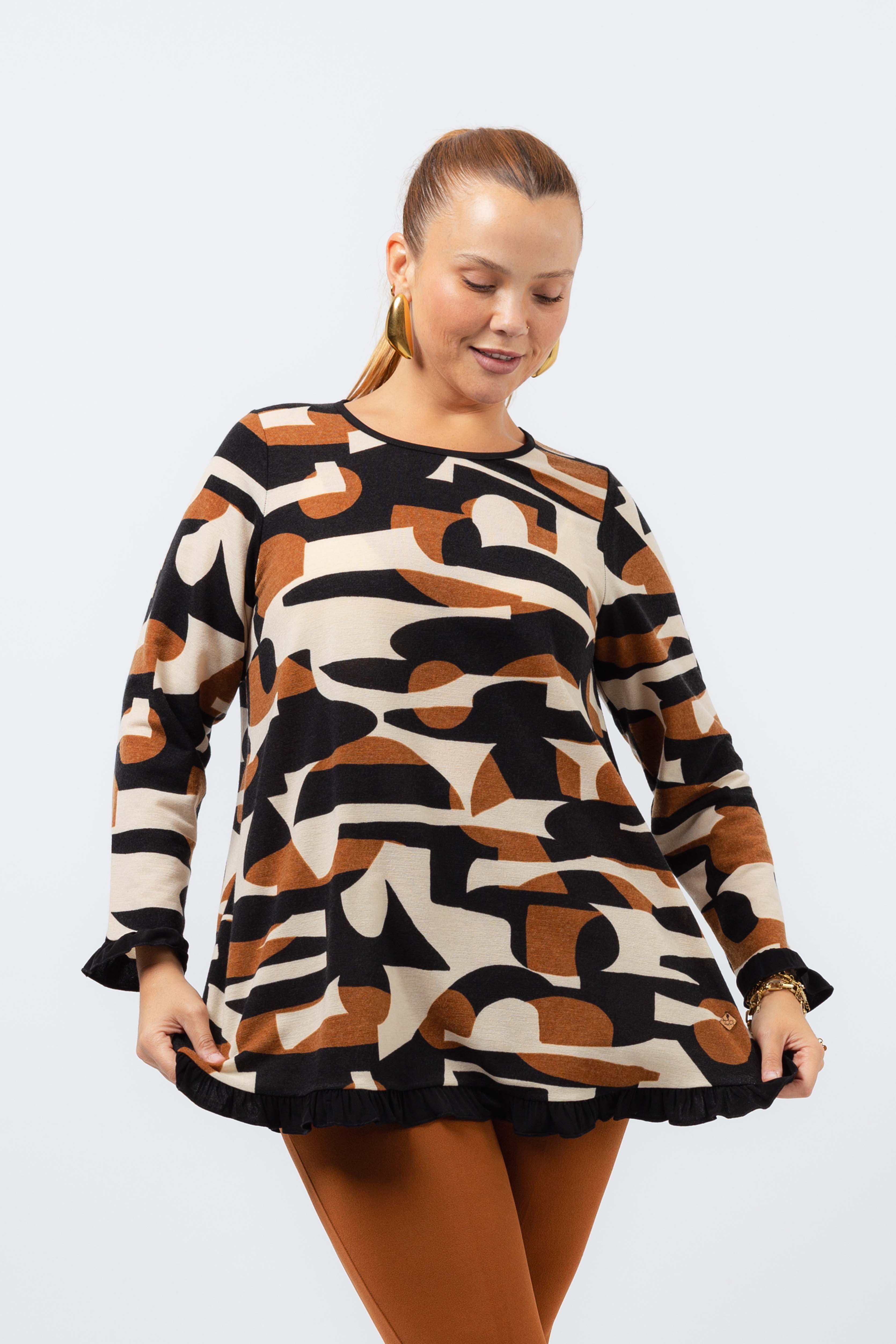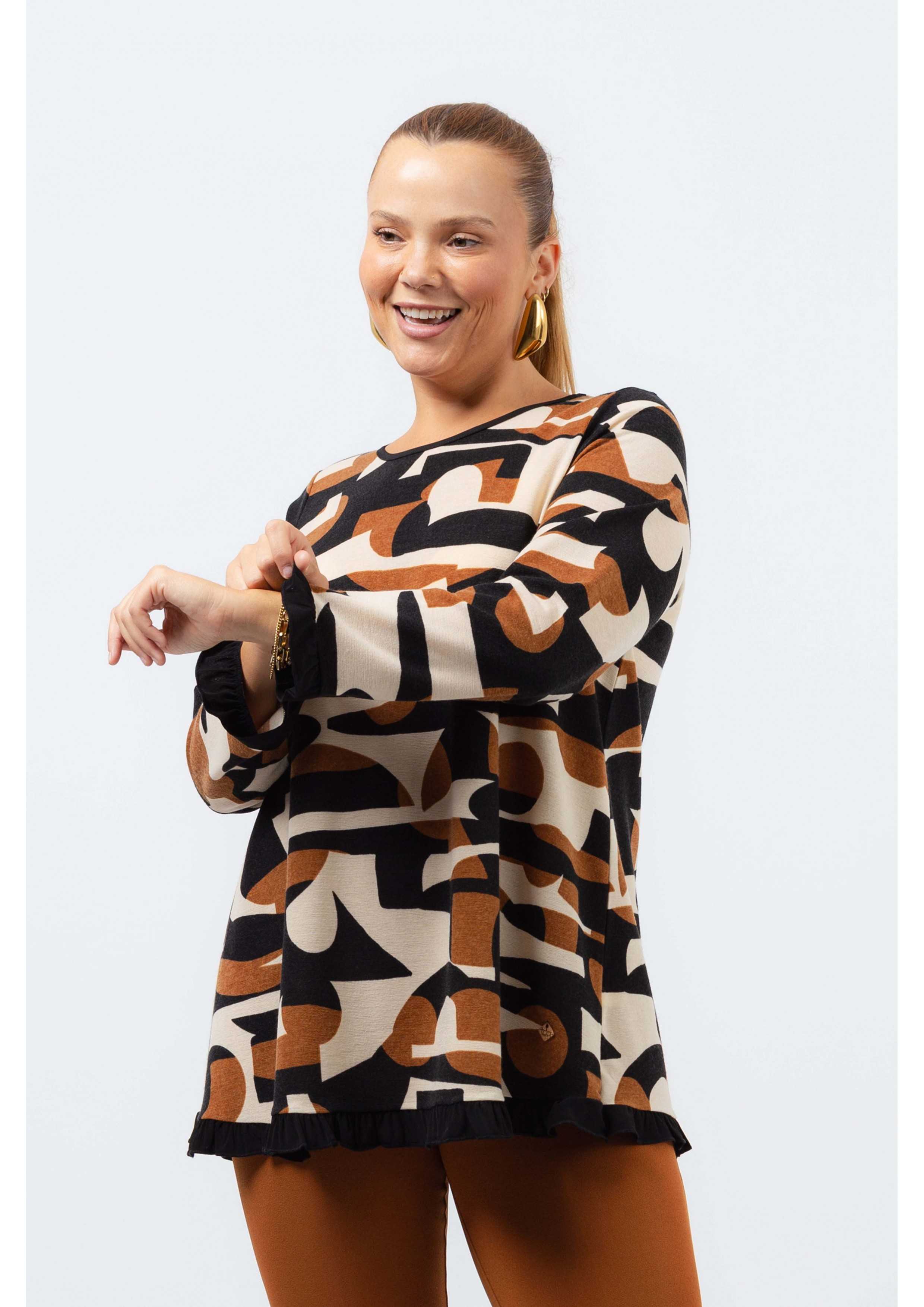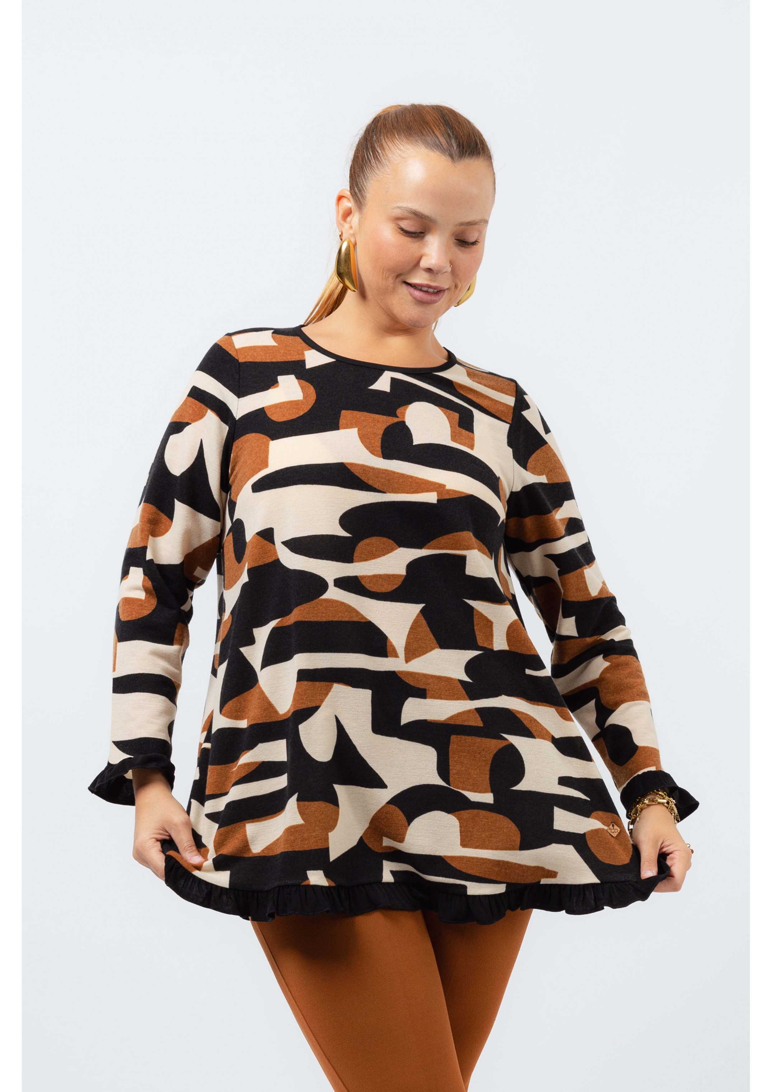 Túnica em malha estampada vários tons, manga comprida decote redondo. Folho liso nas mangas e na base.