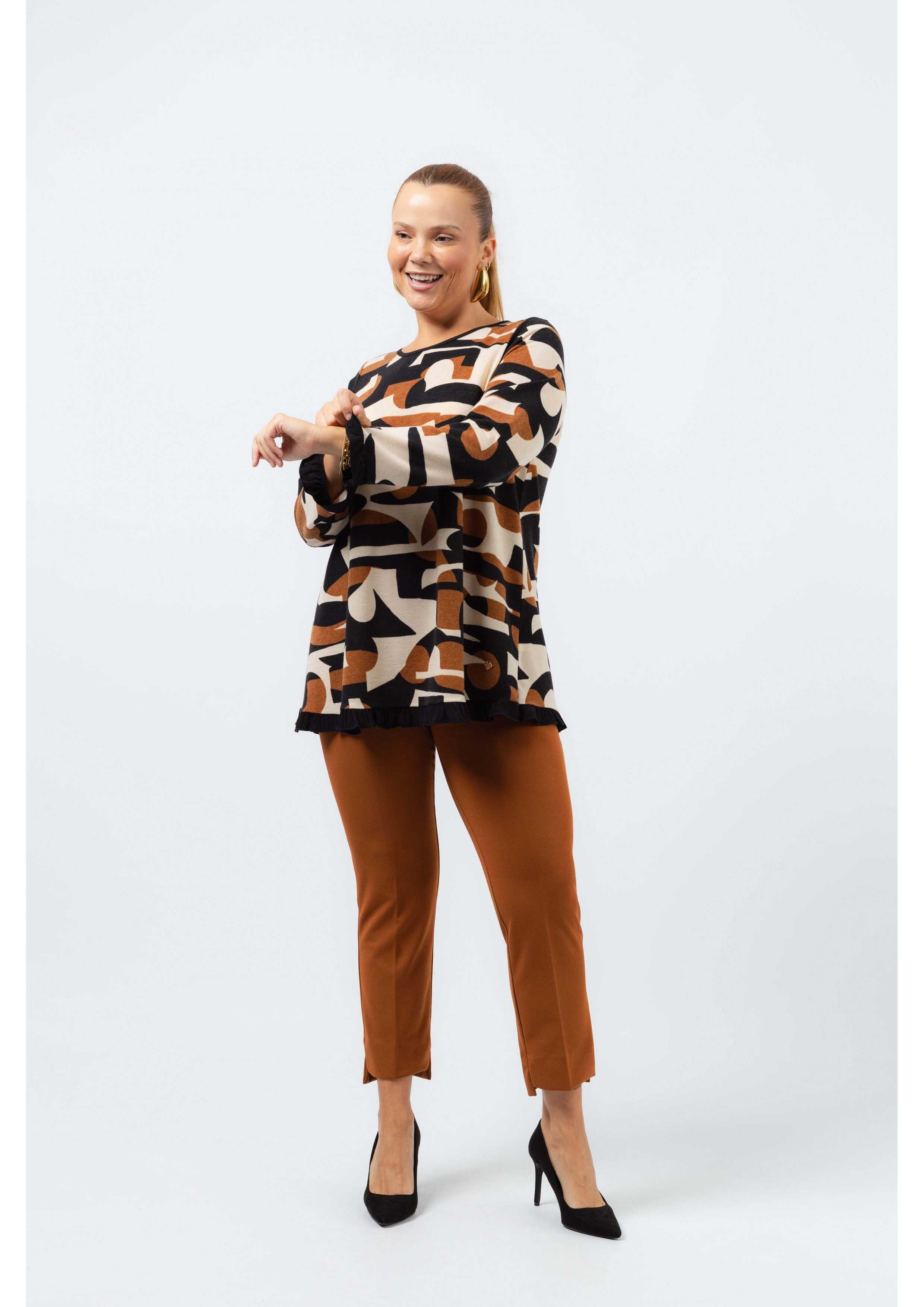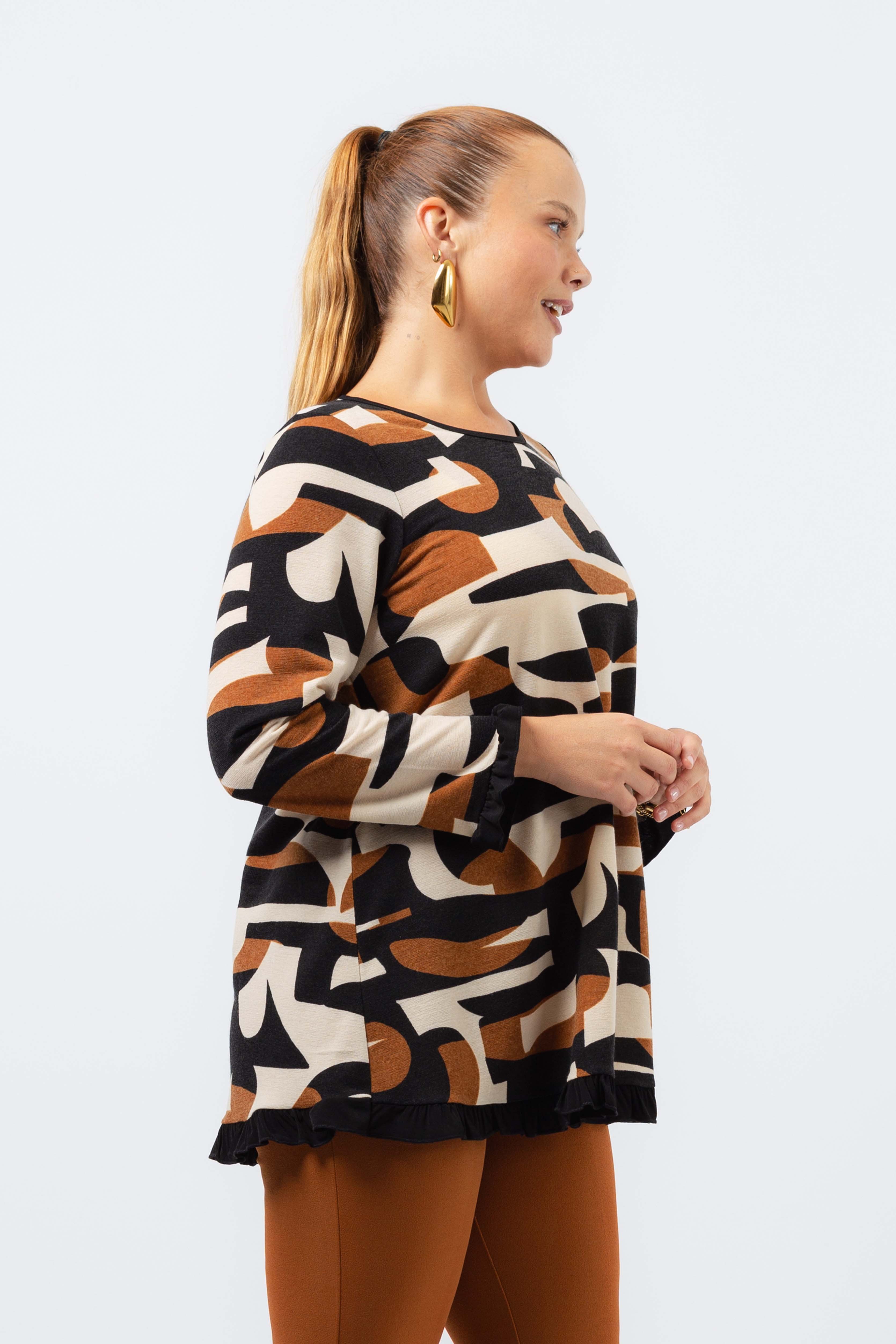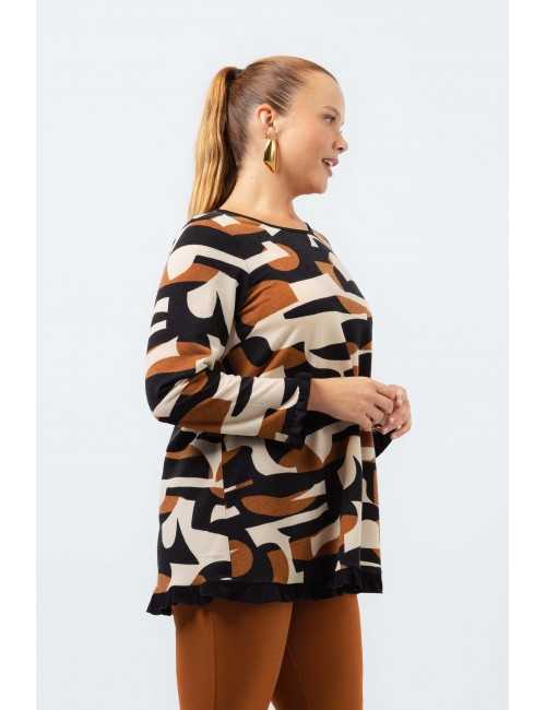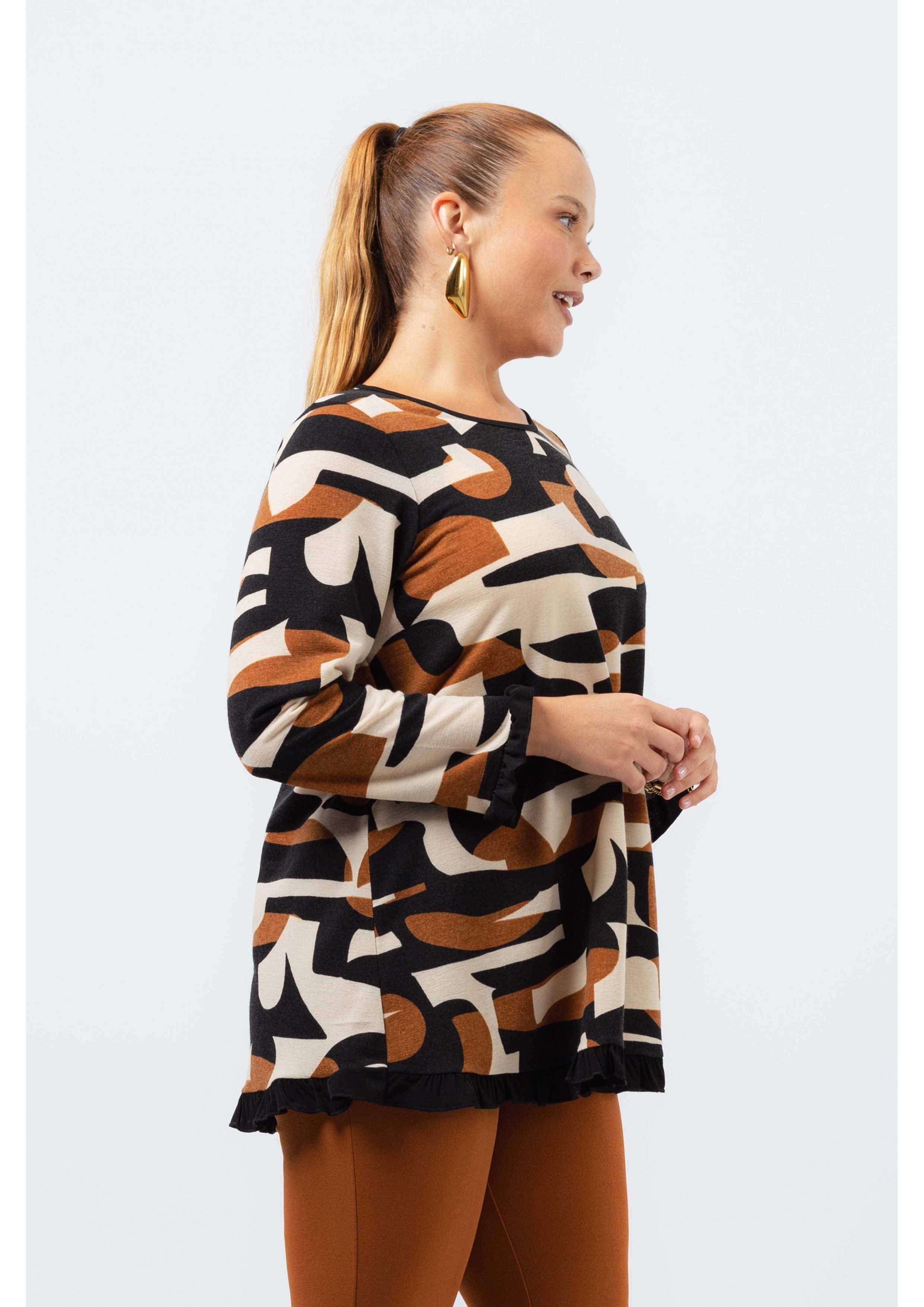 Túnica em malha estampada vários tons, manga comprida decote redondo. Folho liso nas mangas e na base.