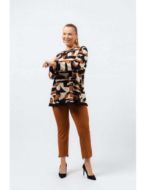 Túnica em malha estampada vários tons, manga comprida decote redondo. Folho liso nas mangas e na base. Disponível em Tamanhos Grandes Produto de desenho e fabrico próprio. Somos uma marca de confeção de vestuário com mais de 50 anos de experiência Modelo: Altura 1.70m e está a vestir o tamanho XL.