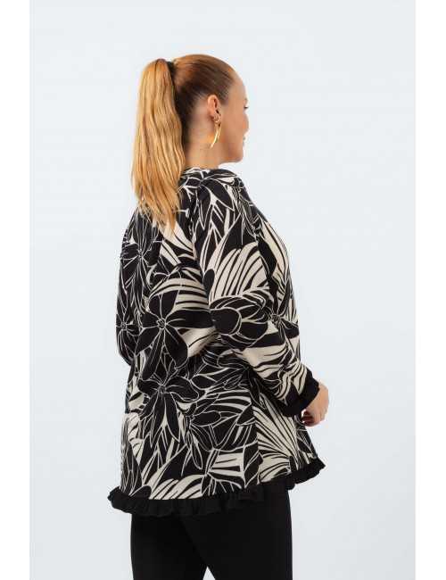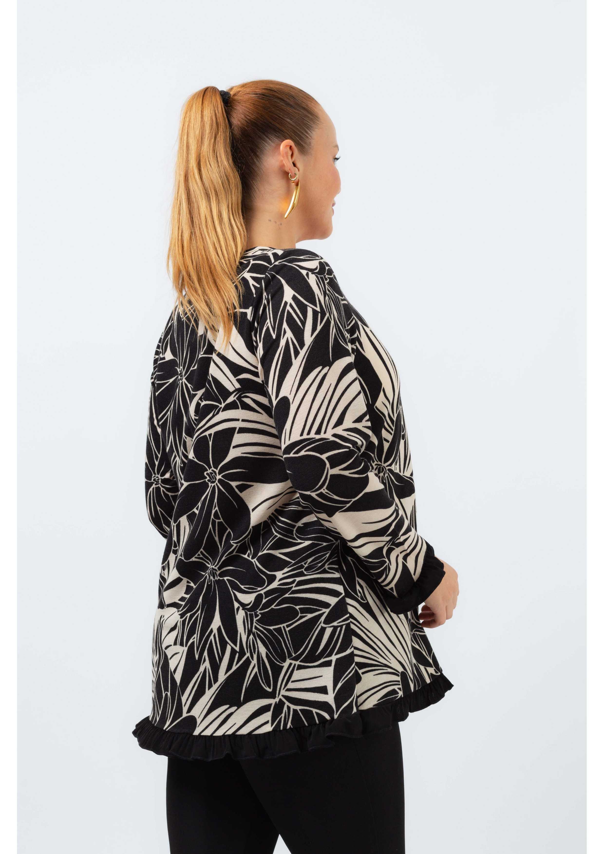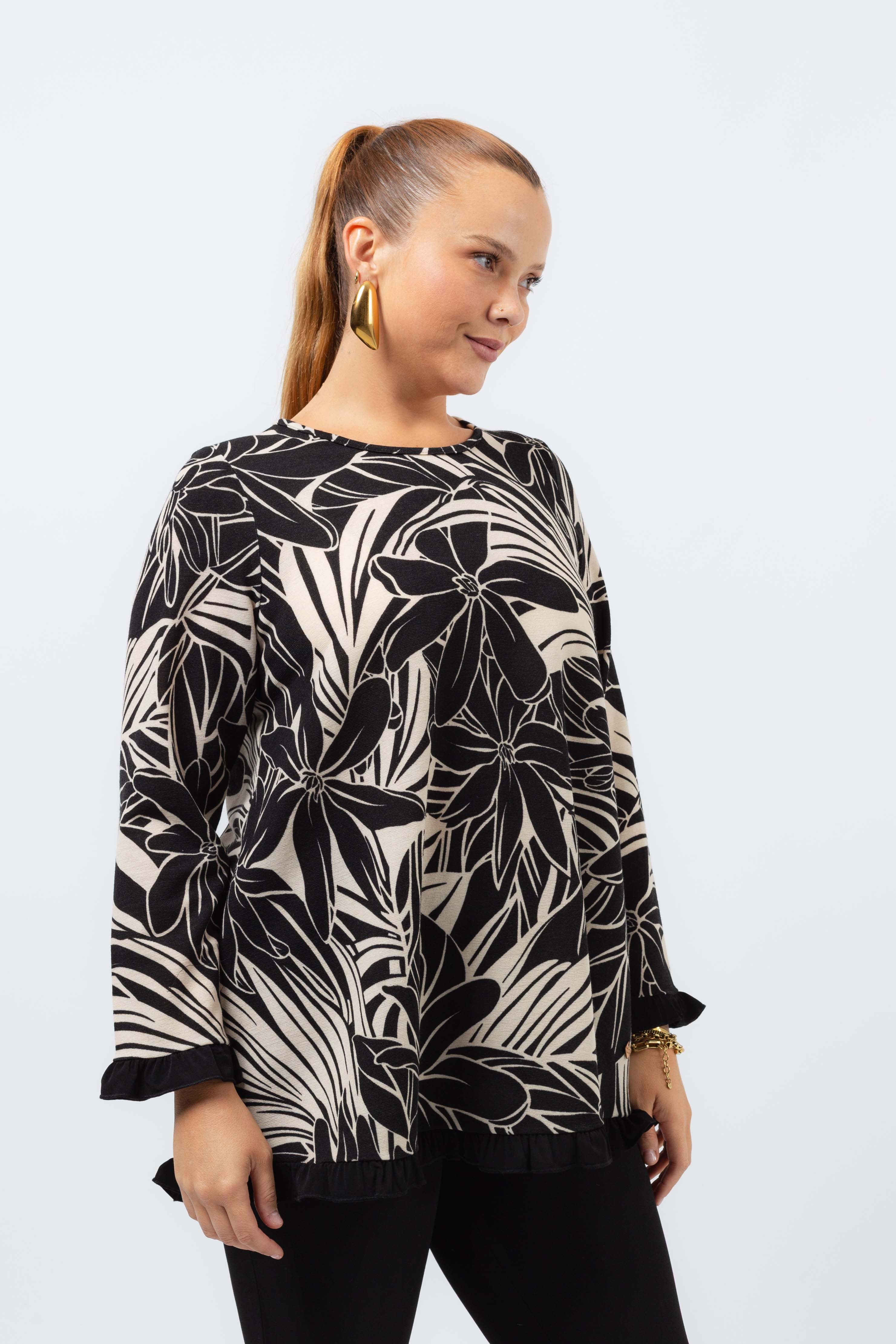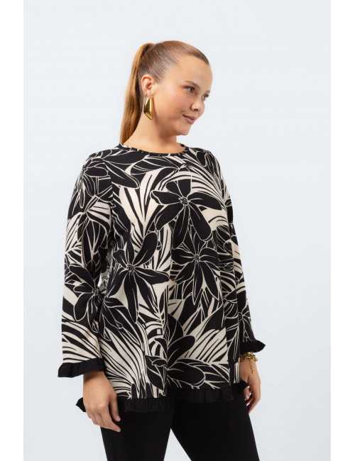 Túnica em malha estampada em preto, manga comprida decote redondo. Folho liso nas mangas e na base. Disponível em Tamanhos Grandes Produto de desenho e fabrico próprio. Somos uma marca de confeção de vestuário com mais de 50 anos de experiência Modelo: Altura 1.70m e está a vestir o tamanho XL.