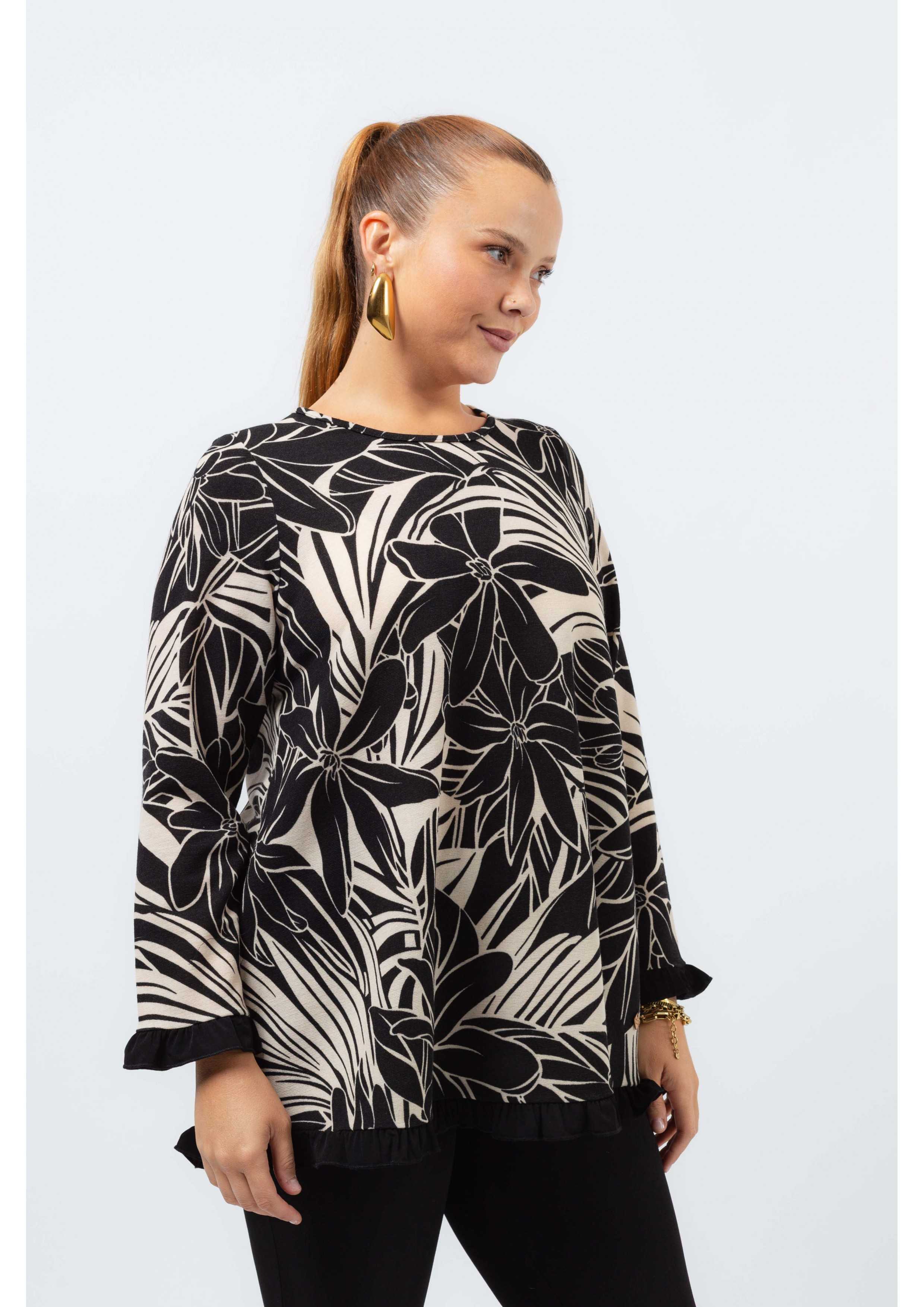 Túnica em malha estampada em preto, manga comprida decote redondo. Folho liso nas mangas e na base.