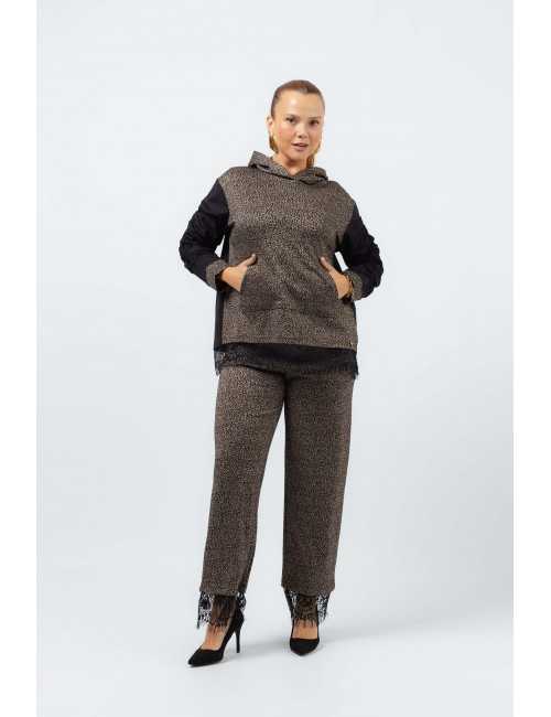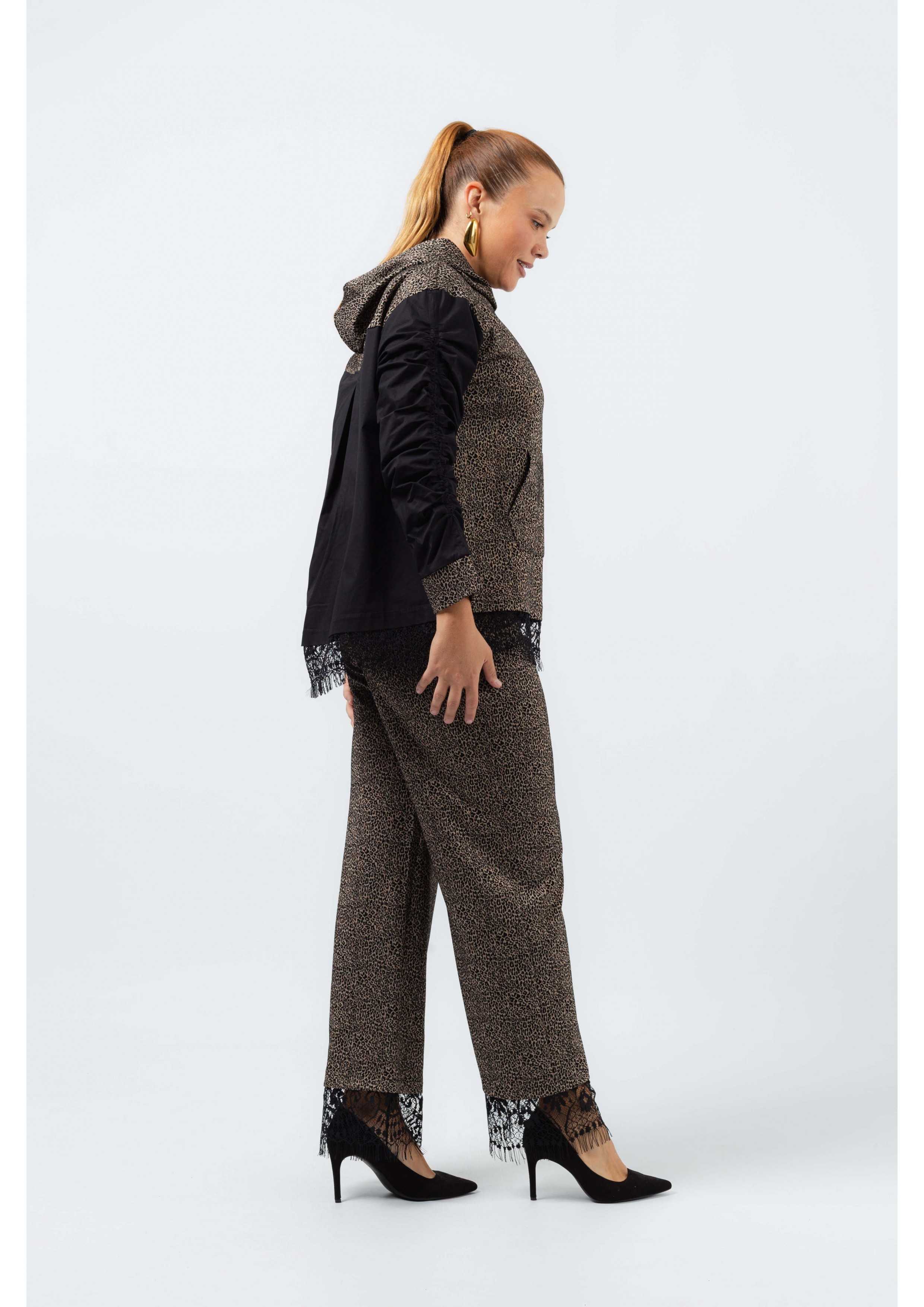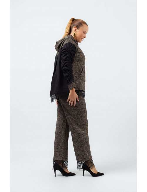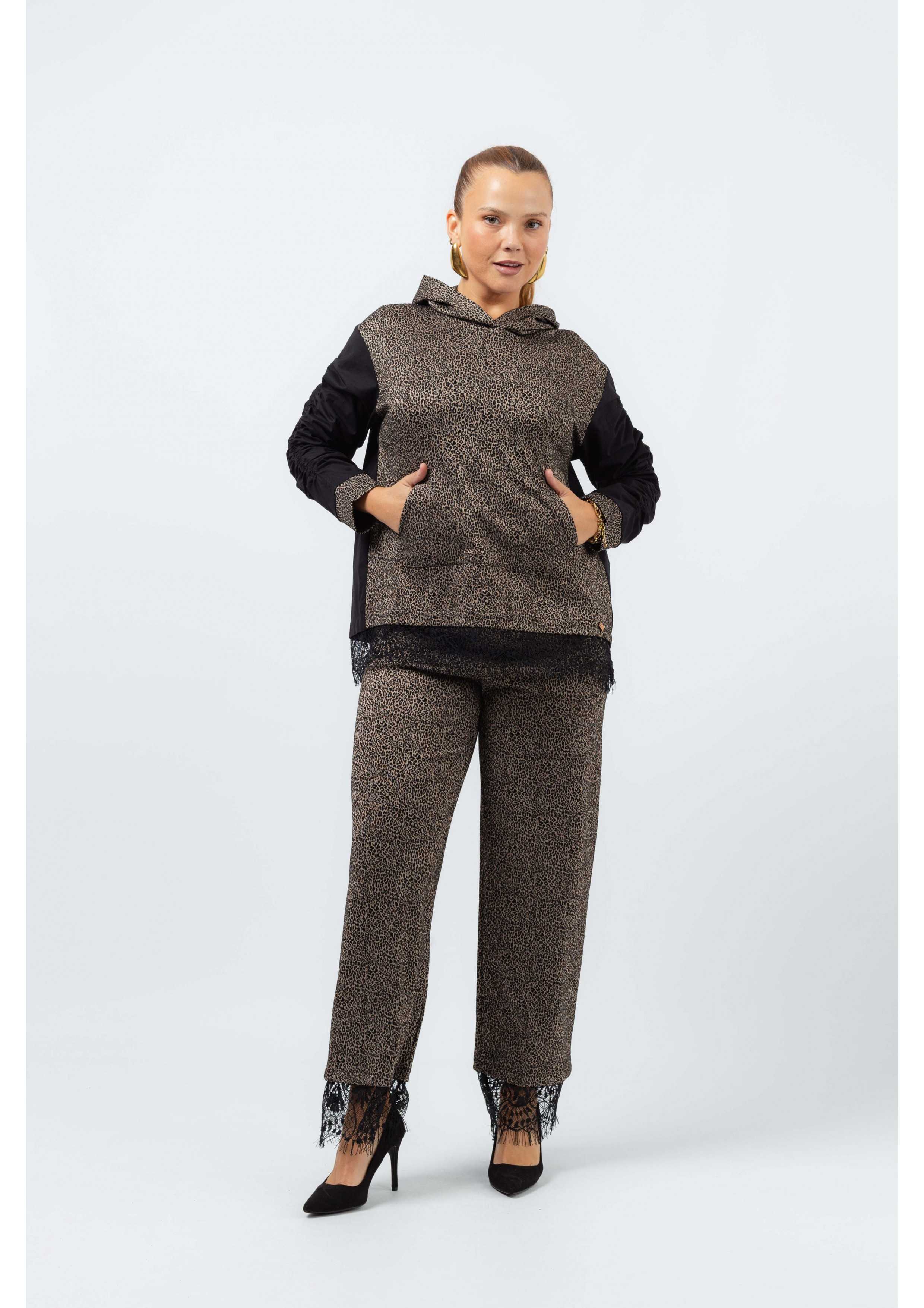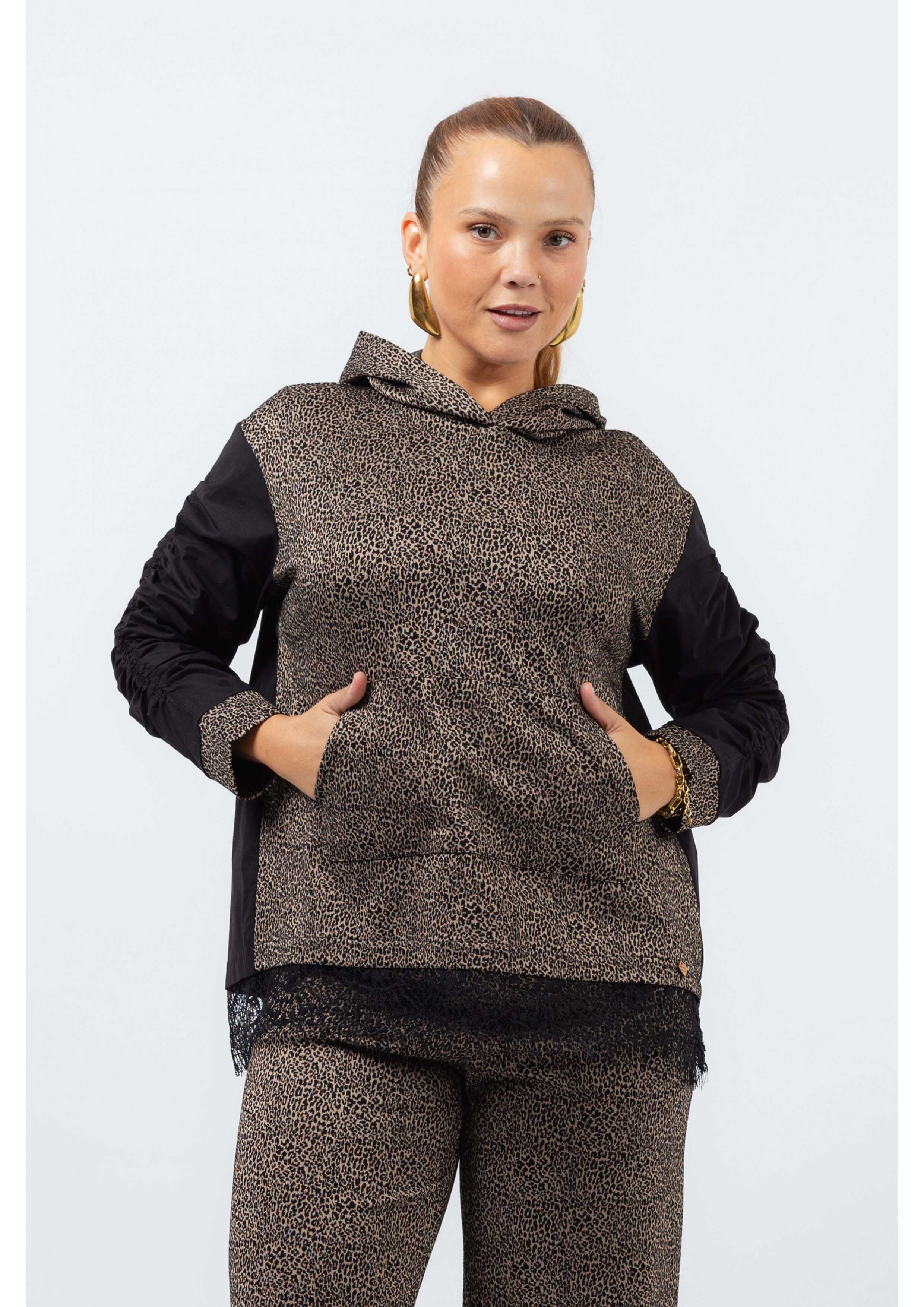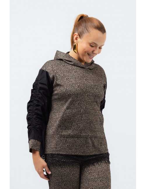 Sweat em malha estampada, capucho e bolsos canguru. Manga comprida toda franzida com punho. Manga e costa em tecido liso tipo corta vento. Renda na base. Disponível em Tamanhos Grandes Produto de desenho e fabrico próprio. Somos uma marca de confeção de vestuário com mais de 50 anos de experiência Modelo: Altura 1.70m e está a vestir o tamanho XL.
