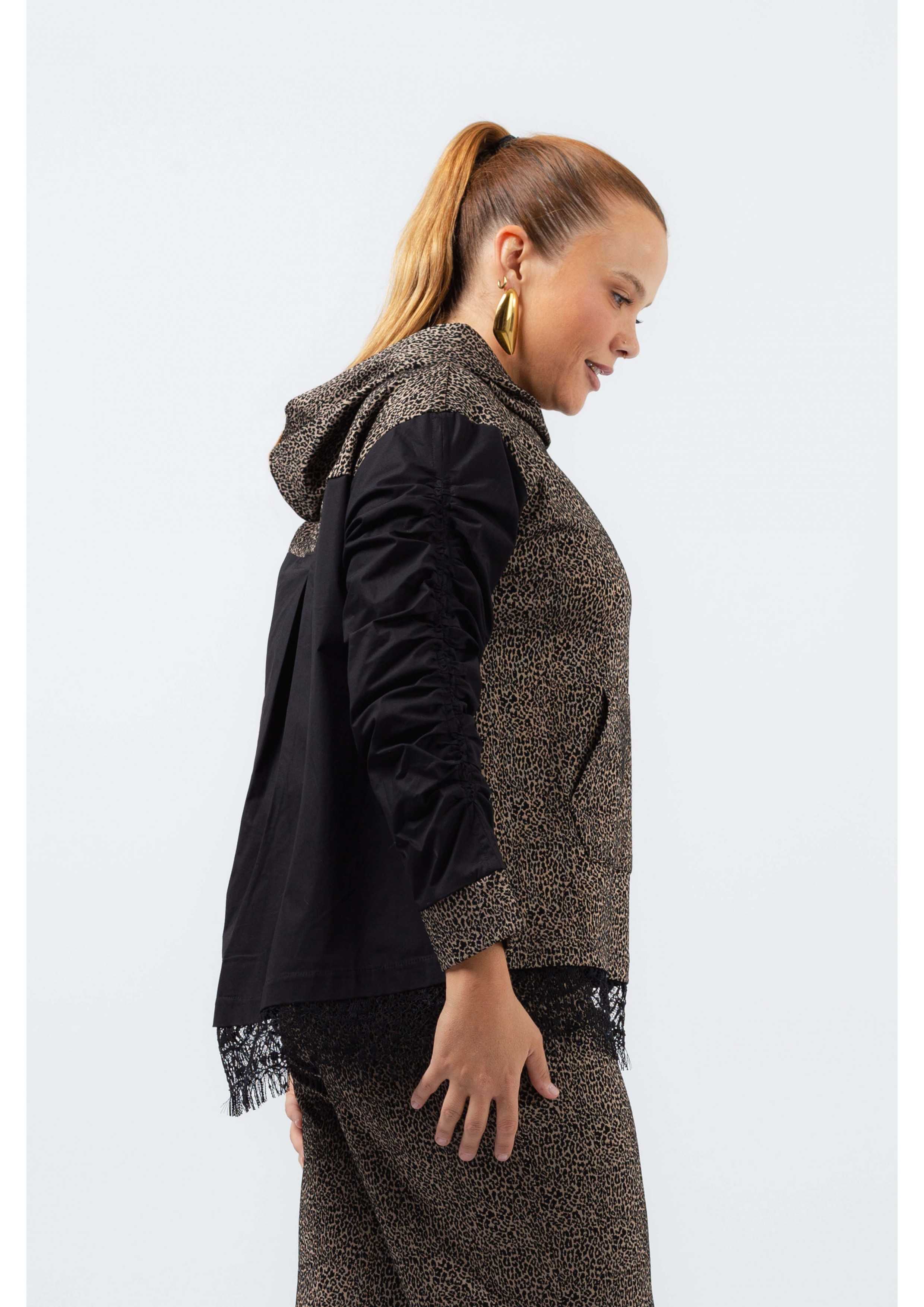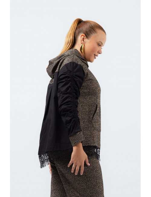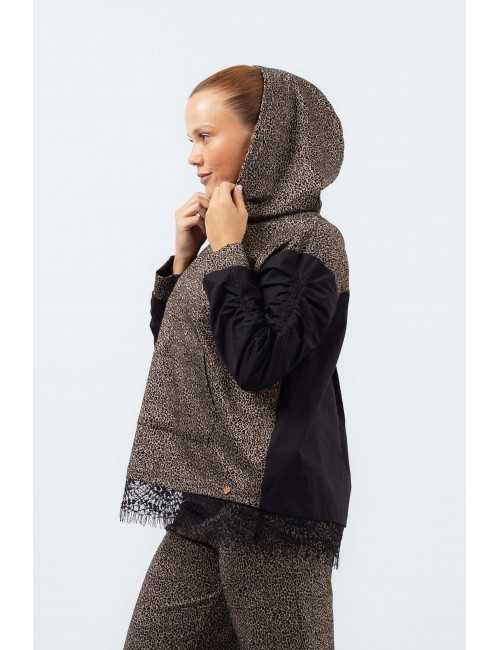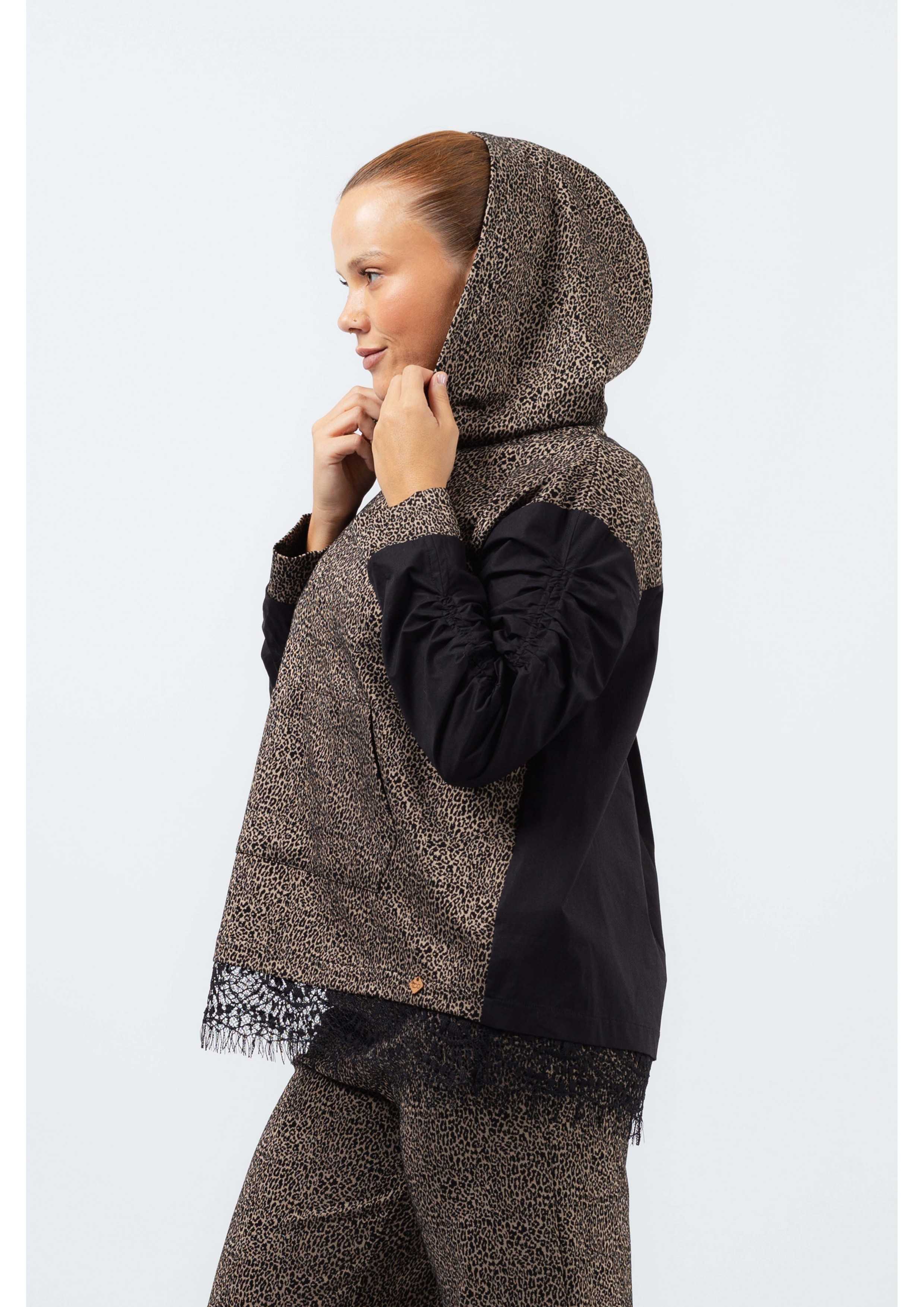 Sweat em malha estampada, capucho e bolsos canguru. Manga comprida toda franzida com punho. Manga e costa em tecido liso tipo corta vento. Renda na base.