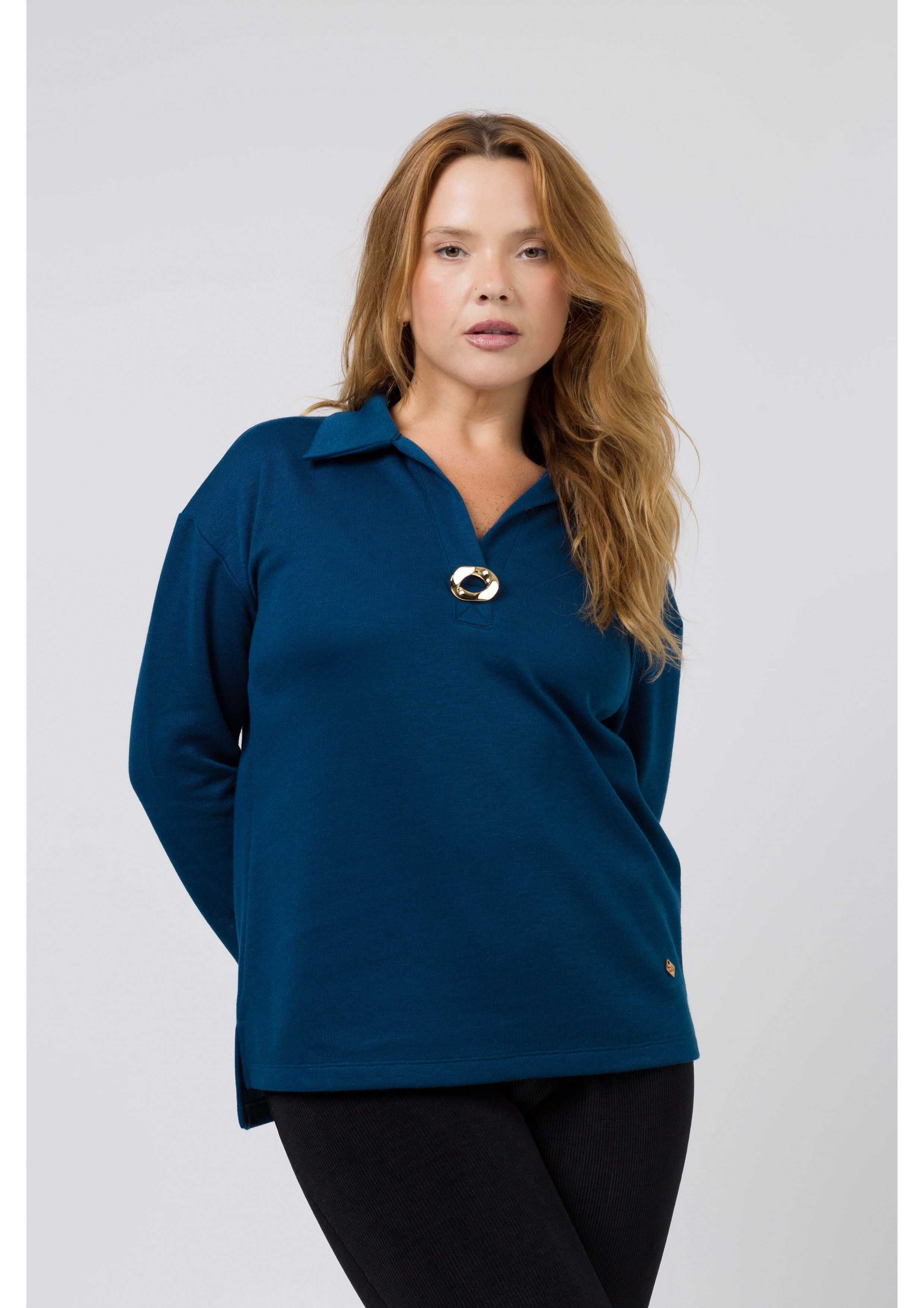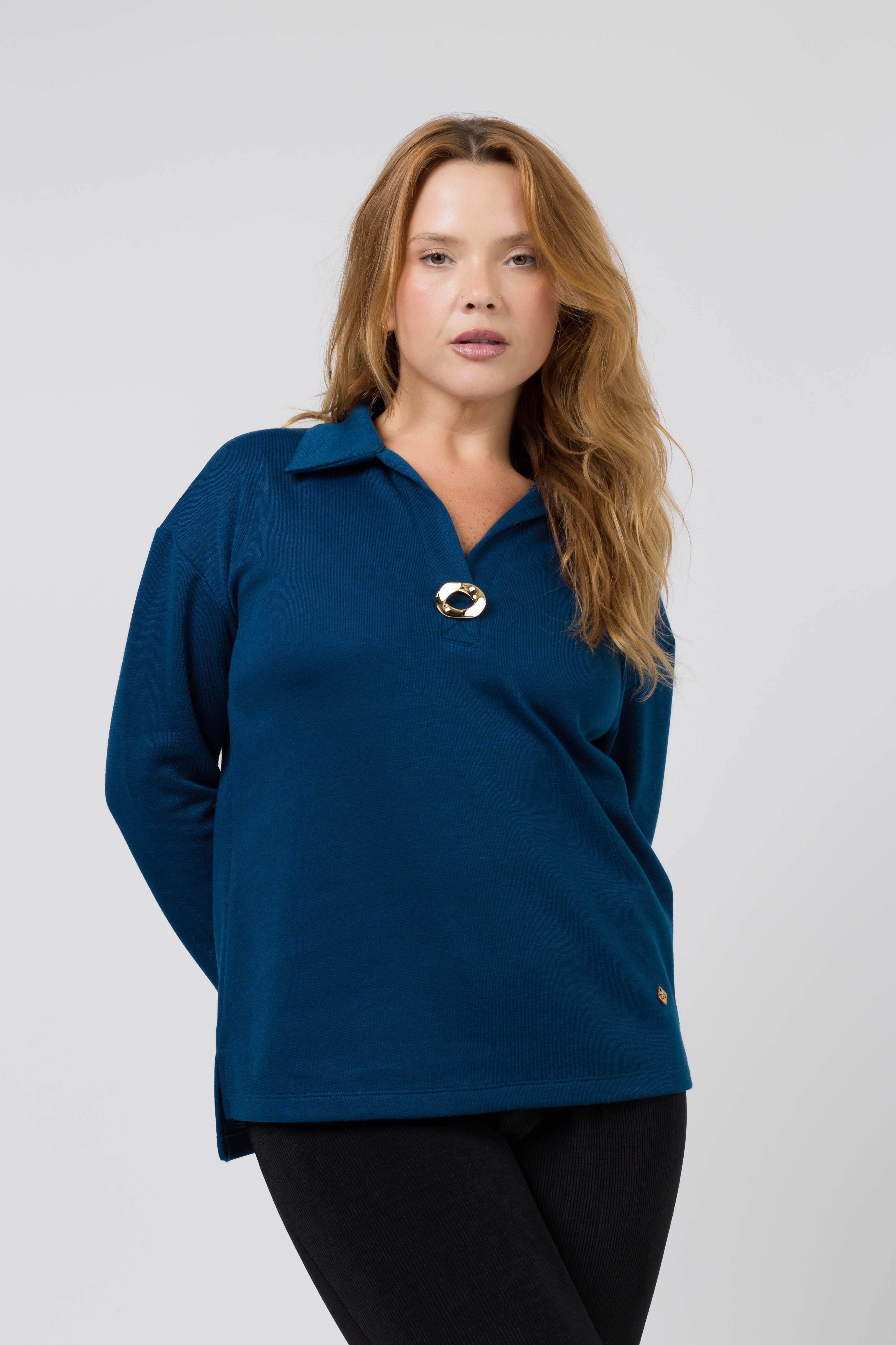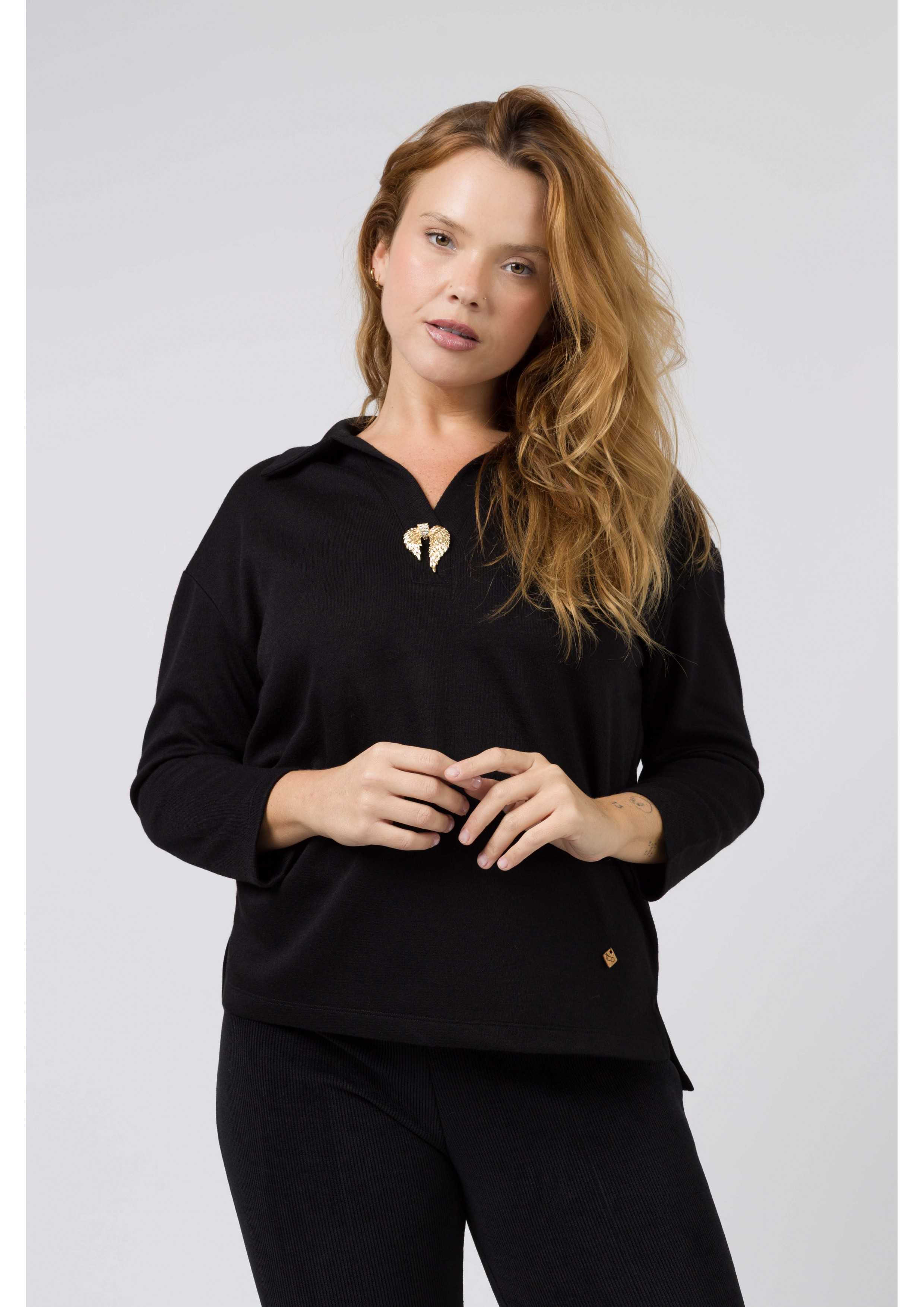 Polo em malha lisa, manga comprida e rachas laterais. Decote com colarinho e carcela aberta com cravado e um alfinete aplicado (o modelo do alfinete pode variar).