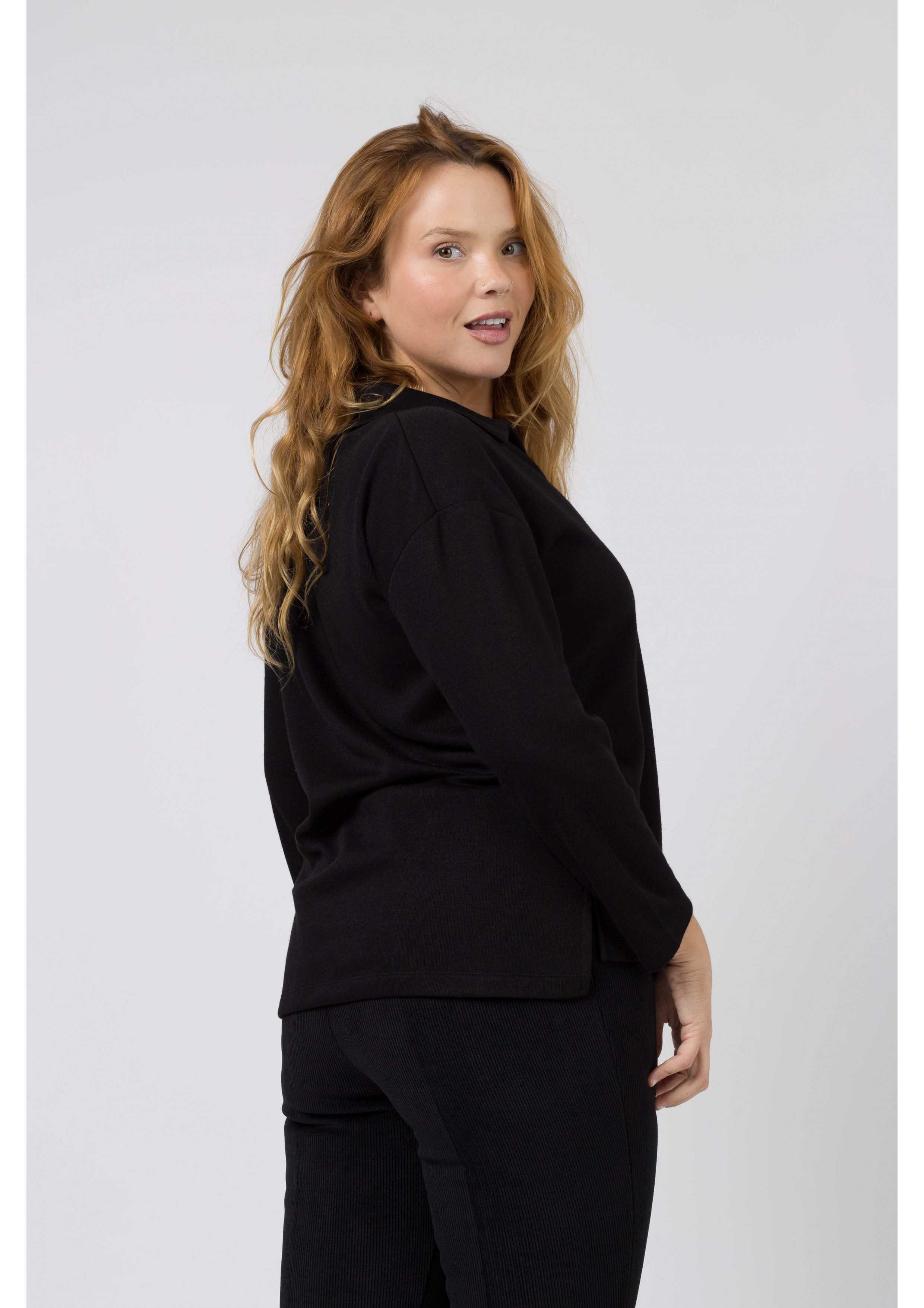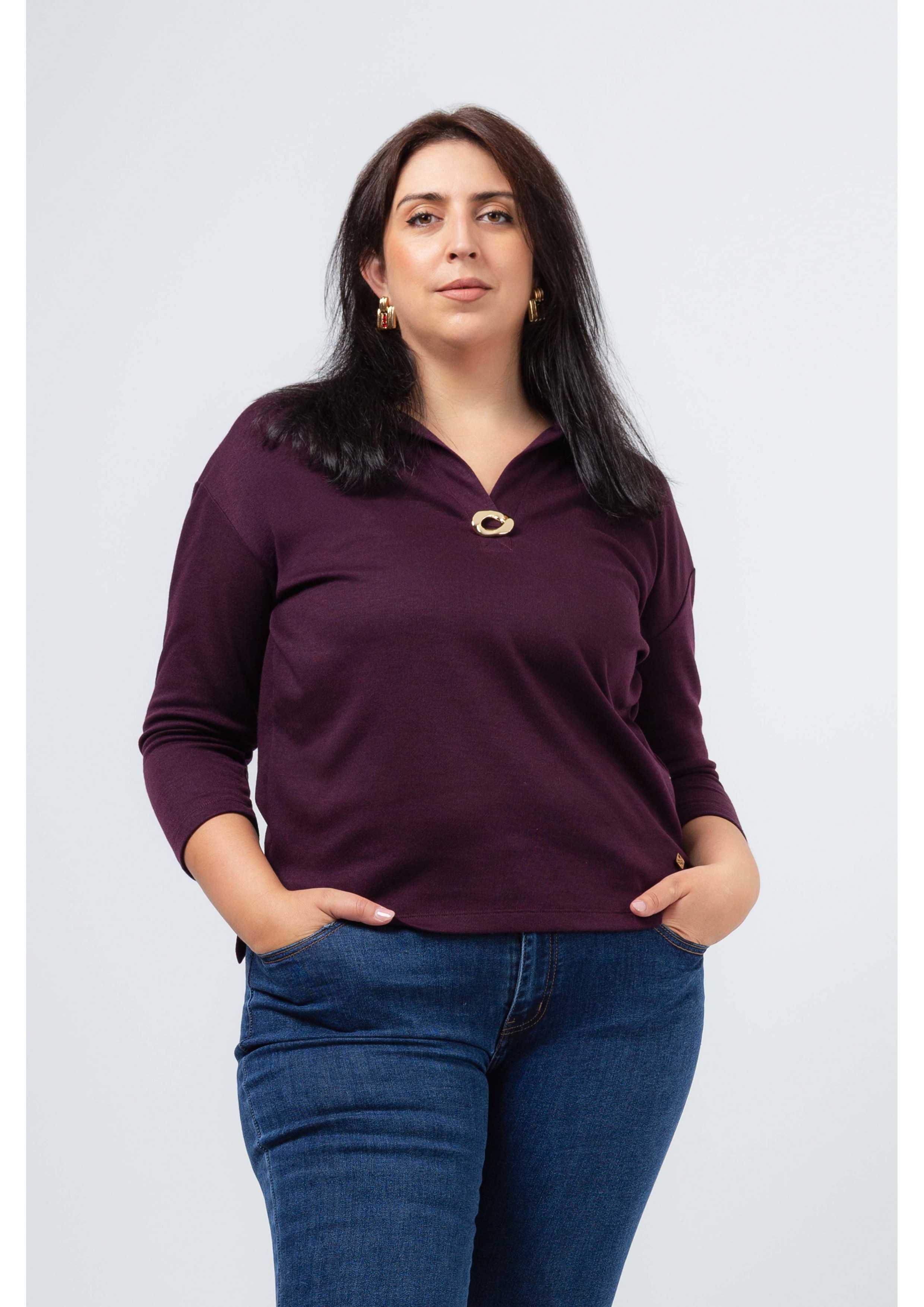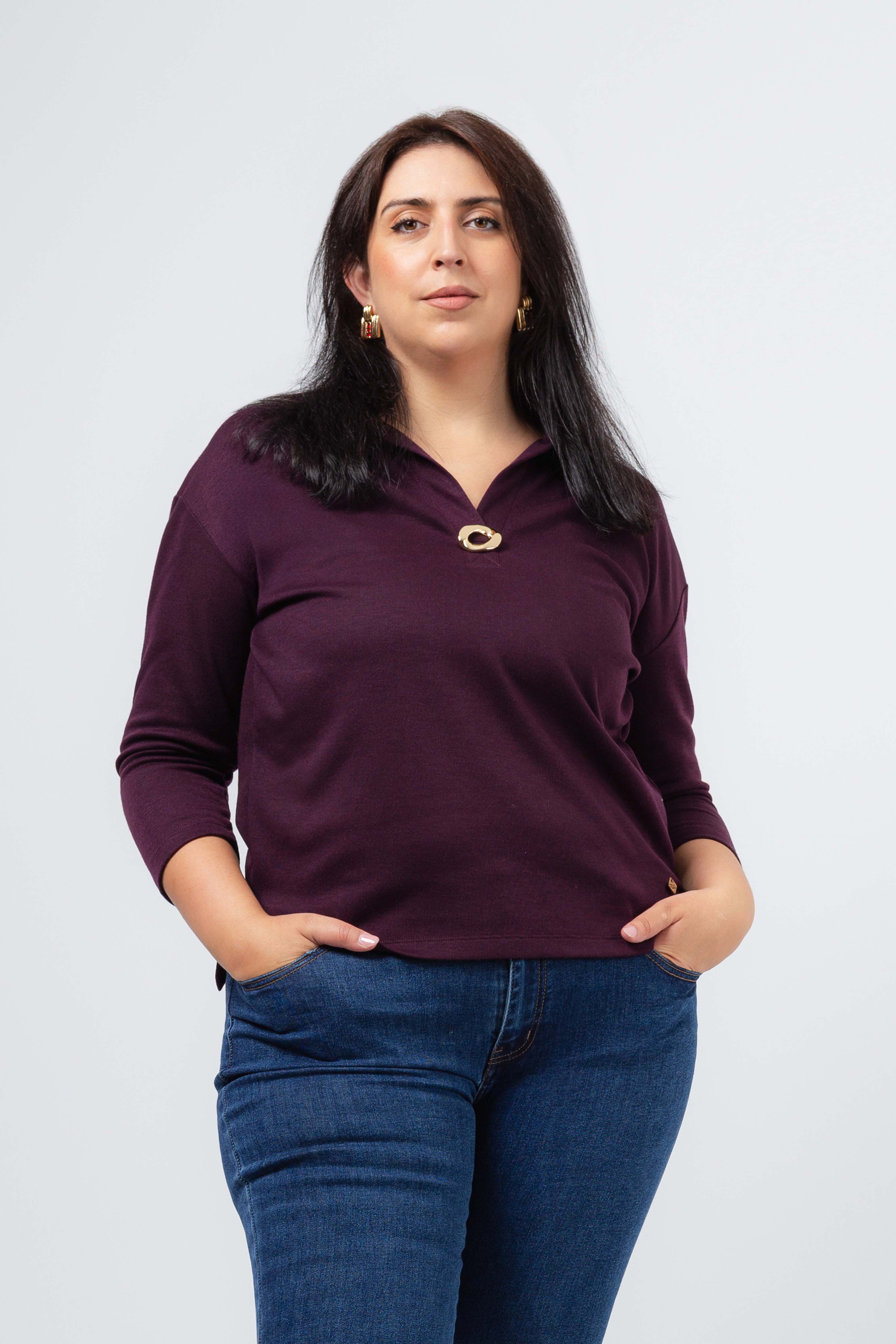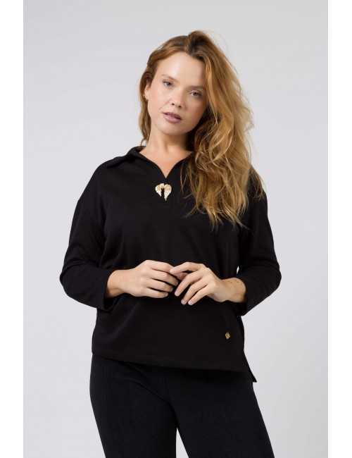 Polo em malha lisa, manga comprida e rachas laterais. Decote com colarinho e carcela aberta com cravado e um alfinete aplicado (o modelo do alfinete pode variar).