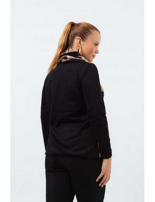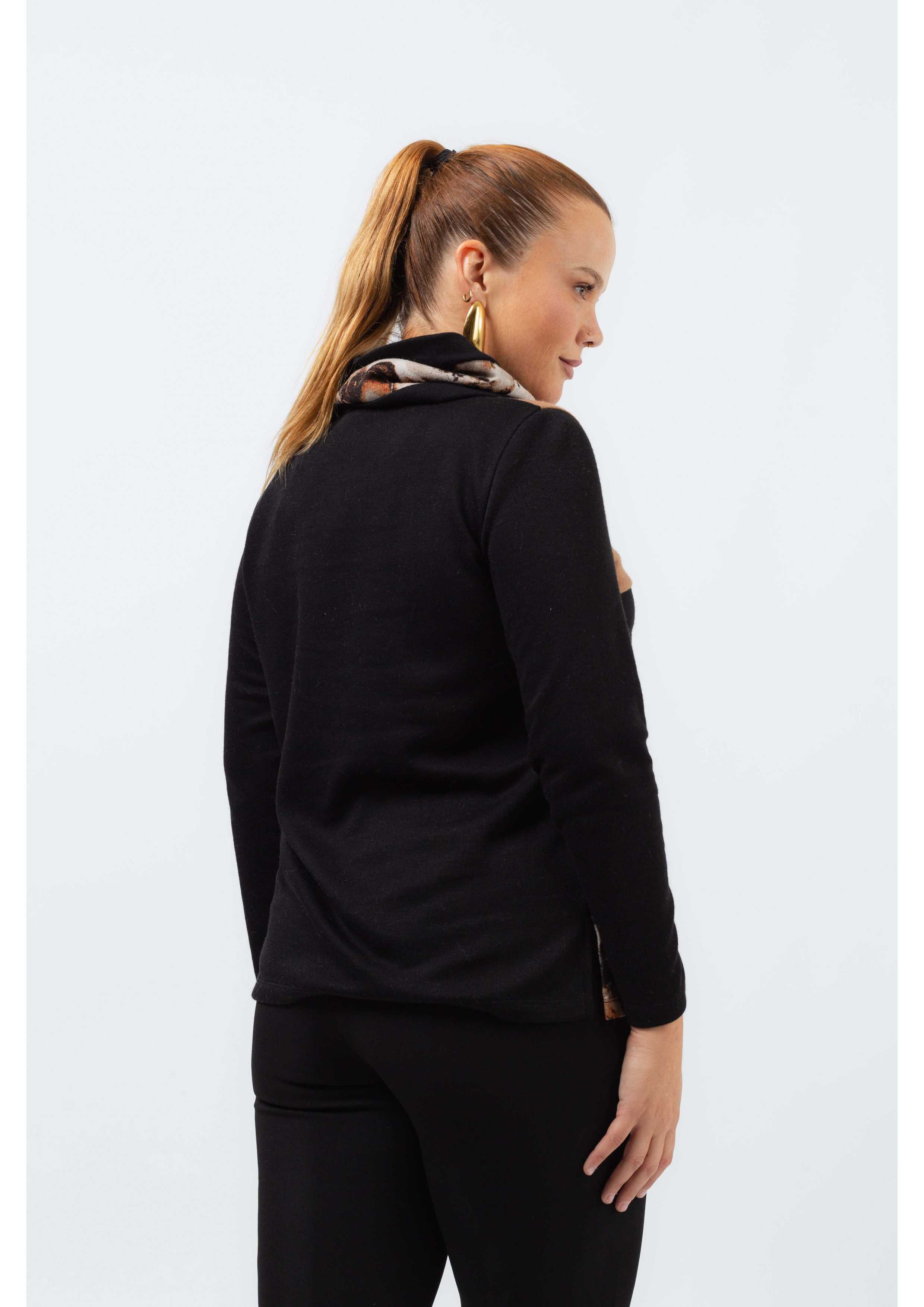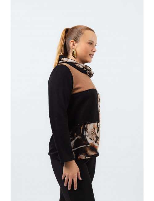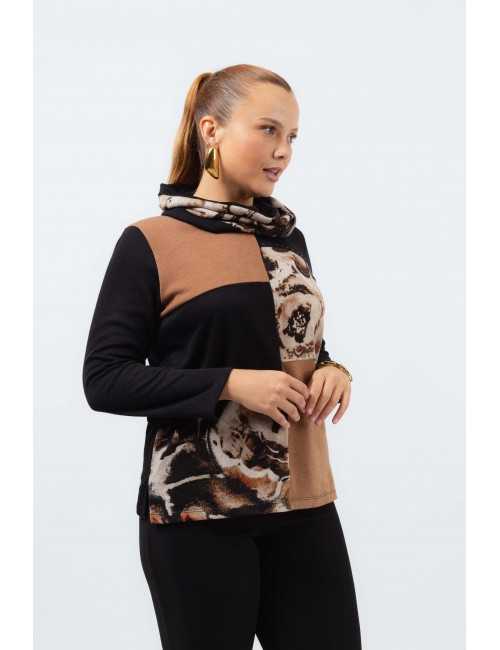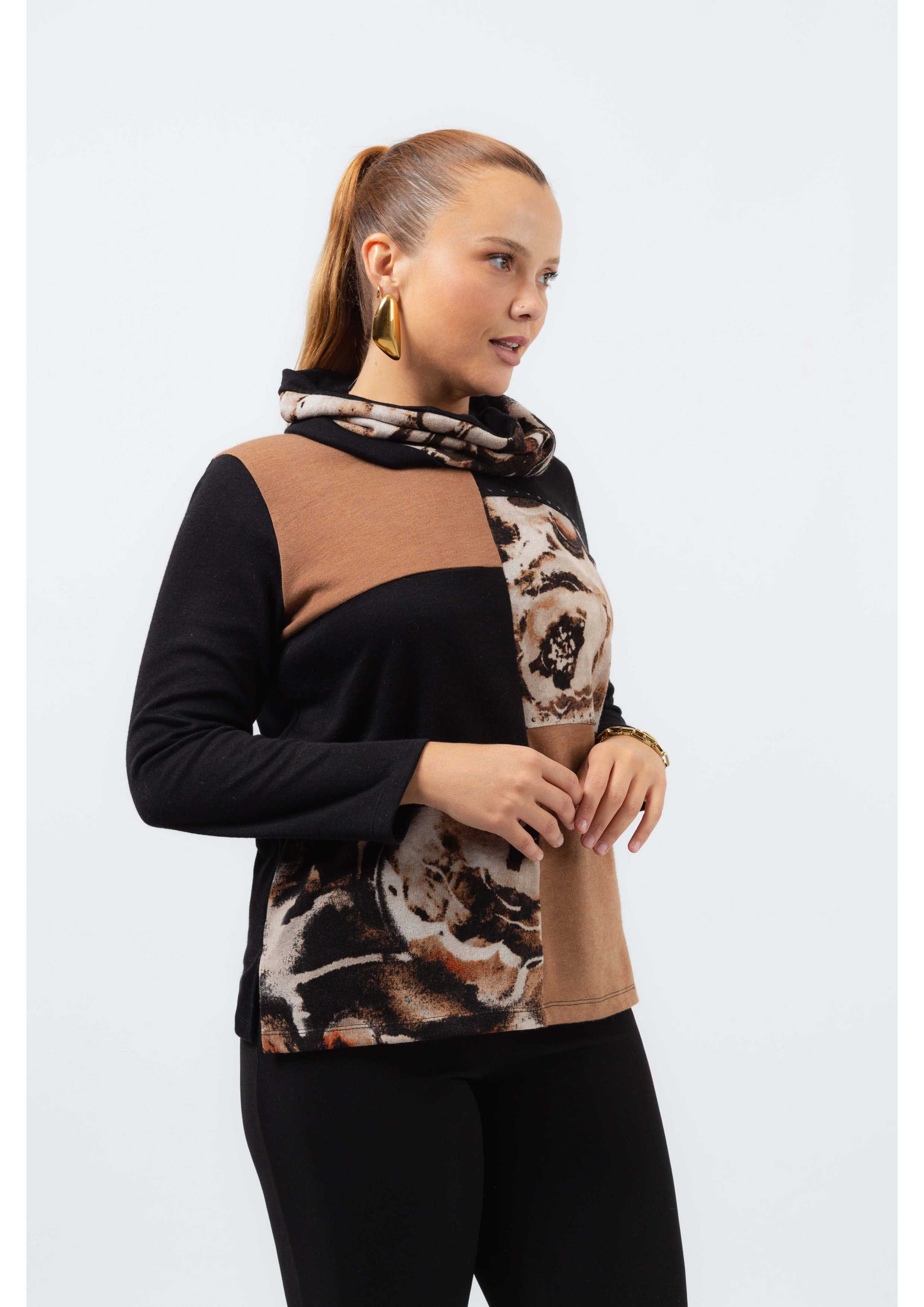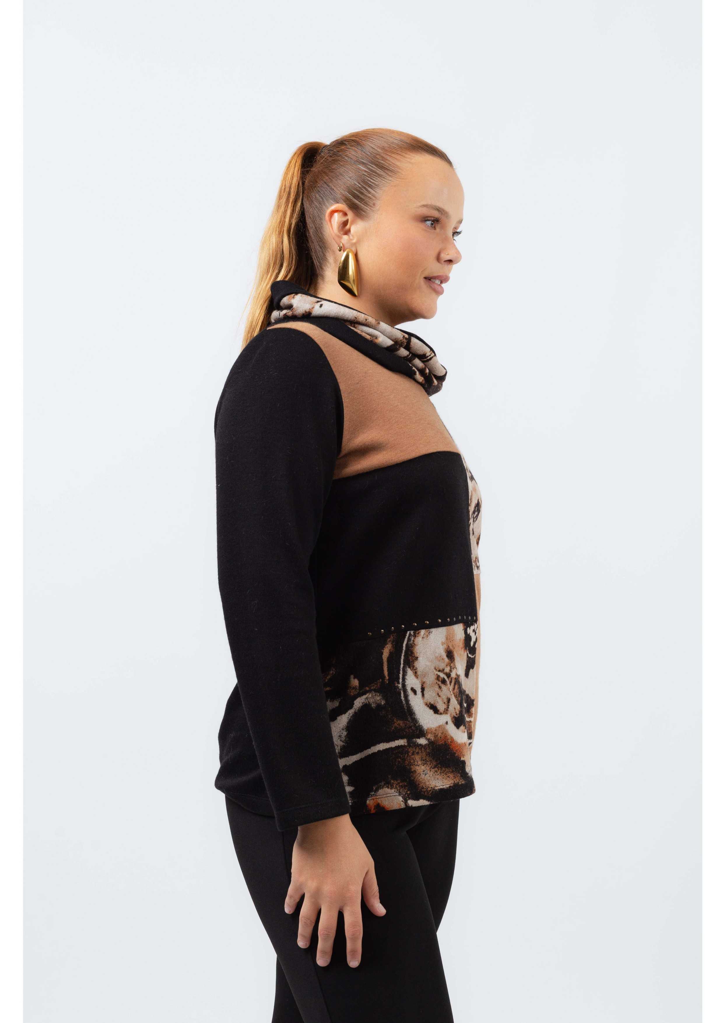 Túnica em malha lisa, com encaixes na frente lisos e estampados tons terra. Levas tranfer em pedras nos encaixes. Manga comprida, decote redondo. Rachas laterais. Gola 2 cores solta.