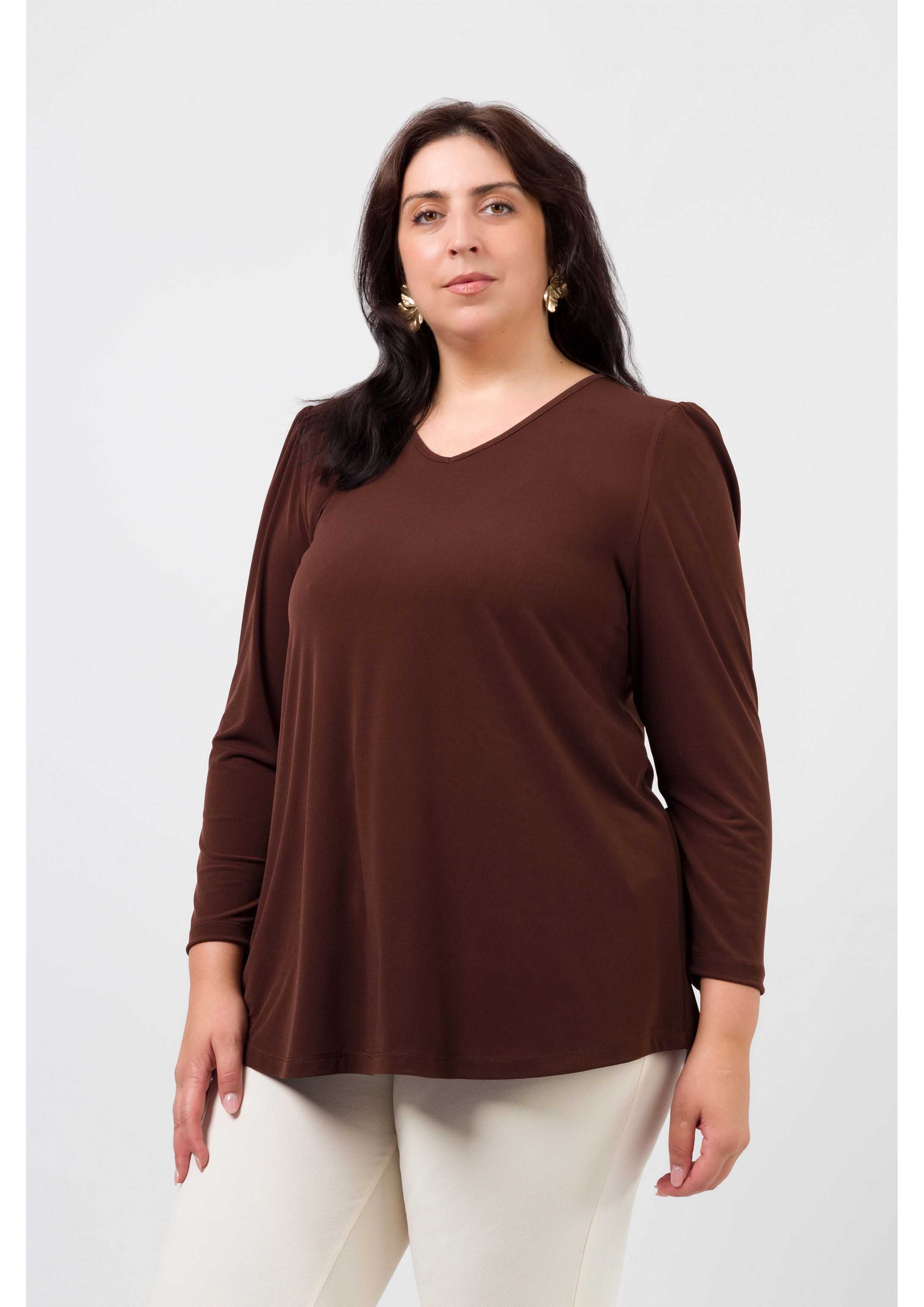 Túnica em malha lisa, decote em bico com colorete cravado, manga comprida com franza no omnro. leva ombreiras. modelo ligeiramente evasé. Disponível em Tamanhos Grandes Produto de desenho e fabrico próprio. Somos uma marca de confeção de vestuário com mais de 50 anos de experiência Modelo: Altura 1.73m e está a vestir o tamanho 3XL.