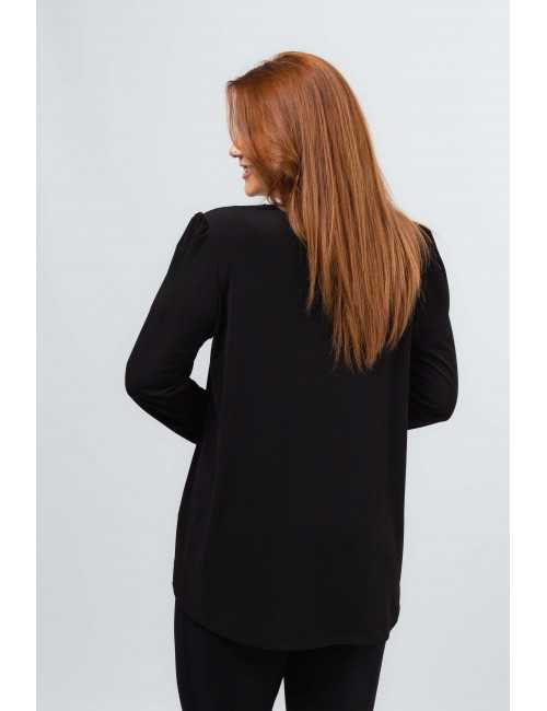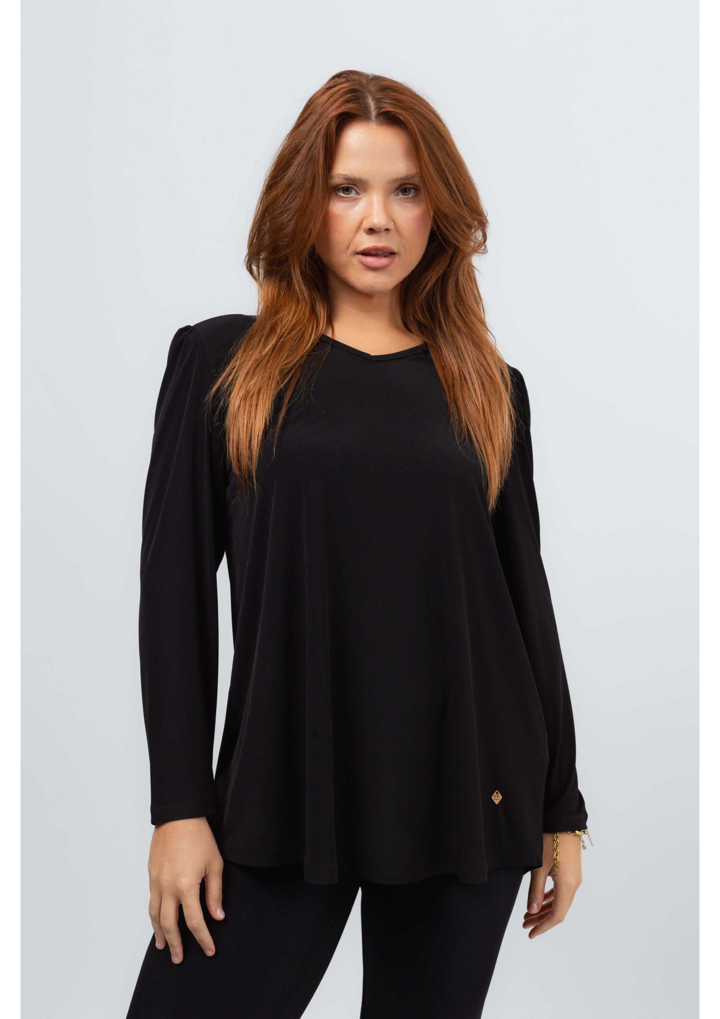 Túnica em malha lisa, decote em bico com colorete cravado, manga comprida com franza no omnro. leva ombreiras. modelo ligeiramente evasé.