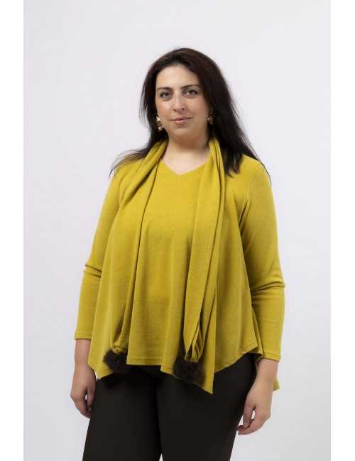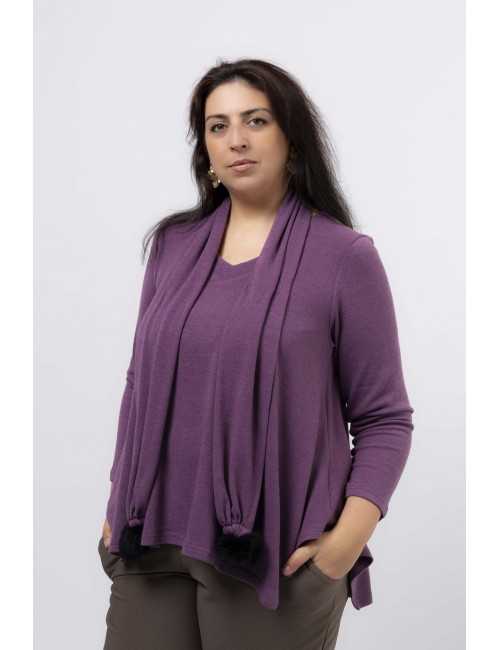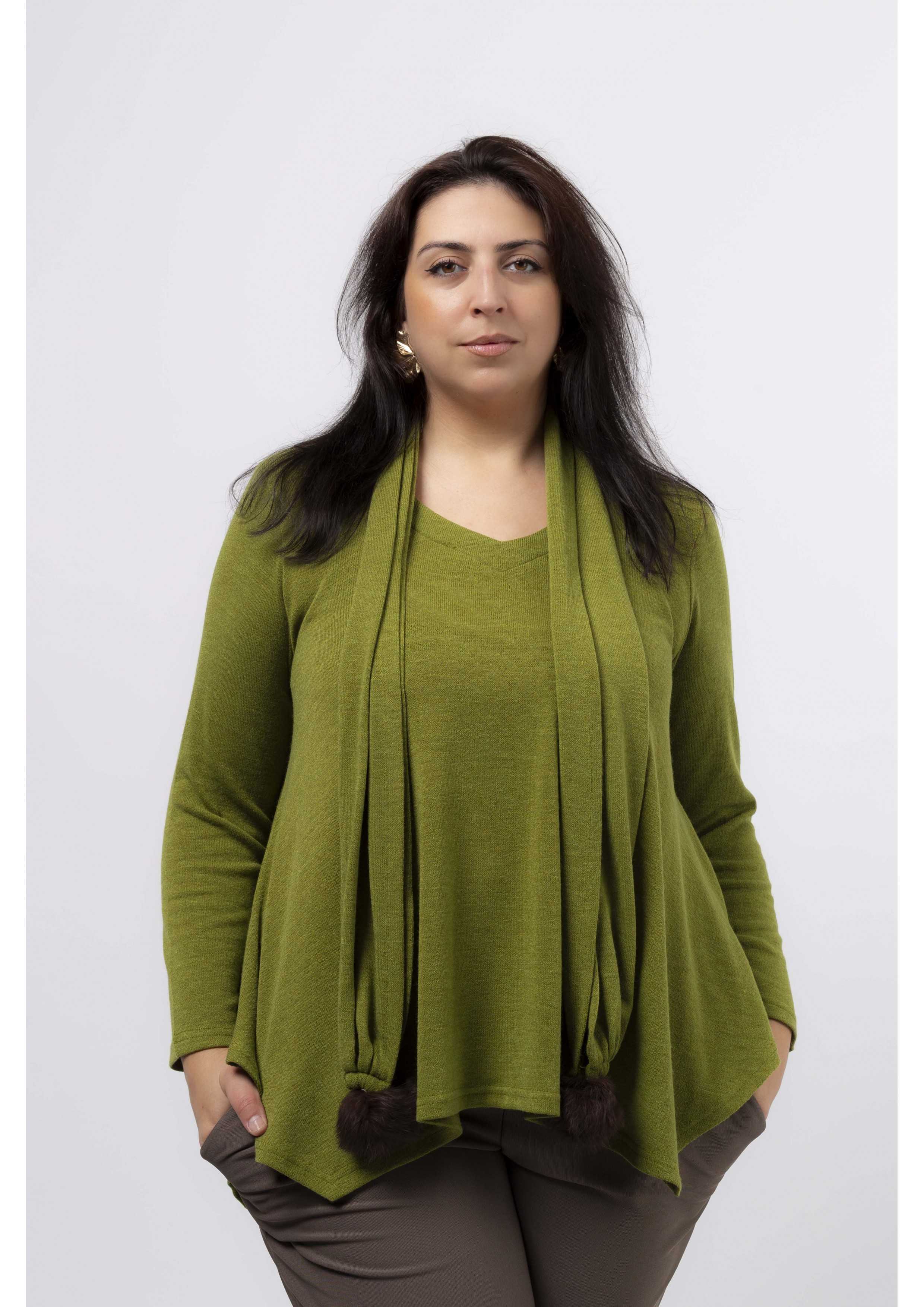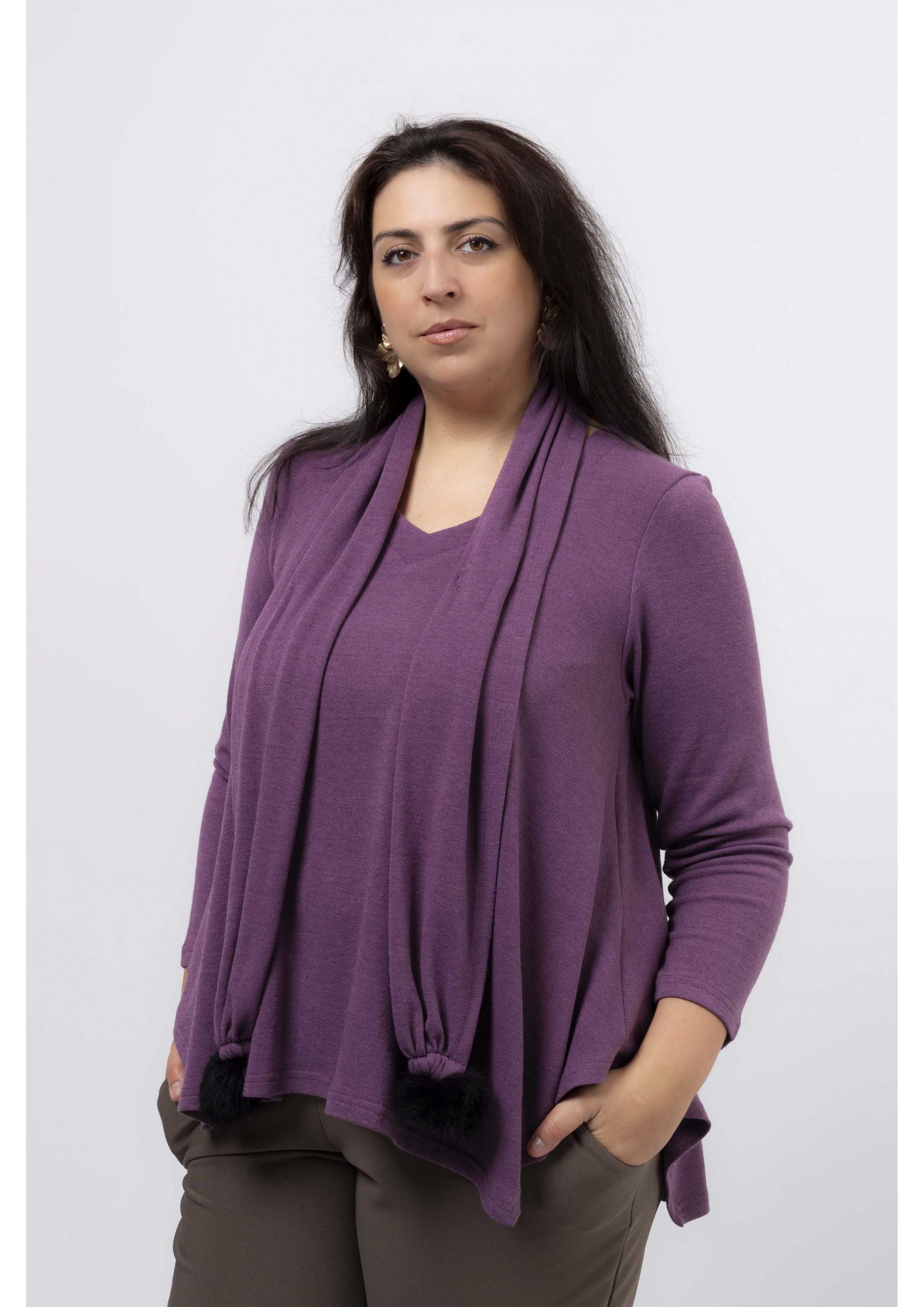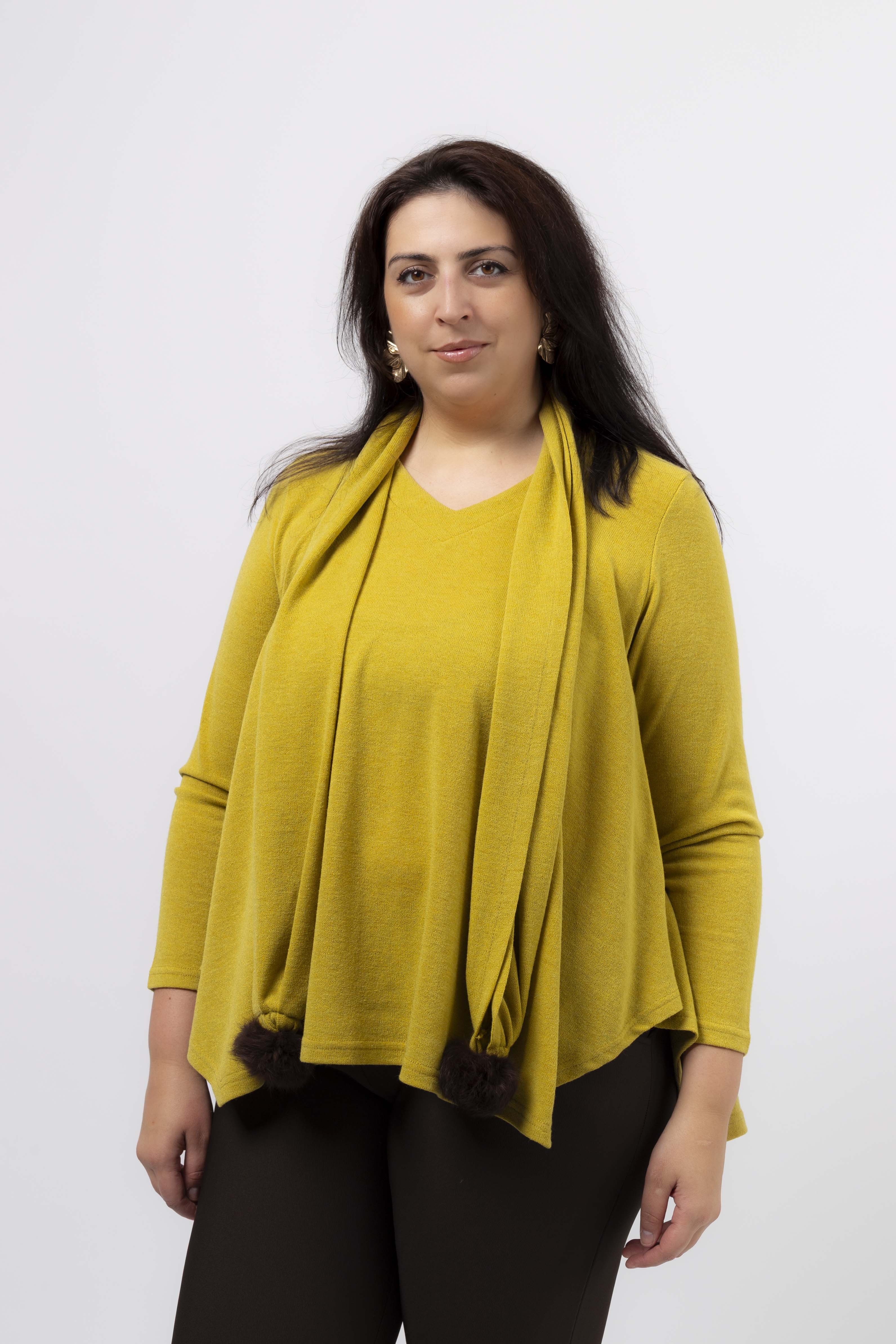 Túnica malha lisa, manga comprida decote em bico, pespontad, base em bicos, cachecol com pompom nas pontas, modelo largo. Disponível em Tamanhos Grandes Produto de desenho e fabrico próprio. Somos uma marca de confeção de vestuário com mais de 50 anos de experiência Modelo: Altura 1.82m e está a vestir o tamanho 3XL. O pompom pode variar de cor. |