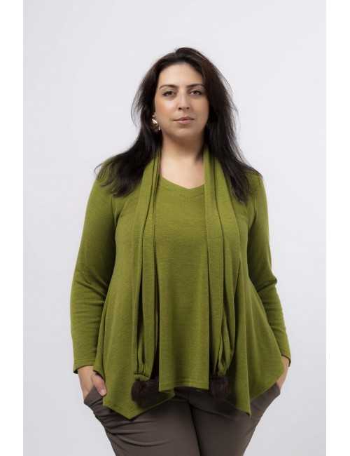 Túnica malha lisa, manga comprida decote em bico, pespontad, base em bicos, cachecol com pompom nas pontas, modelo largo.