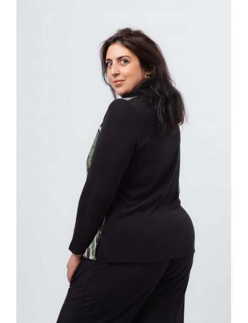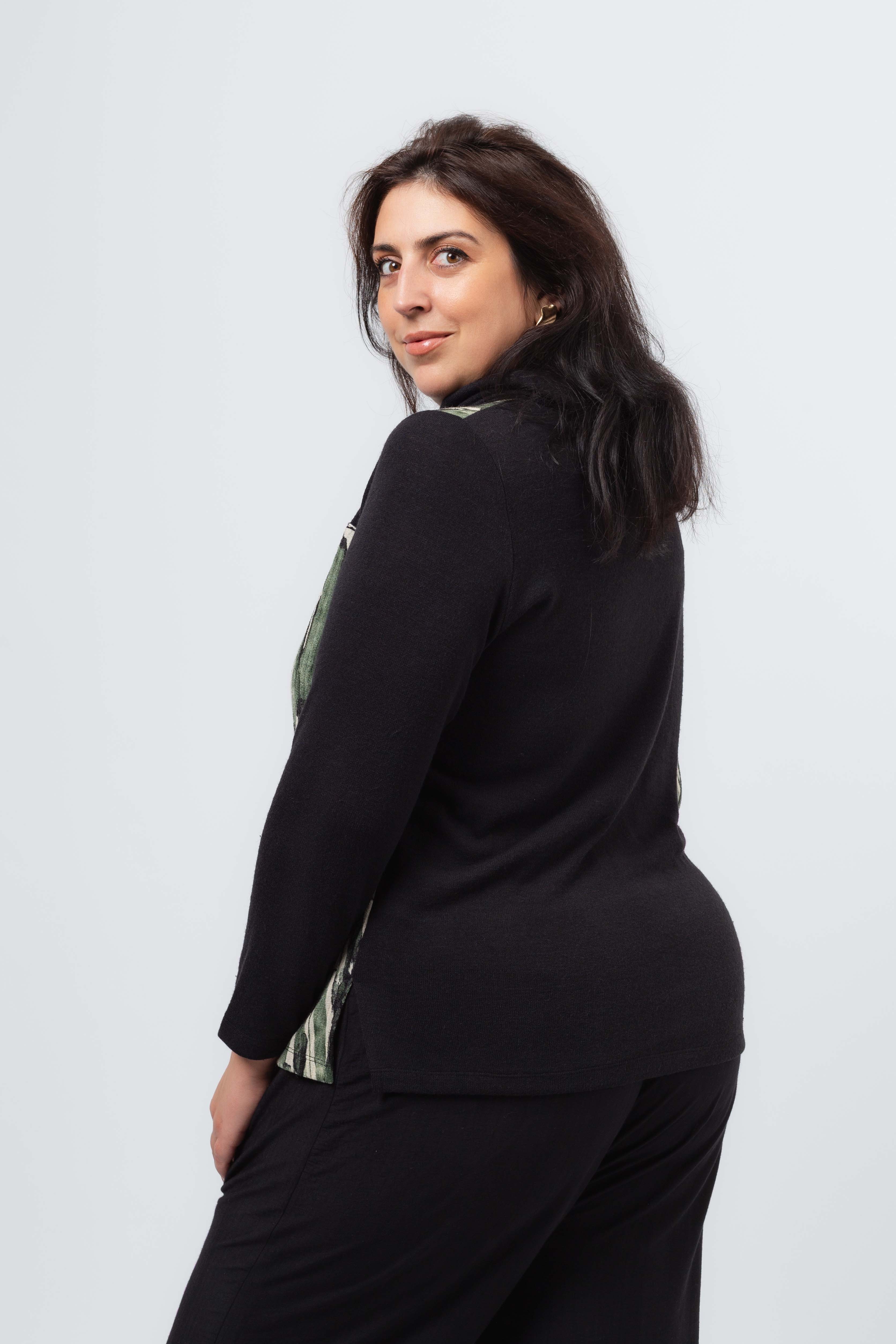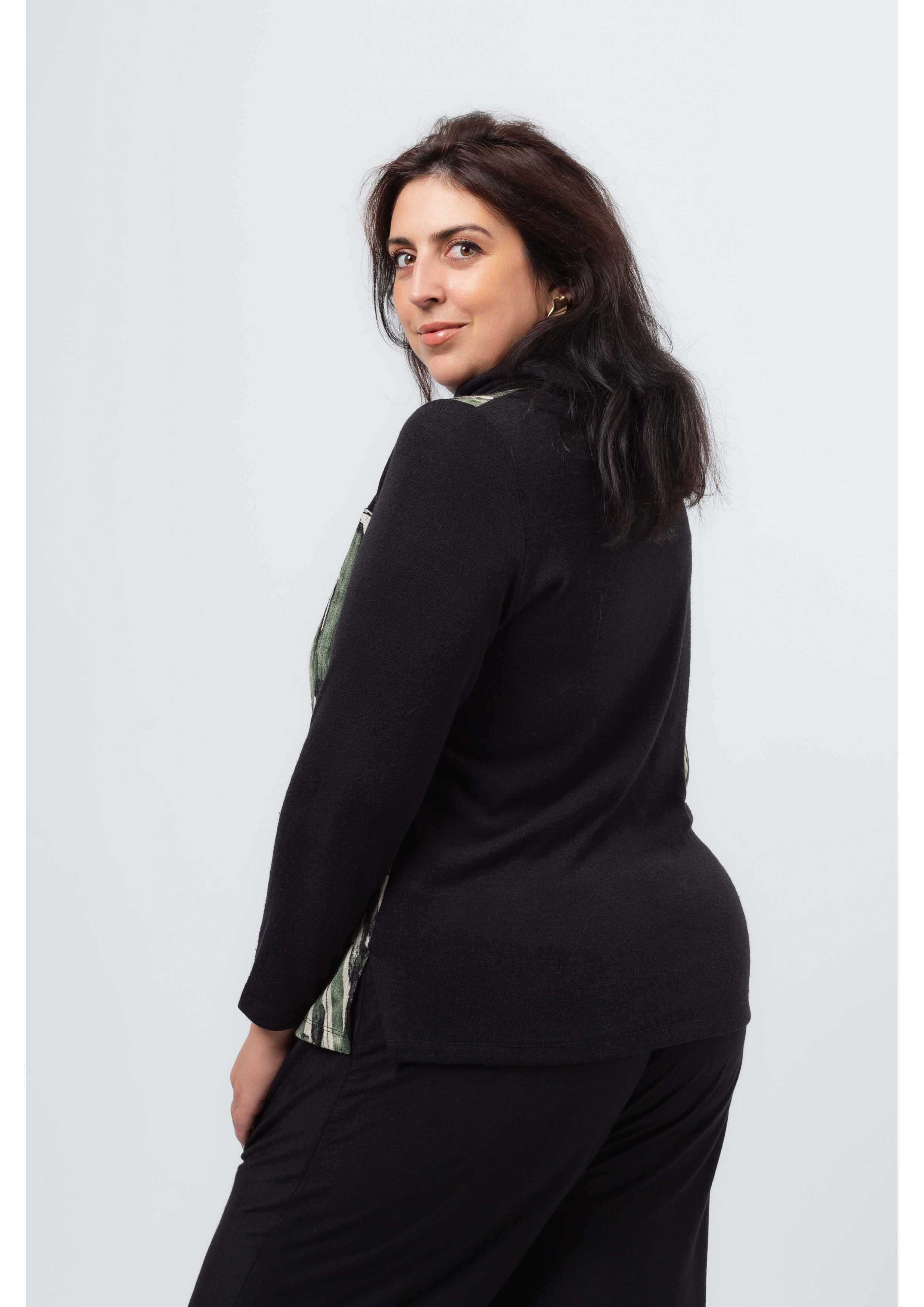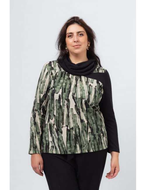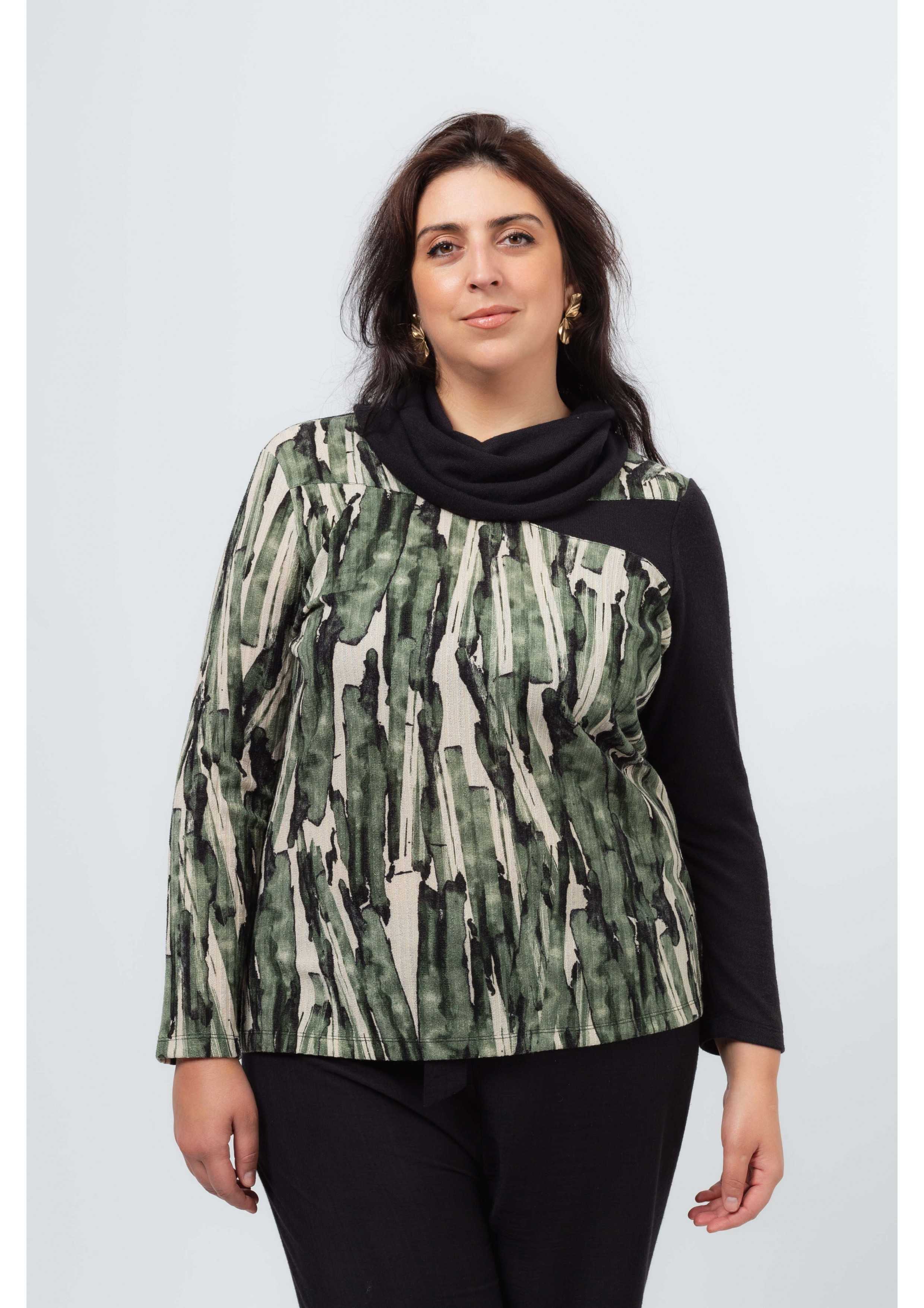 Túnica em malha estampada, costa, uma manga e gola em malha lisa. Decote redondo. Corte peito com encaixe. Rachas laterais. Corte no peito. Gola solta.