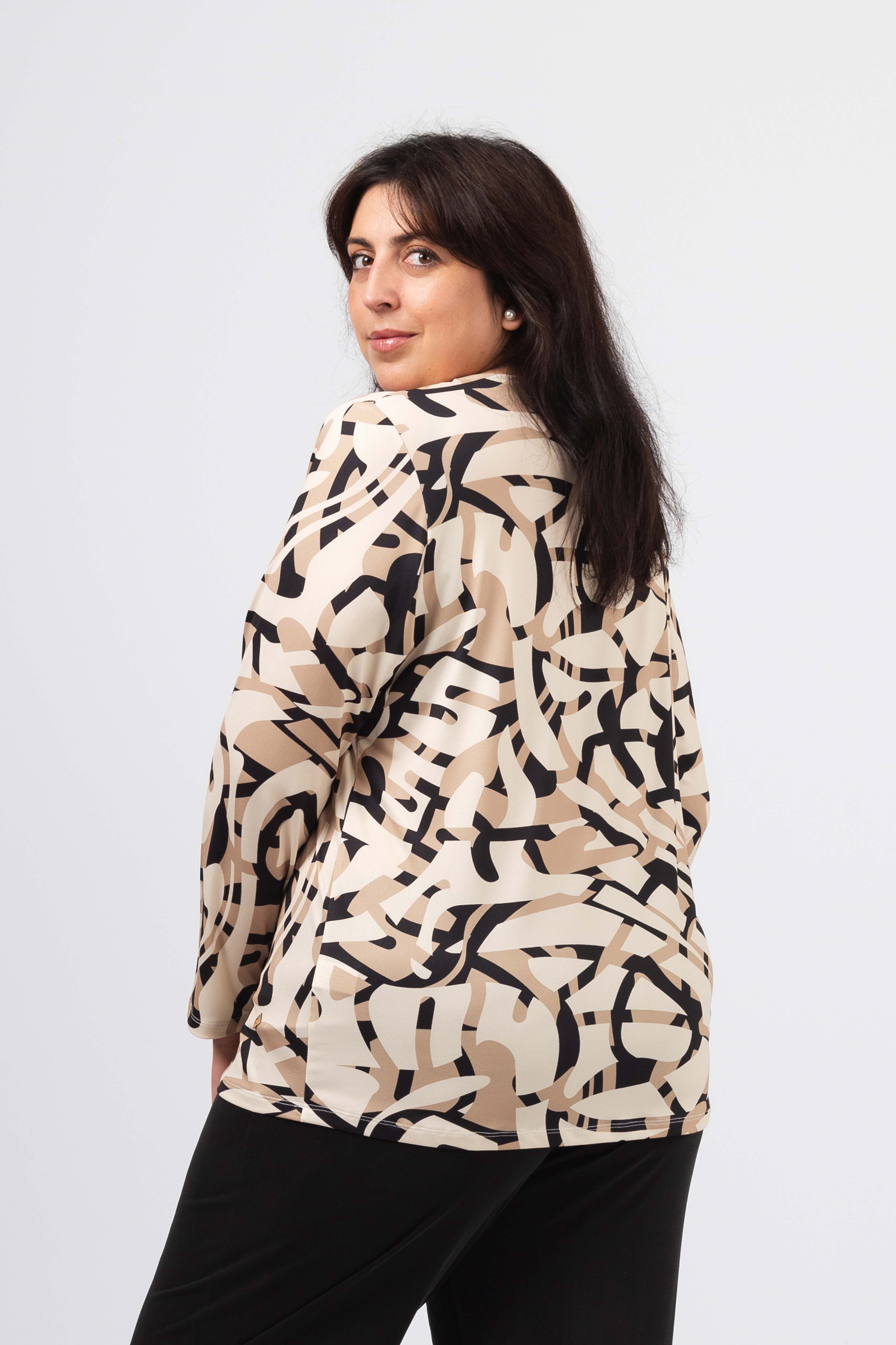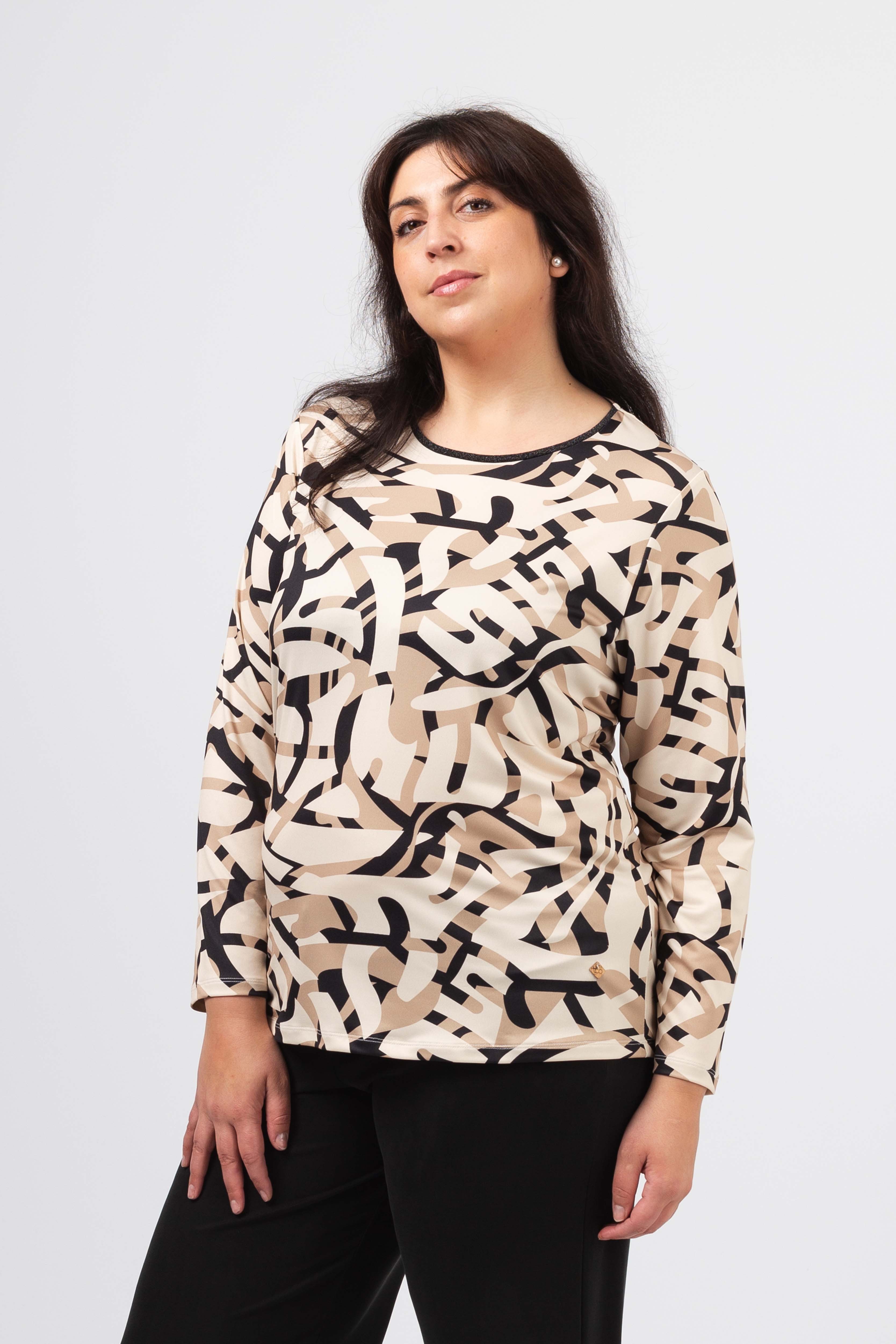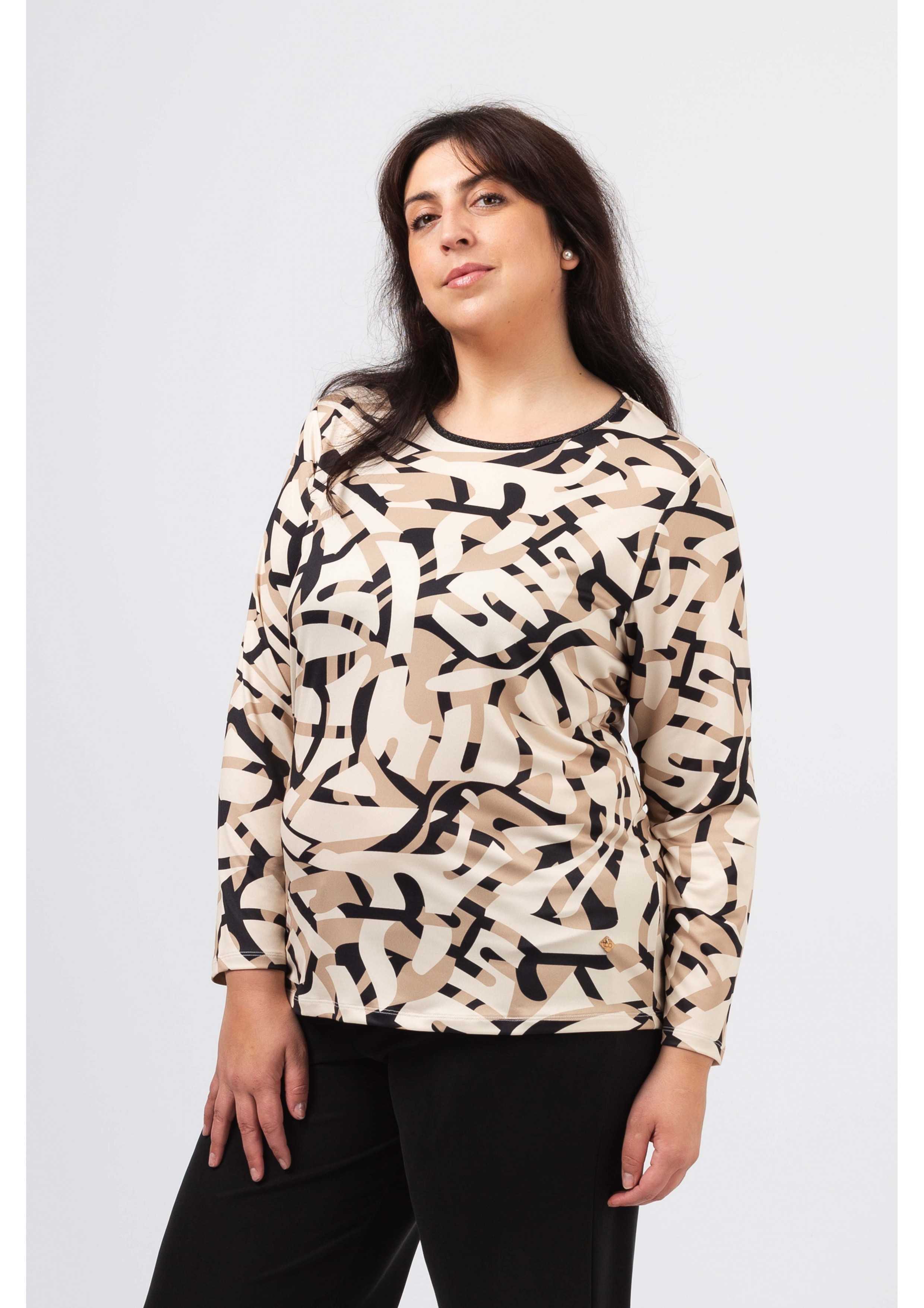 Túnica em malha estampada, manga comprida. decote redondo com a frente em malha lurex preta.