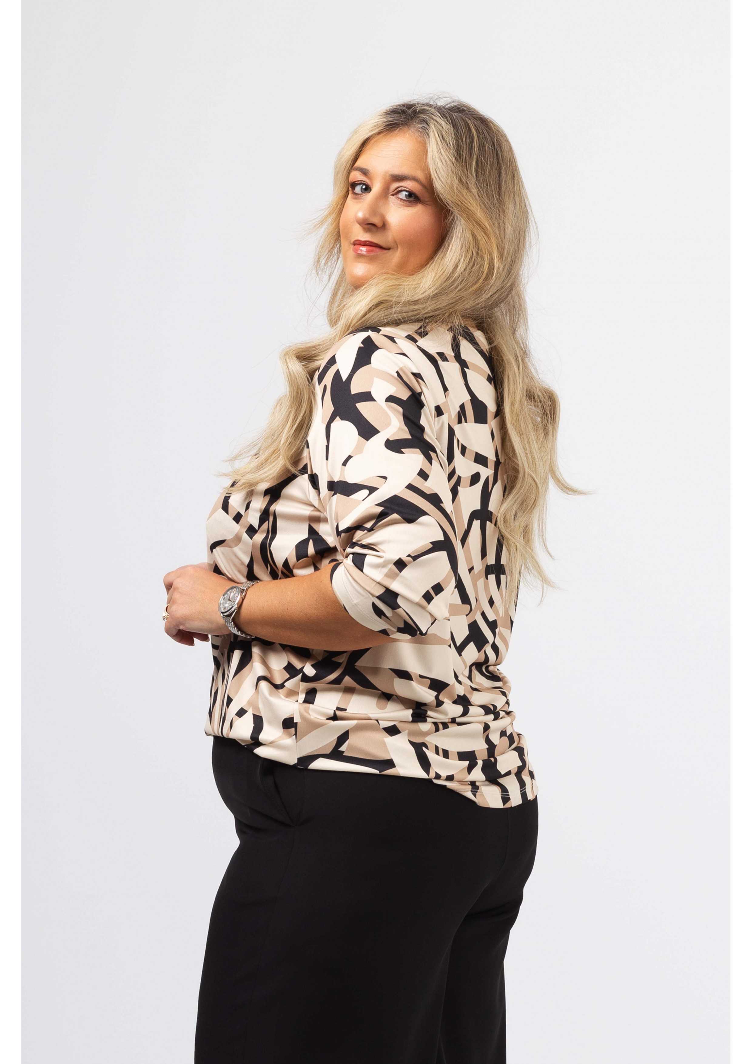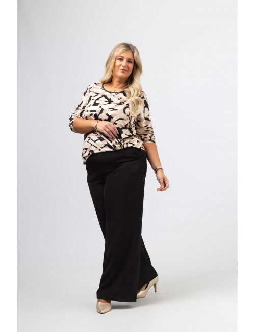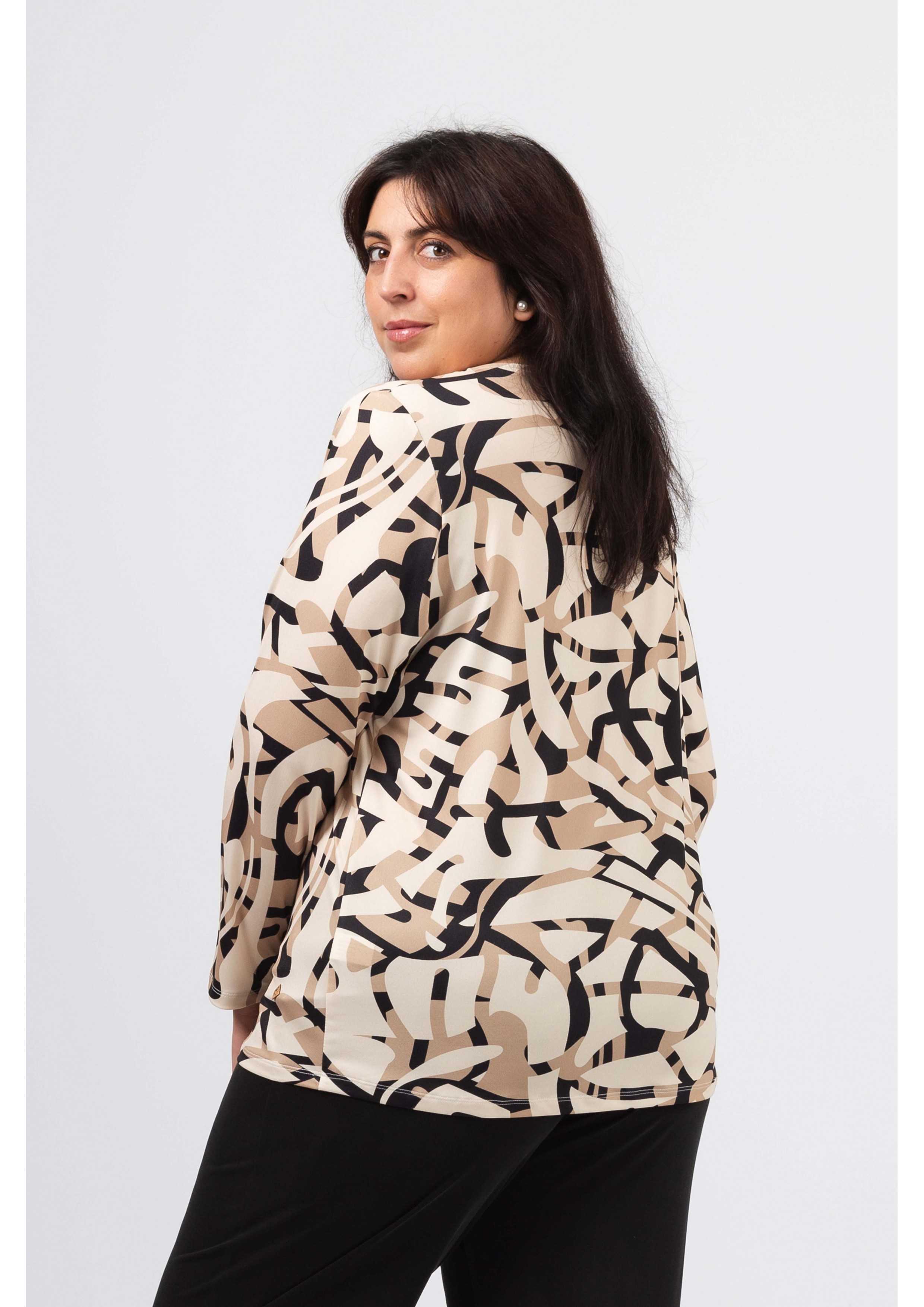 Túnica em malha estampada, manga comprida. decote redondo com a frente em malha lurex preta.