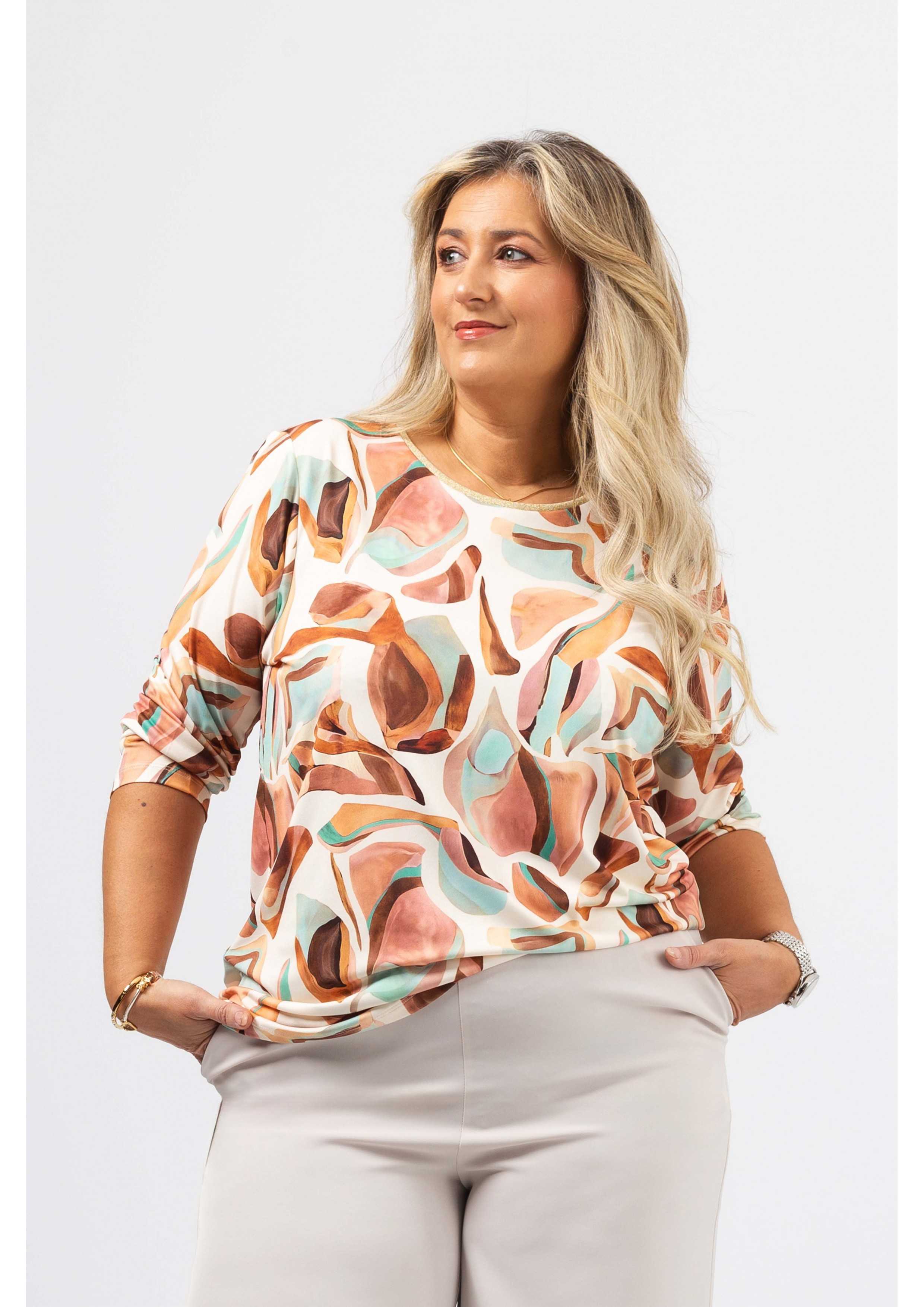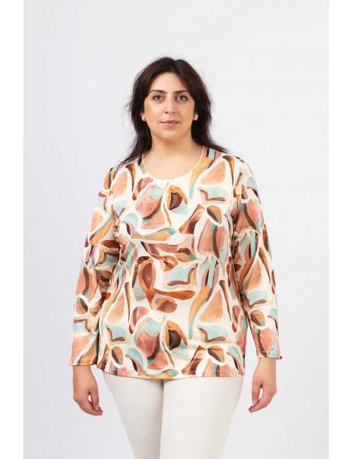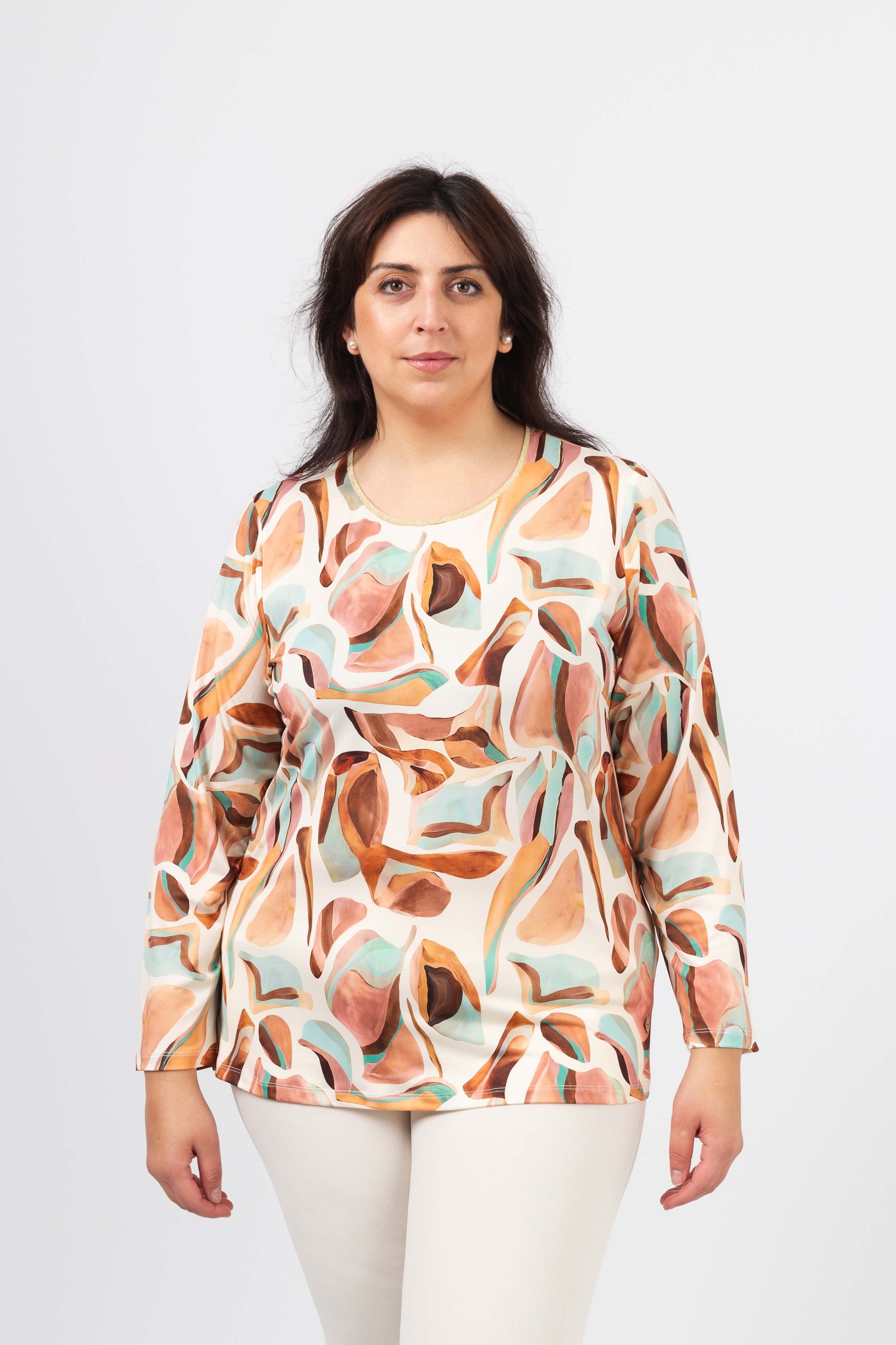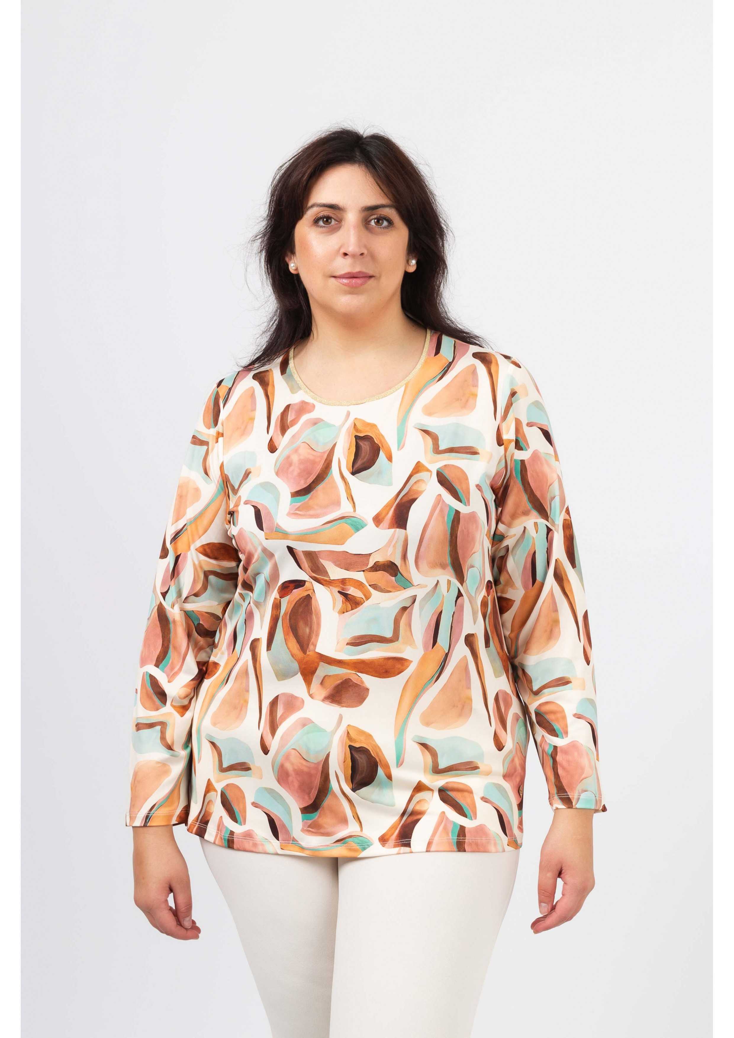 Túnica em malha estampada, manga comprida. decote redondo com a frente em malha lurex dourado. Disponível em Tamanhos Grandes Produto de desenho e fabrico próprio. Somos uma marca de confeção de vestuário com mais de 50 anos de experiência Modelo: Altura 1.65m e está a vestir o tamanho 2XL.