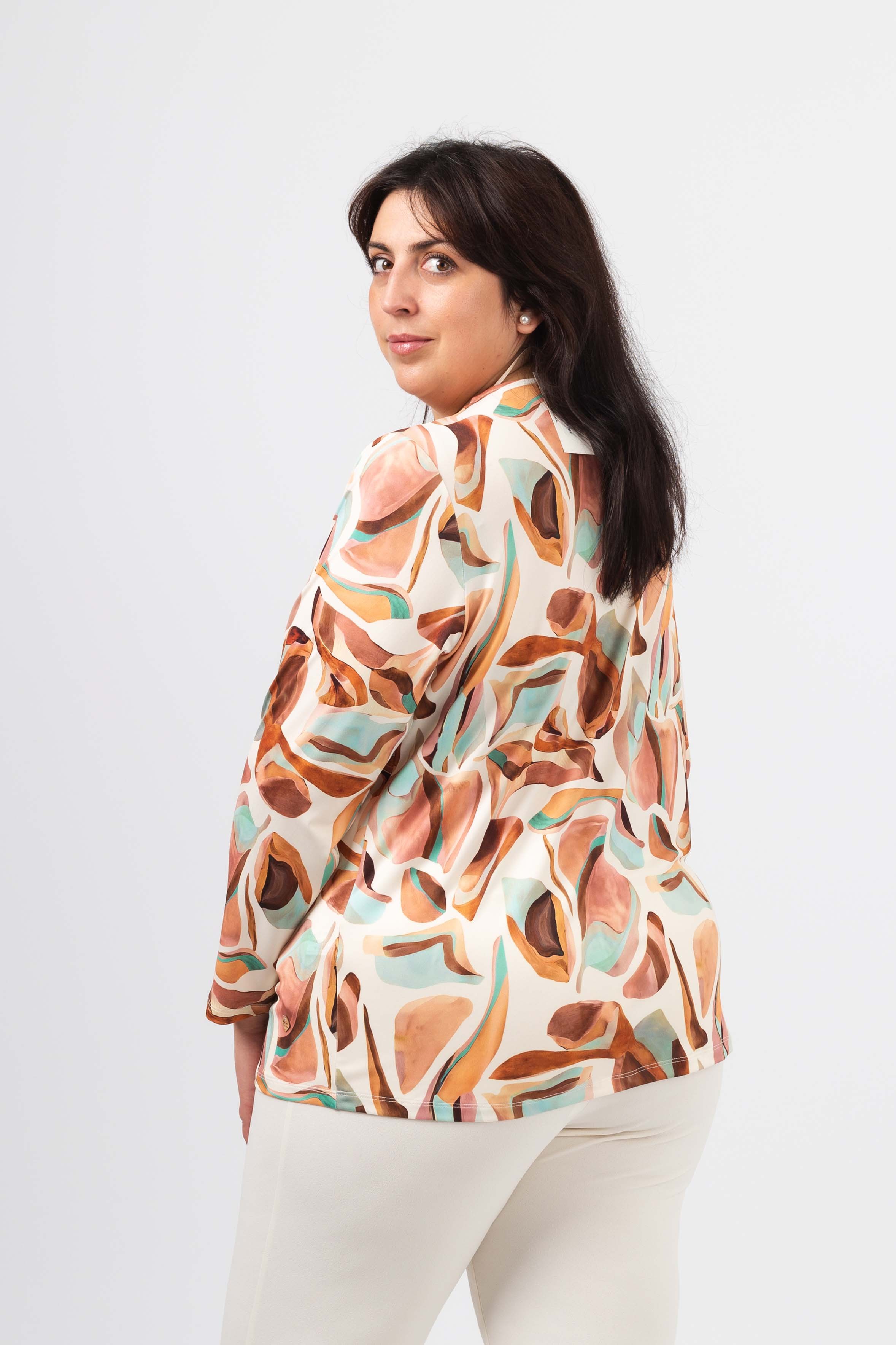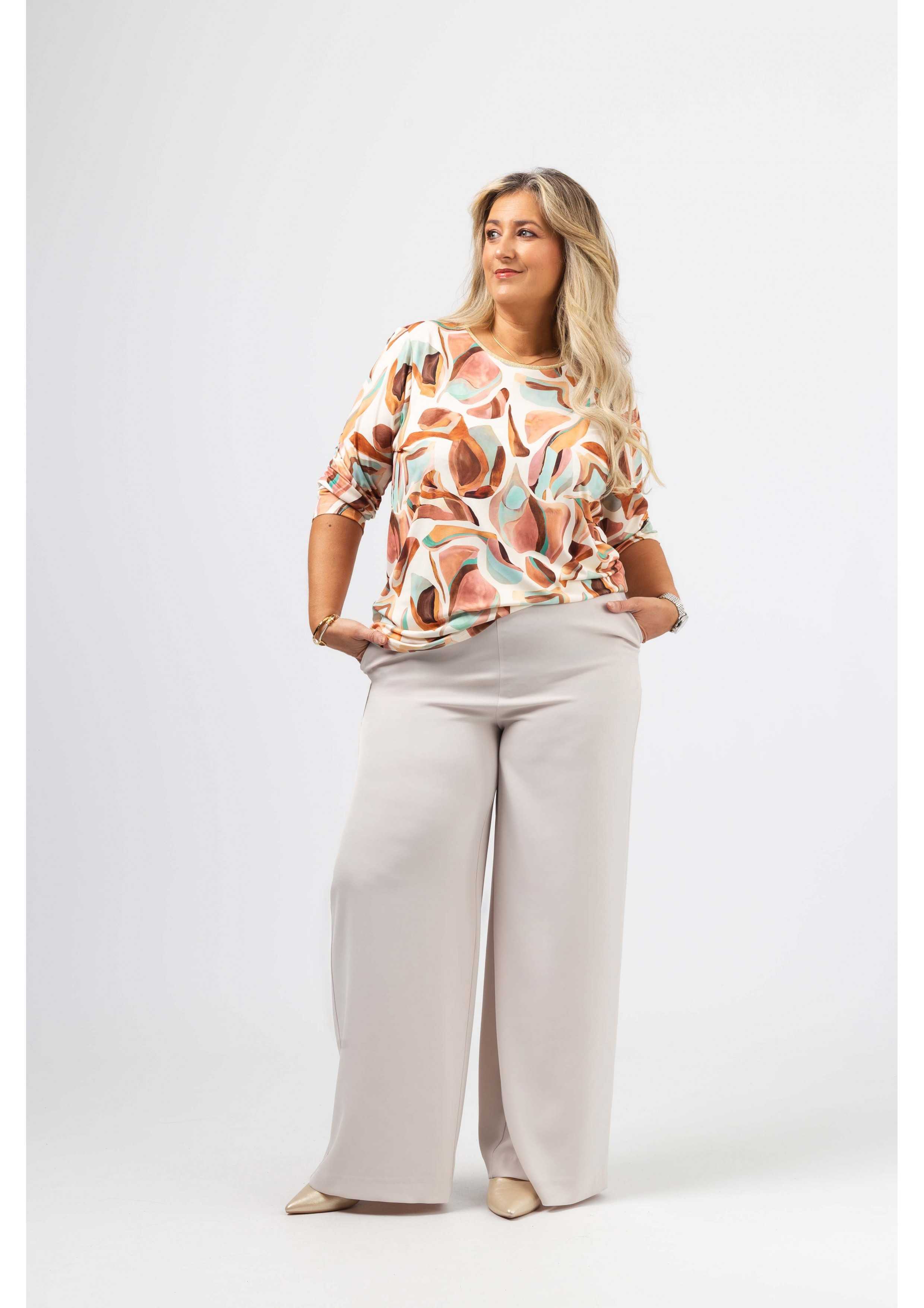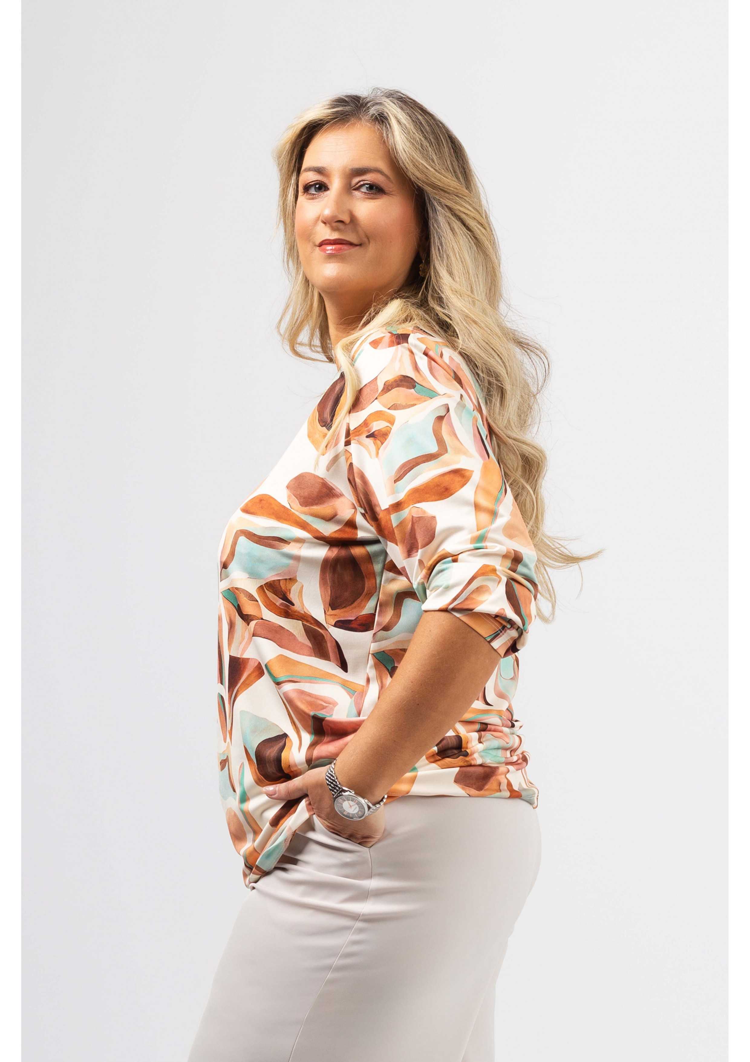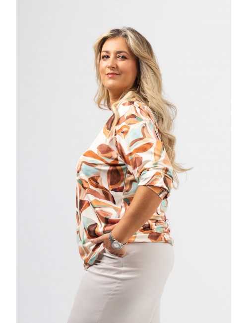 Túnica em malha estampada, manga comprida. decote redondo com a frente em malha lurex dourado. Disponível em Tamanhos Grandes Produto de desenho e fabrico próprio. Somos uma marca de confeção de vestuário com mais de 50 anos de experiência Modelo: Altura 1.65m e está a vestir o tamanho 2XL.