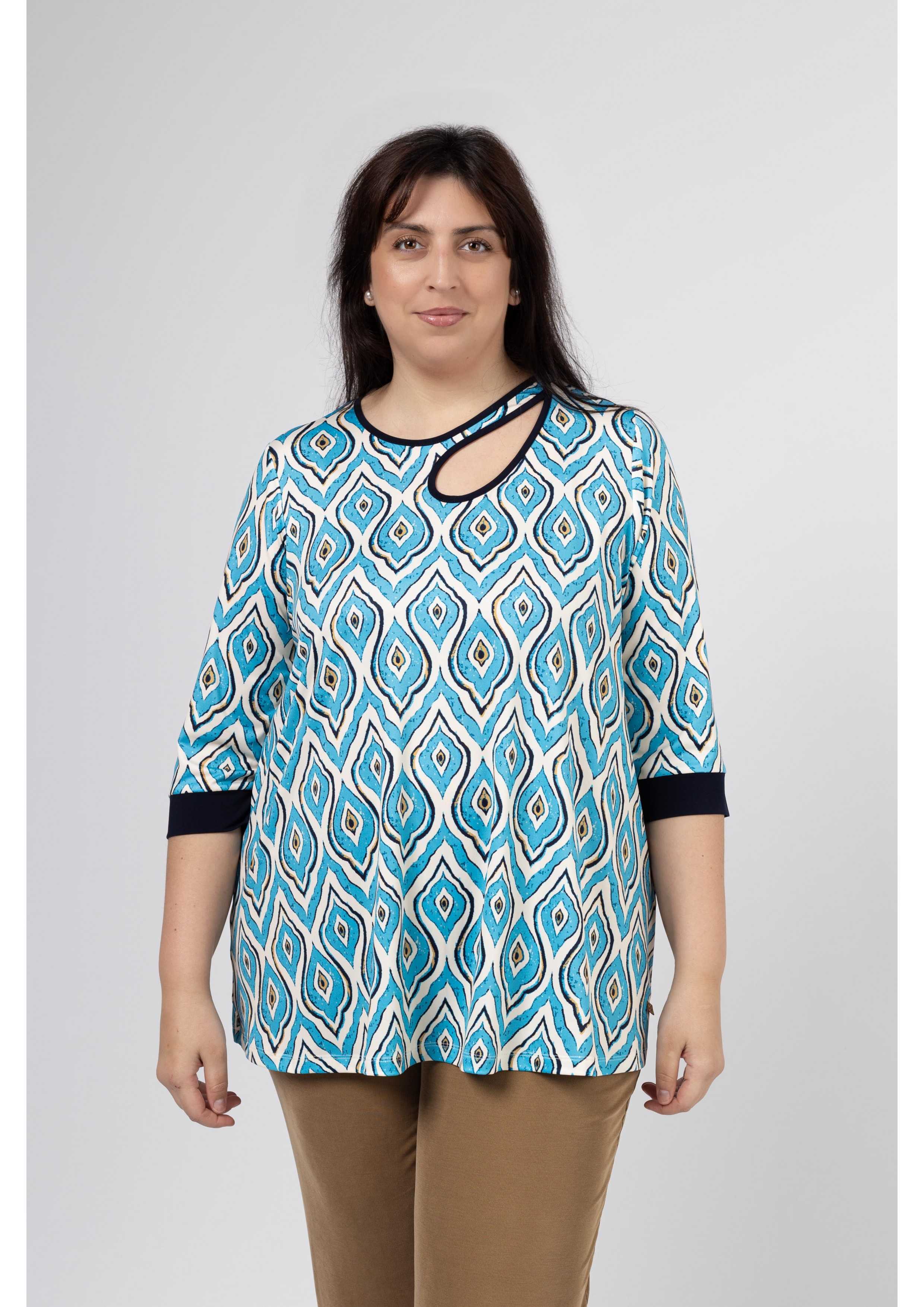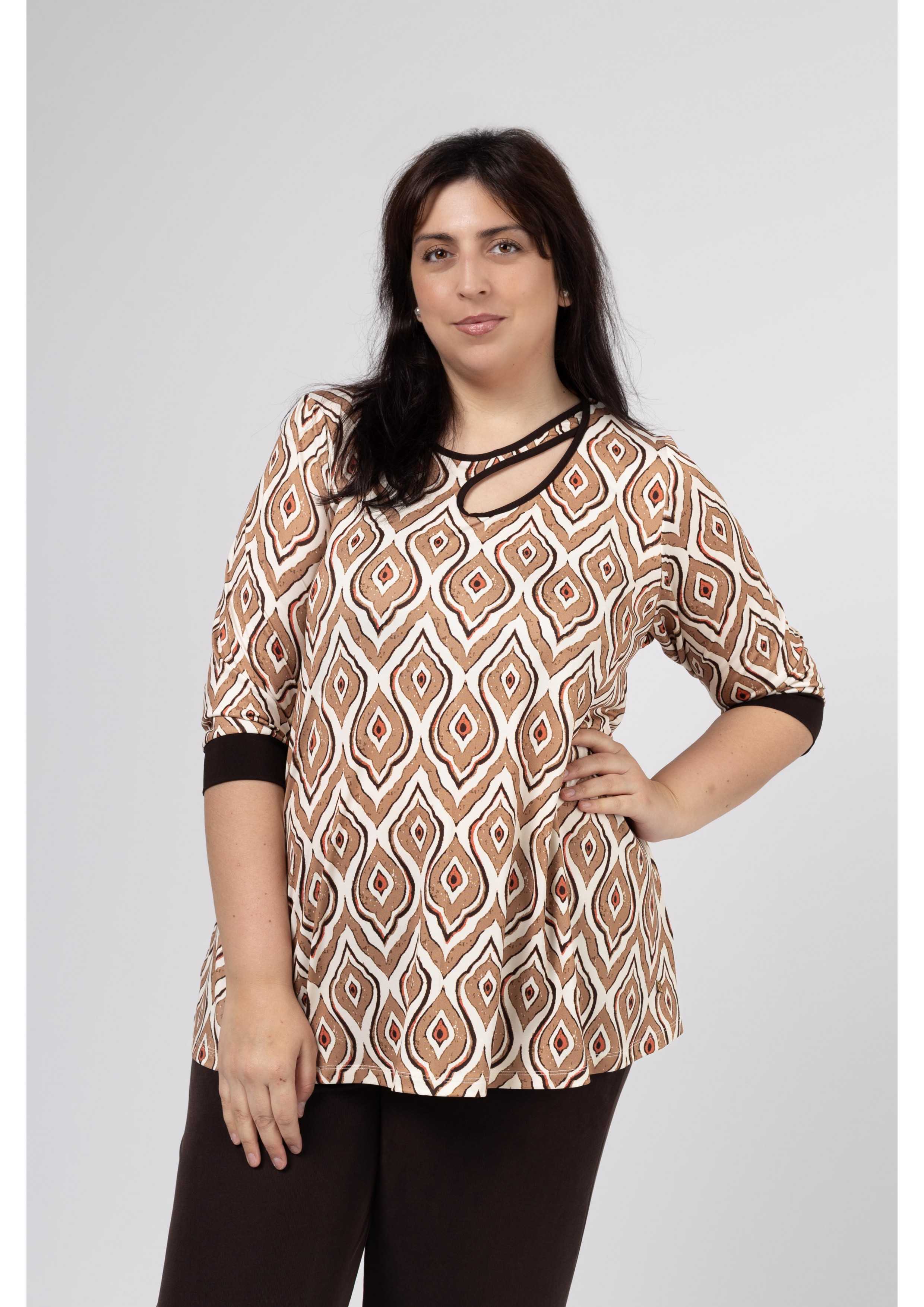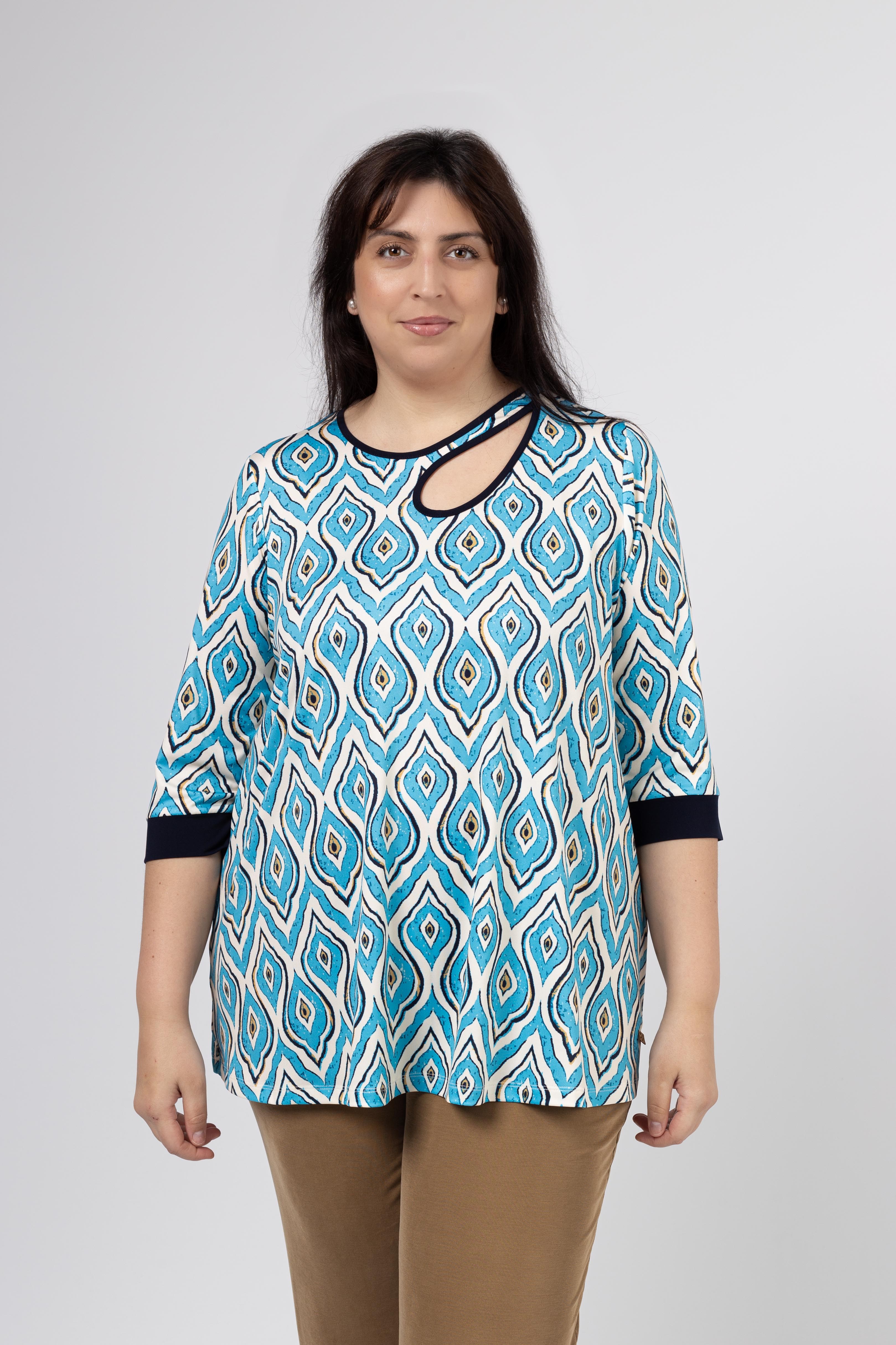 Túnica em malha estampada, manga 3/4 com punho liso, decote redondo com lágrima tombada. Modelo evasé. Disponível em Tamanhos Grandes Produto de desenho e fabrico próprio. Somos uma marca de confeção de vestuário com mais de 50 anos de experiência Modelo: Altura 1.82m e está a vestir o tamanho 3XL.
