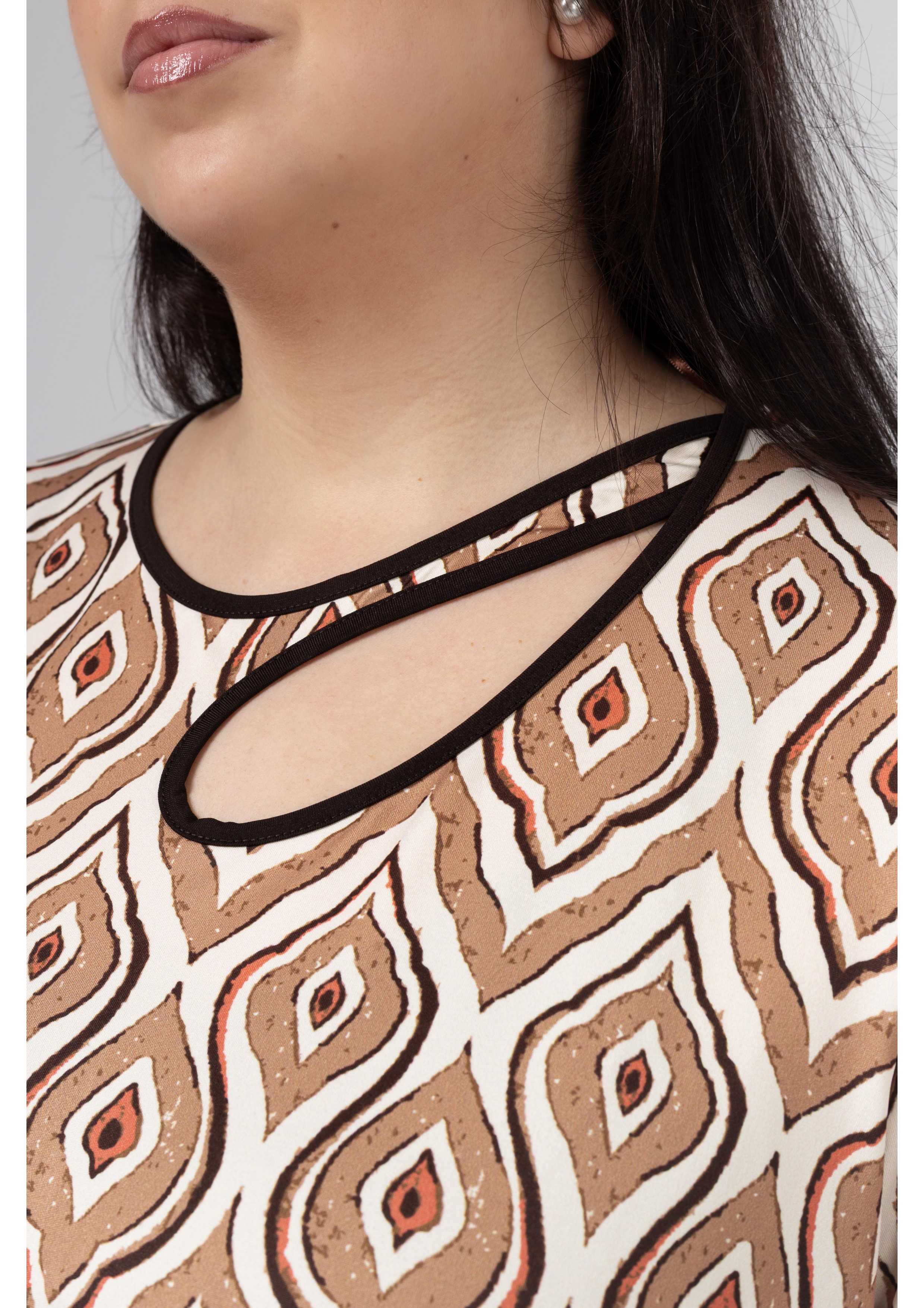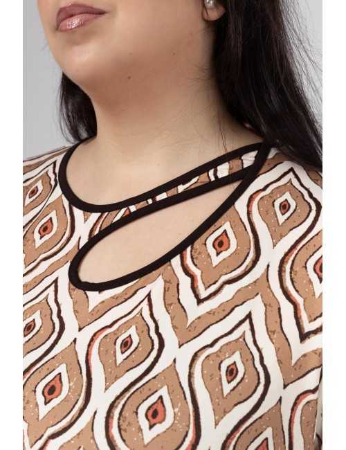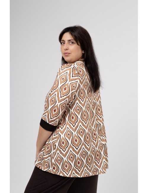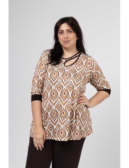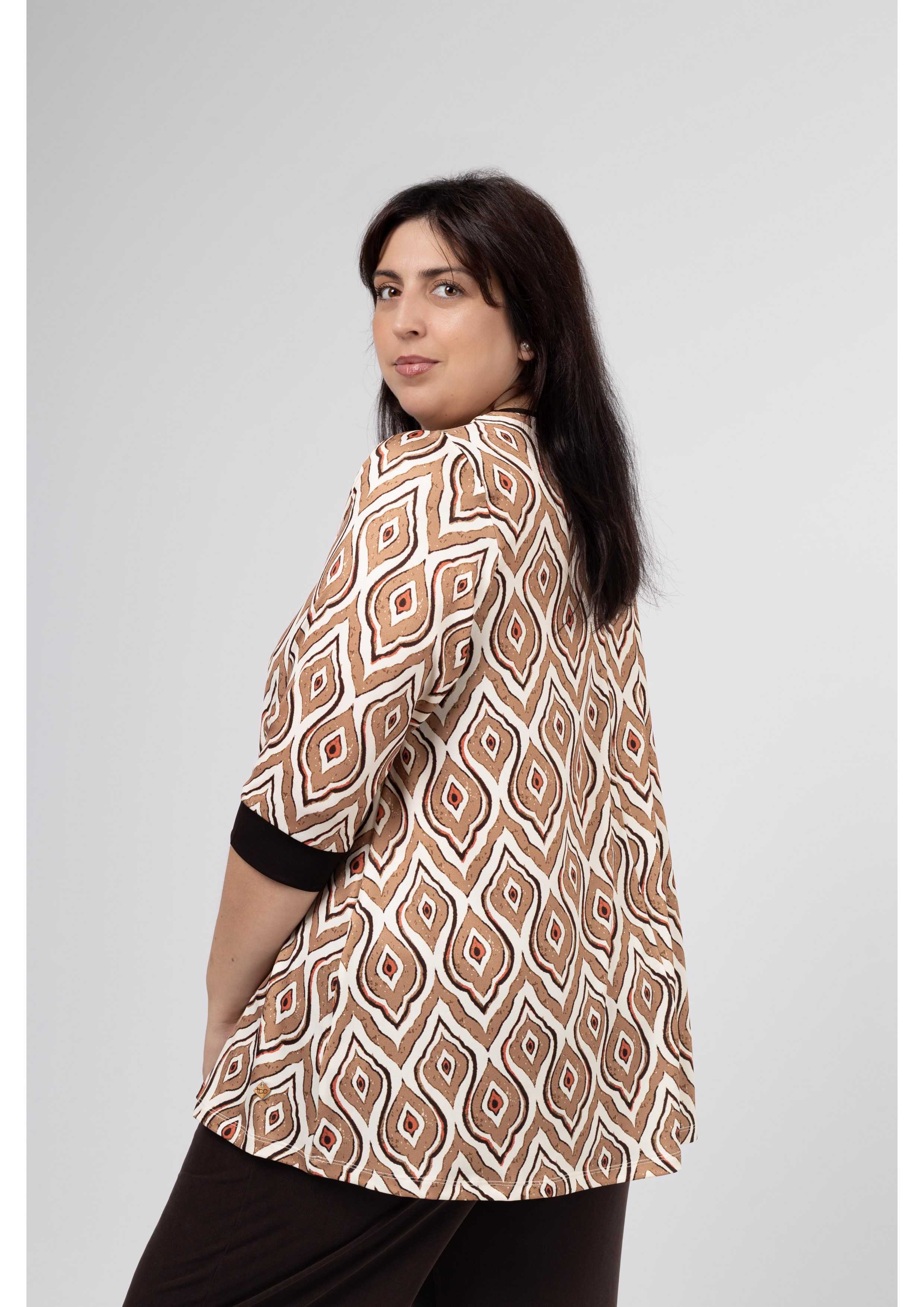 Túnica em malha estampada, manga 3/4 com punho liso, decote redondo com lágrima tombada. Modelo evasé. Disponível em Tamanhos Grandes Produto de desenho e fabrico próprio. Somos uma marca de confeção de vestuário com mais de 50 anos de experiência Modelo: Altura 1.82m e está a vestir o tamanho 3XL.