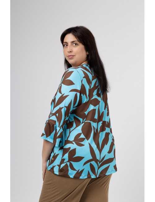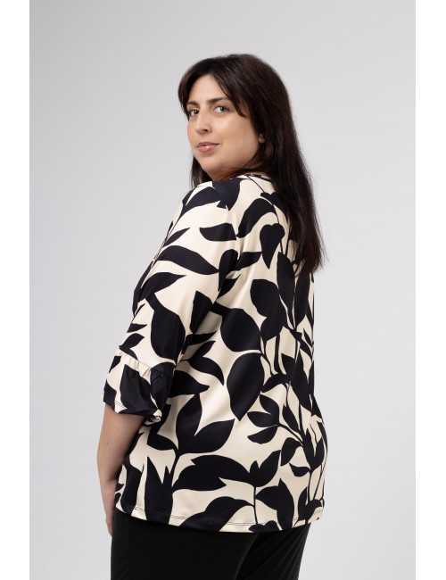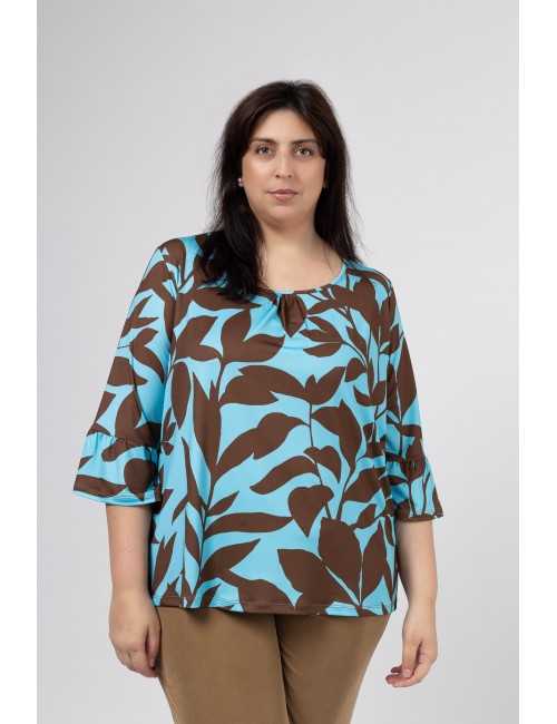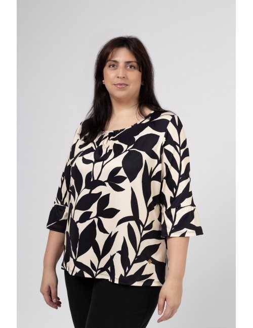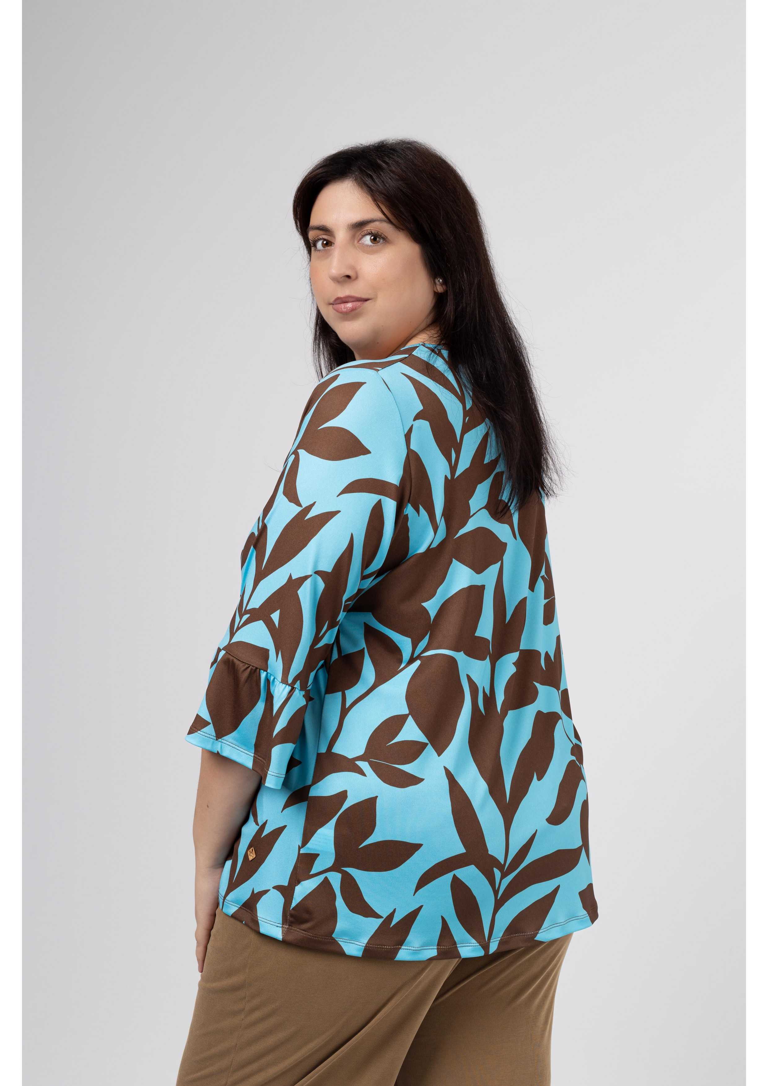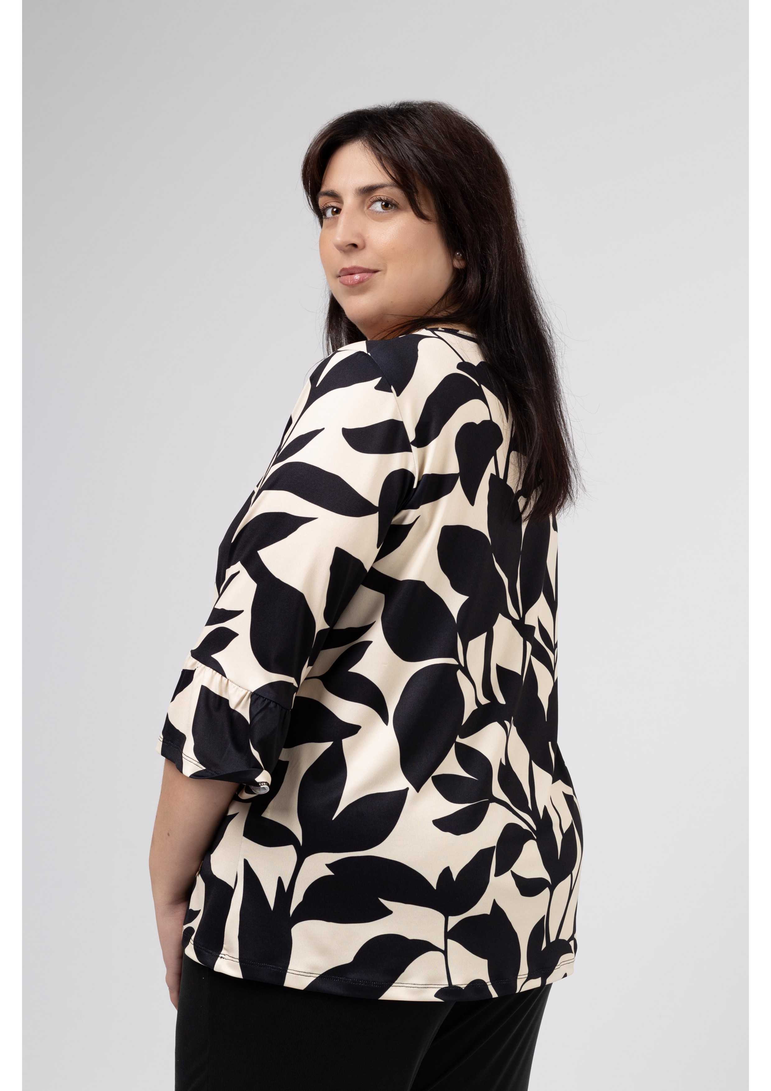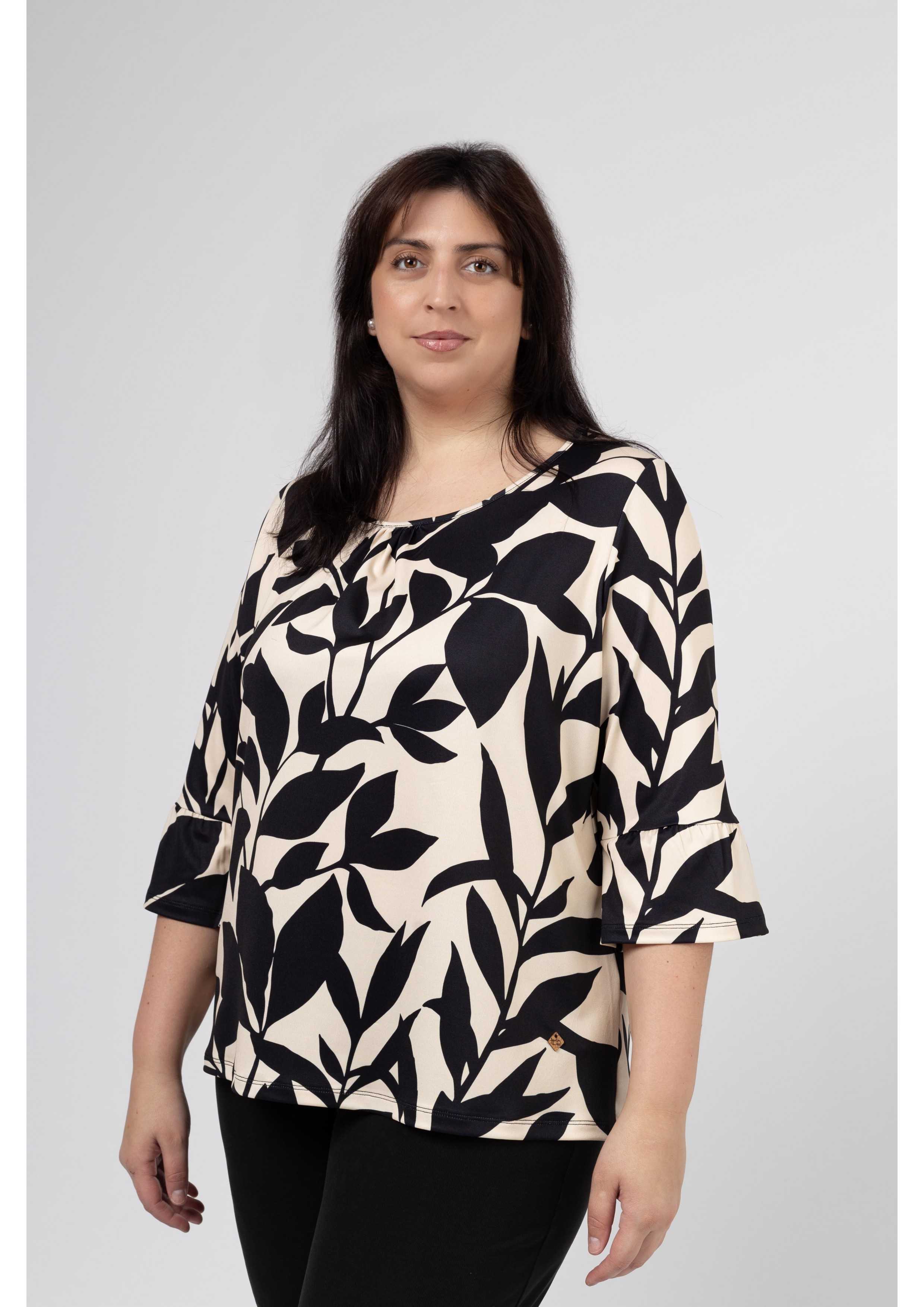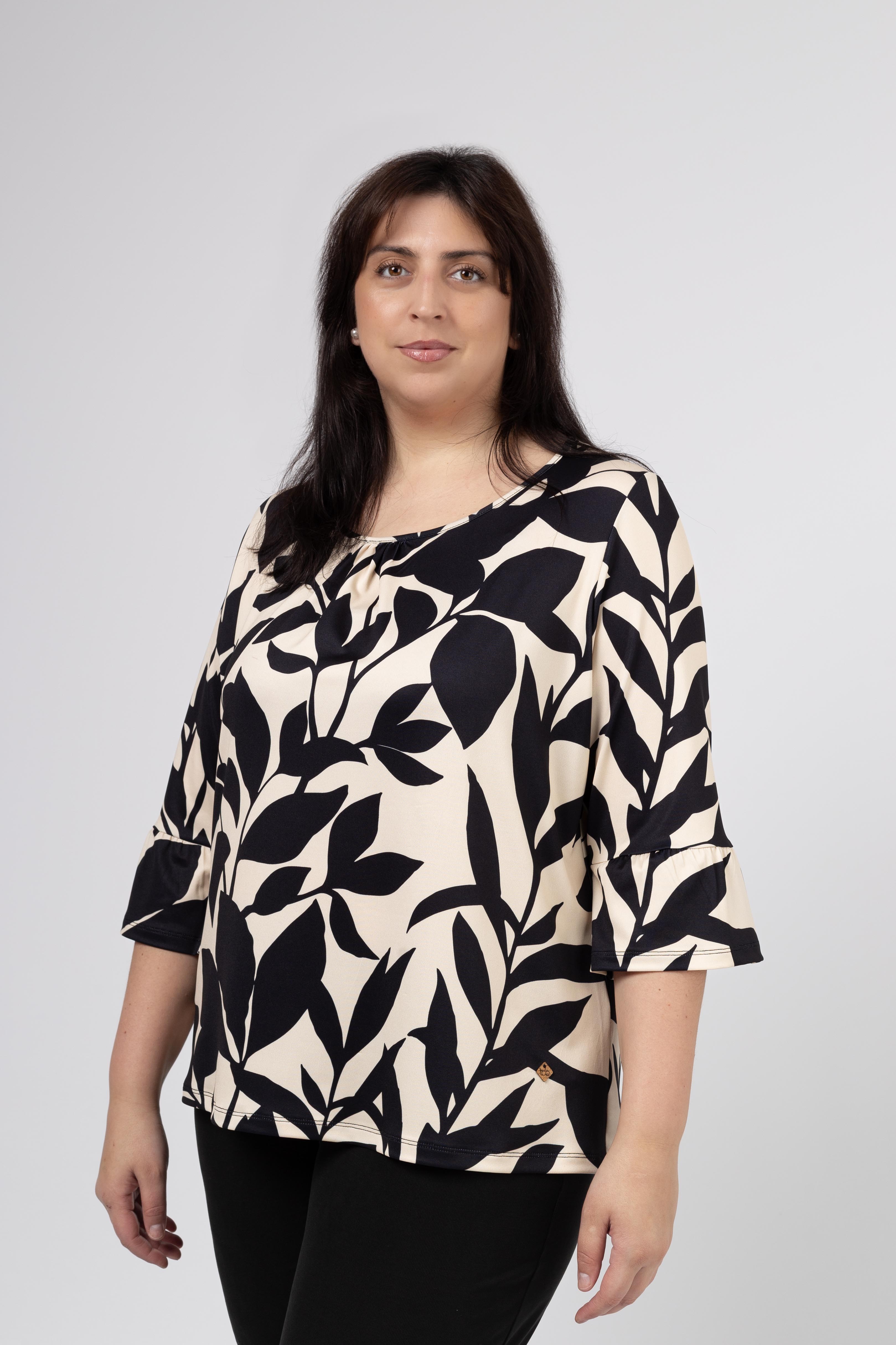 Túnica em malha estampada, manga 3/4 com folho, decote redondo com ligeira franza centro frente. Disponível em Tamanhos Grandes Produto de desenho e fabrico próprio. Somos uma marca de confeção de vestuário com mais de 50 anos de experiência Modelo: Altura 1.82m e está a vestir o tamanho 3XL.