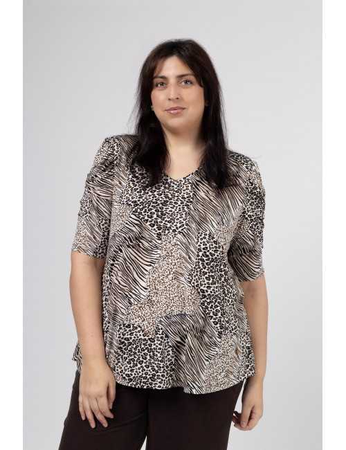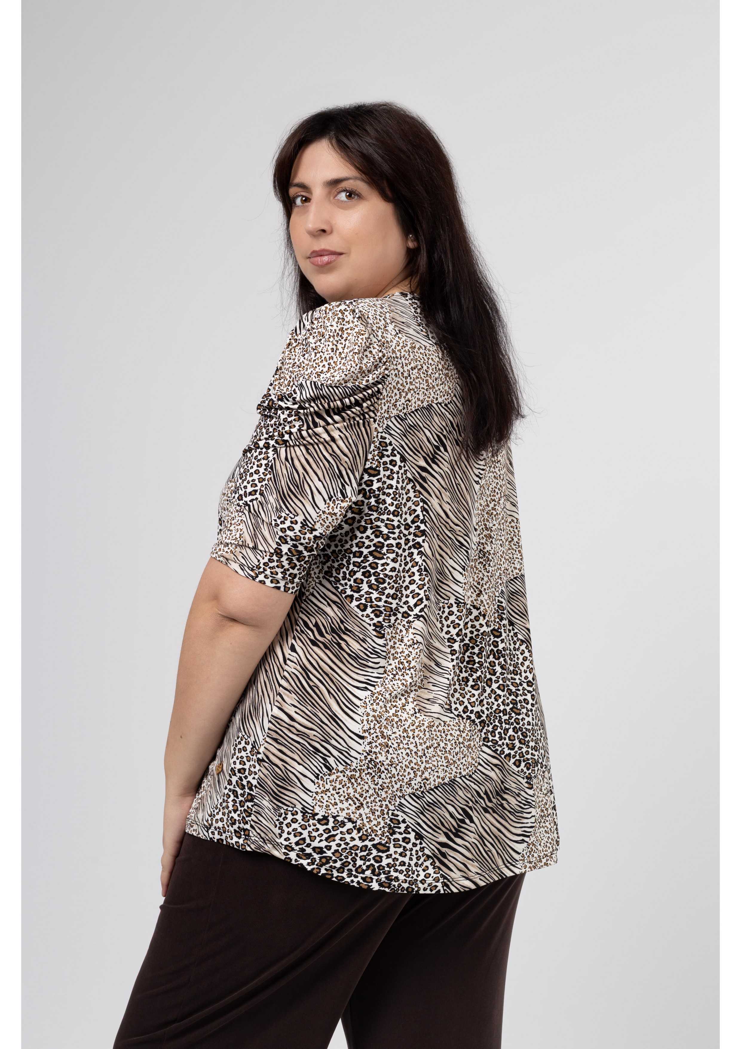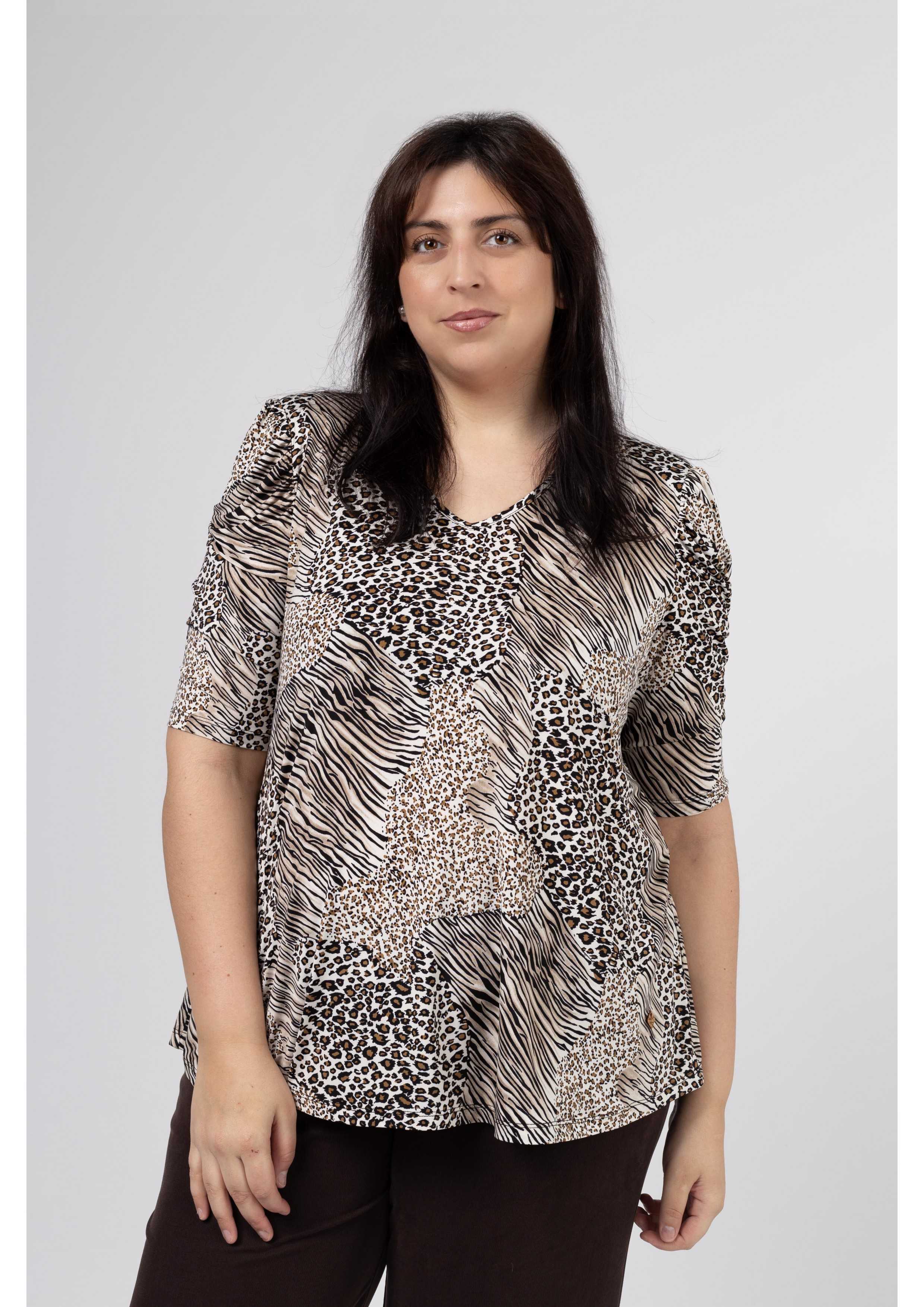 Túnica em malha estampada, modelo ligeiramete evasé, base arredondada. Decote em bico com cravado. Manga 3/4 com franza nos ombros e com ombreiras.