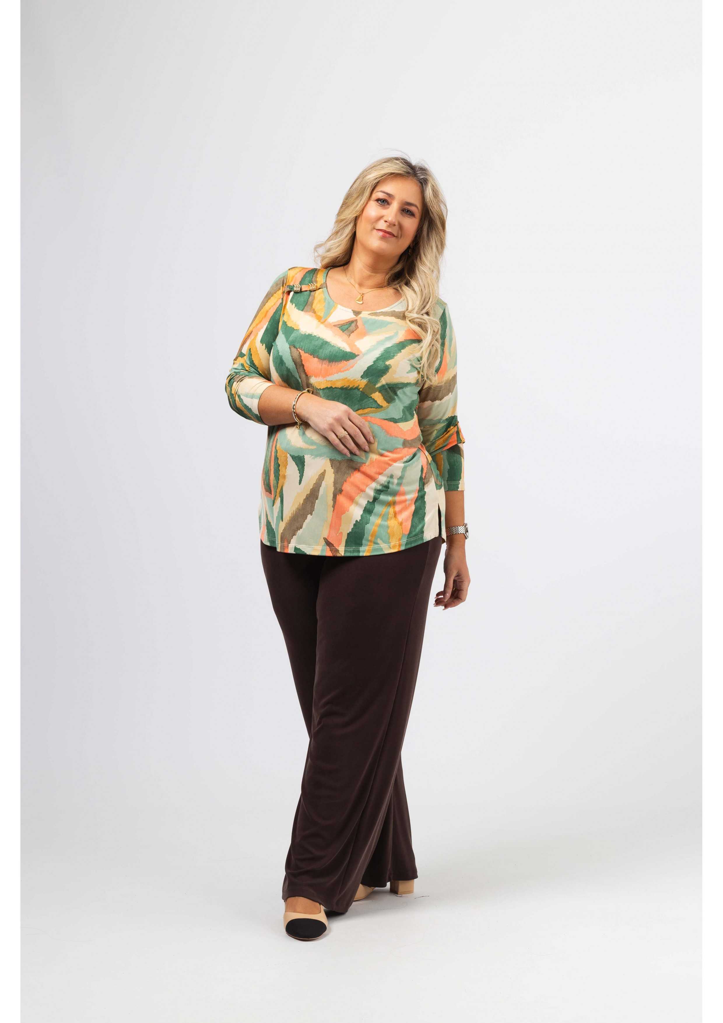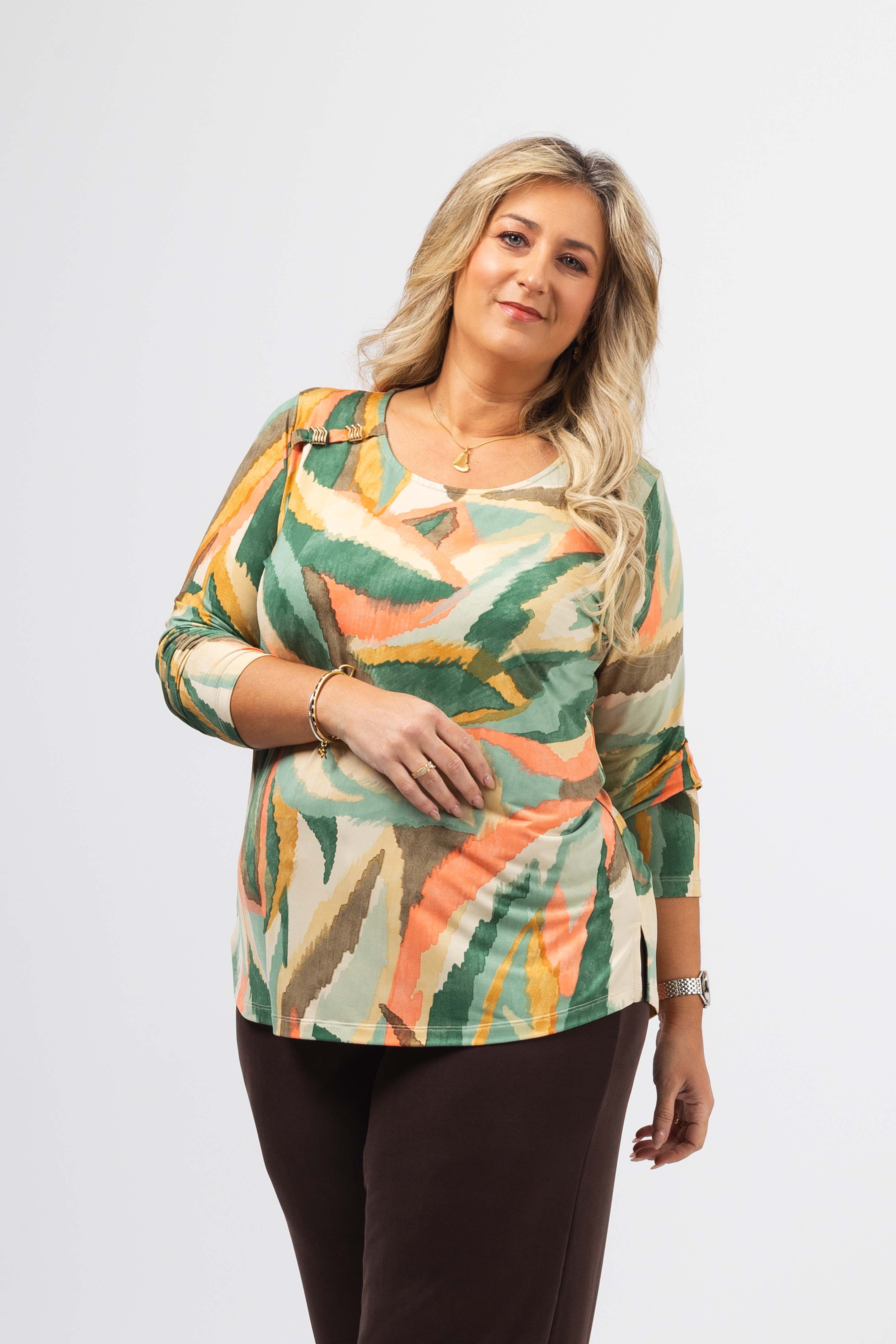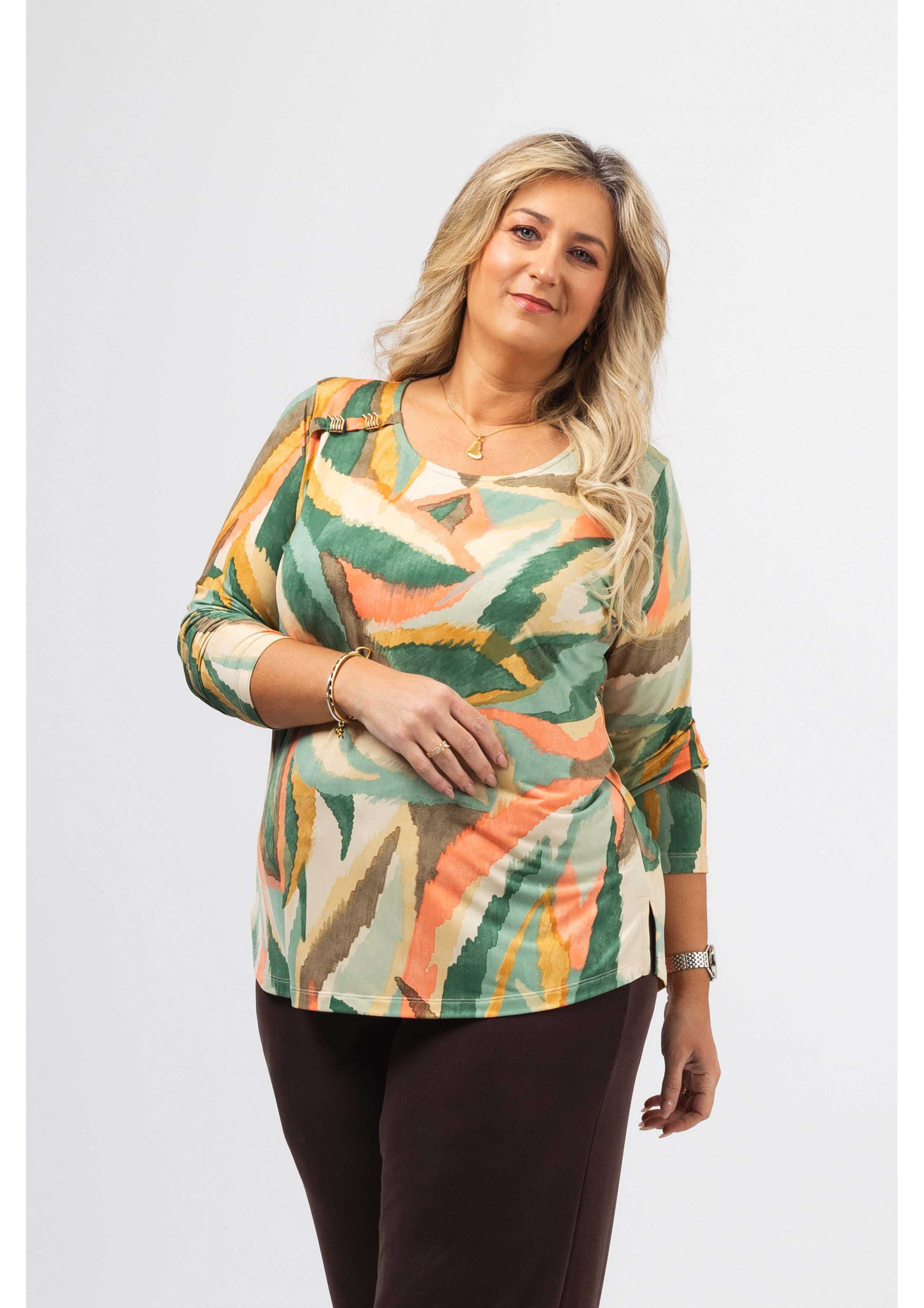 Túnica em malha estampada, manga comprida decote redondo. Duas aplicações metálicas na frente lateral do ombro. Rachas laterais. Disponível em Tamanhos Grandes Produto de desenho e fabrico próprio. Somos uma marca de confeção de vestuário com mais de 50 anos de experiência Modelo: Altura 1.65m e está a vestir o tamanho 2XL.