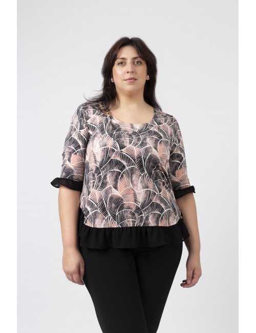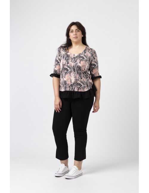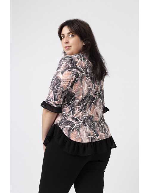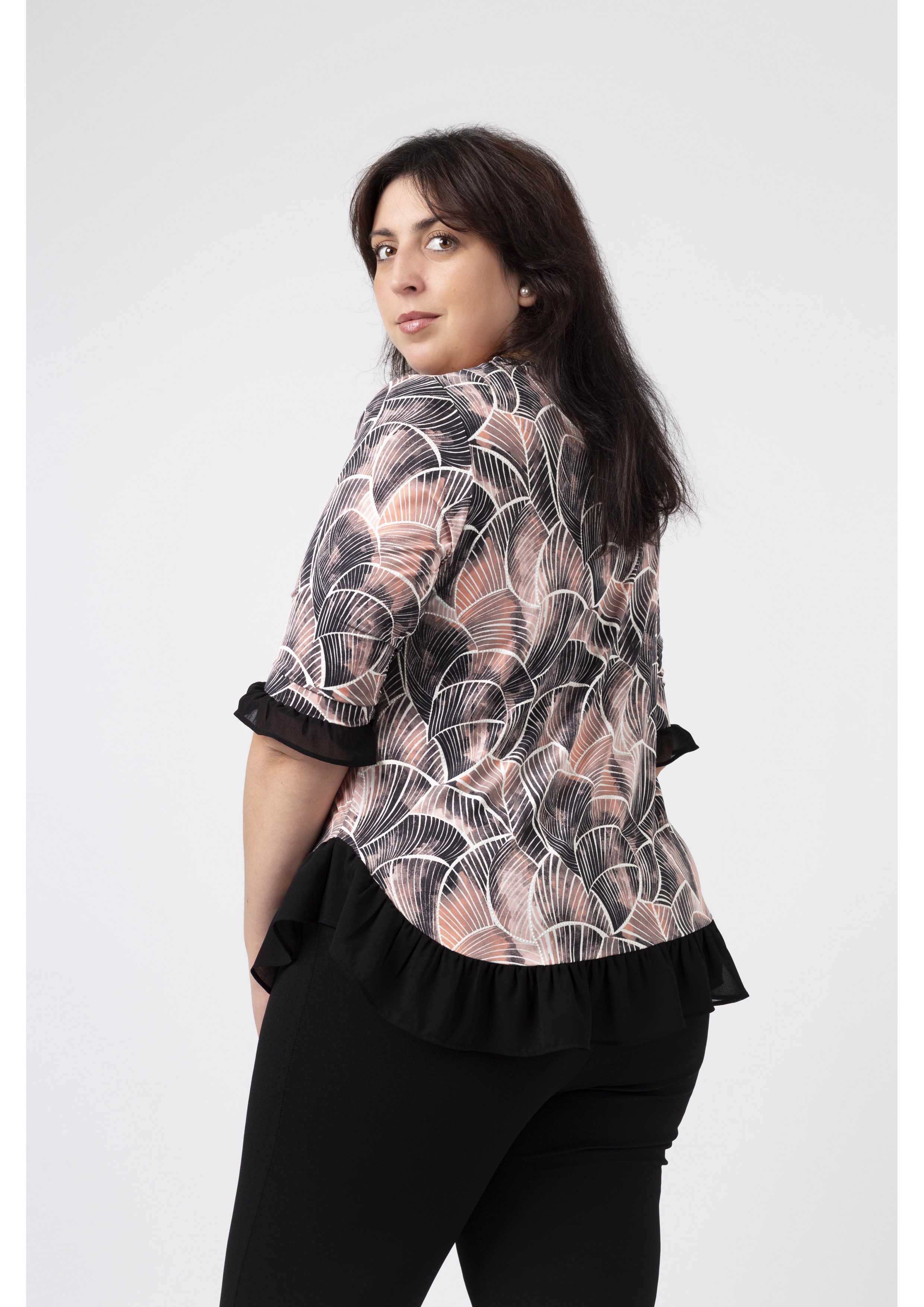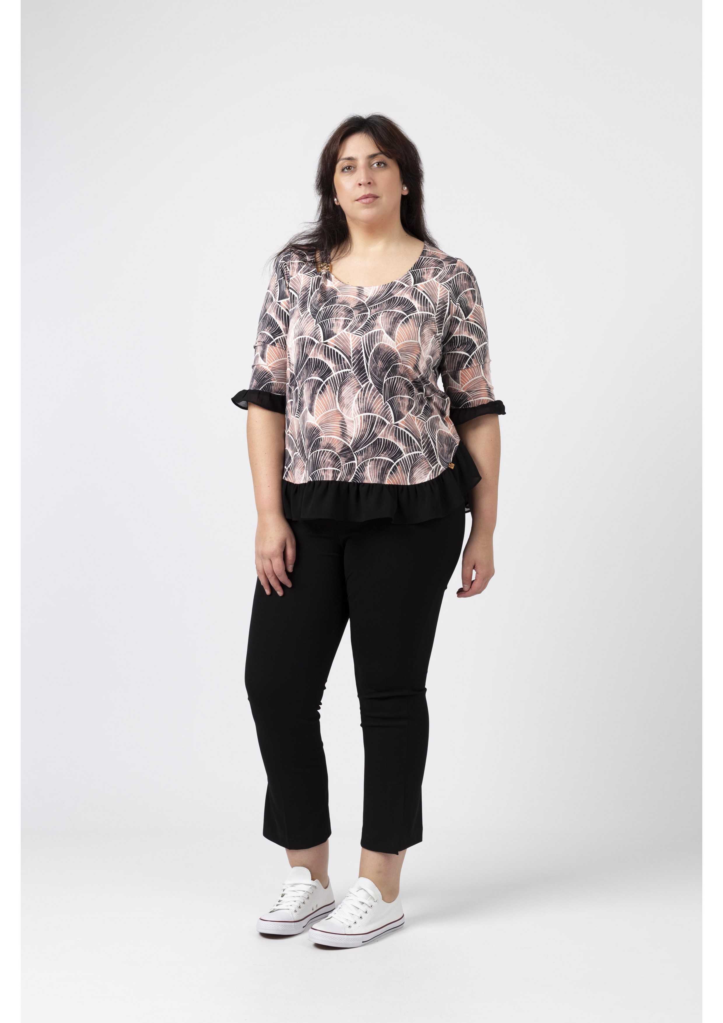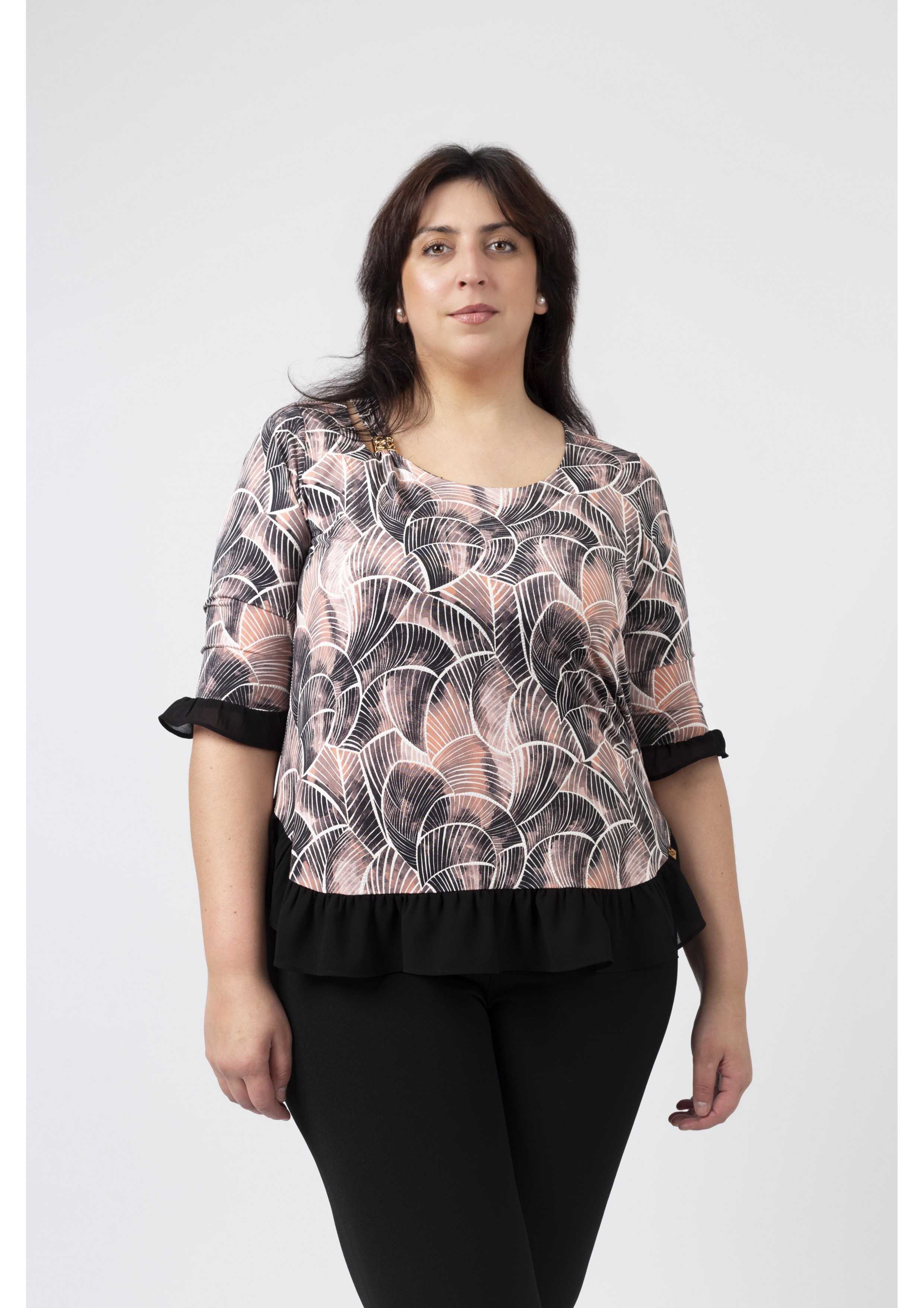 Túnica em malha estampada tons pretos, decote redondo com lágrima fechada no ombro lateral e aplique metálico, Manga 3/4. Folho liso franzido na base da peça e na base da manga.