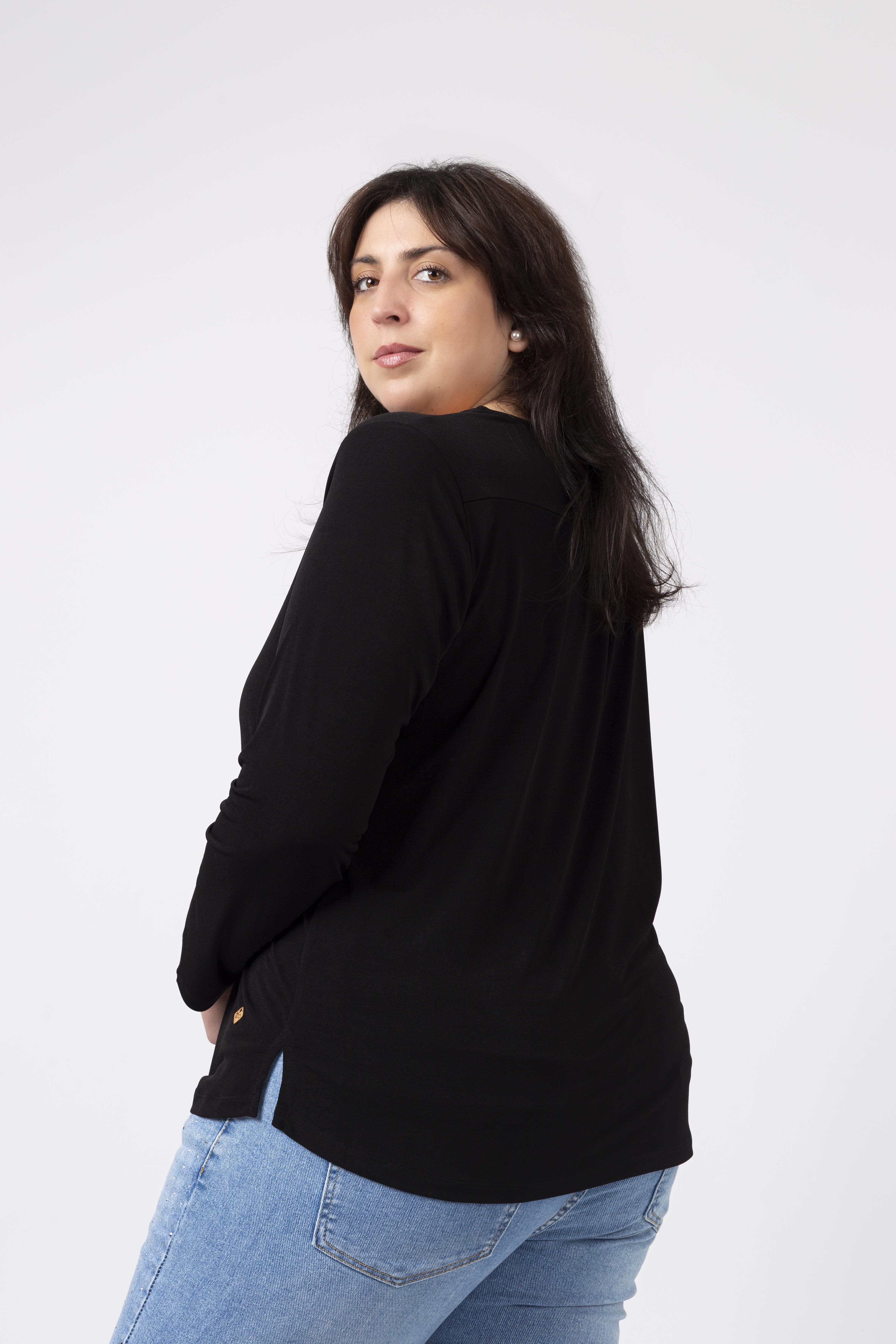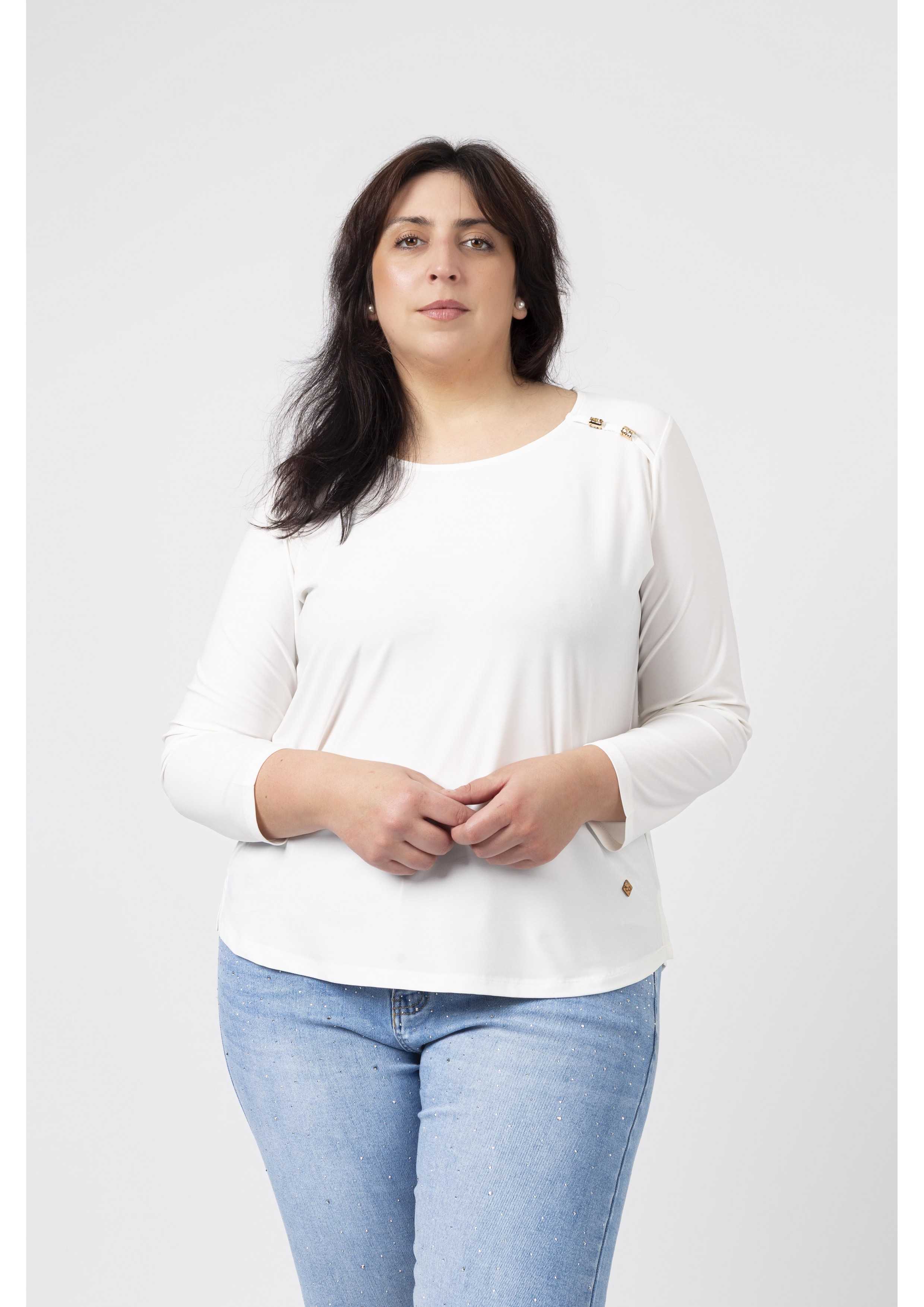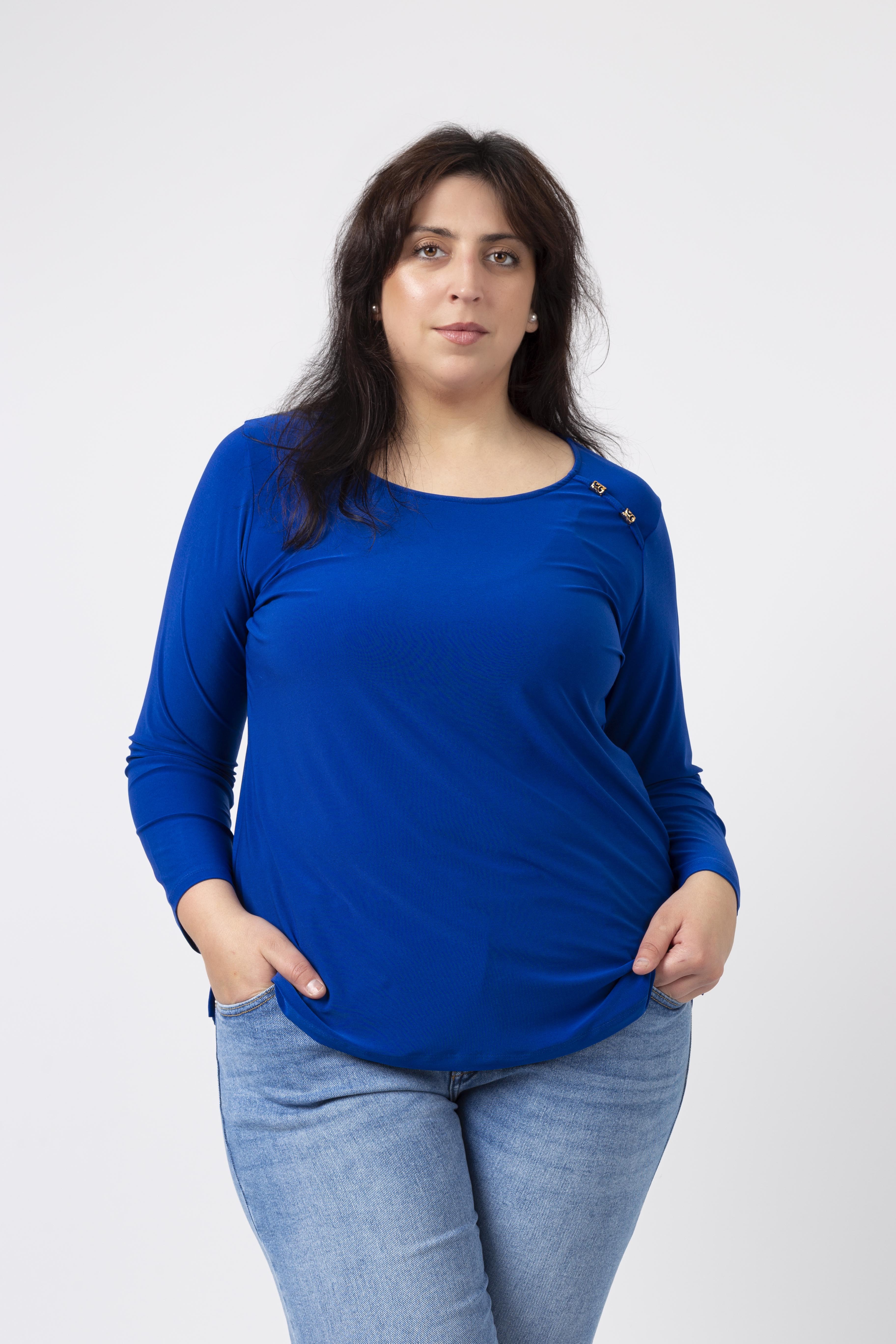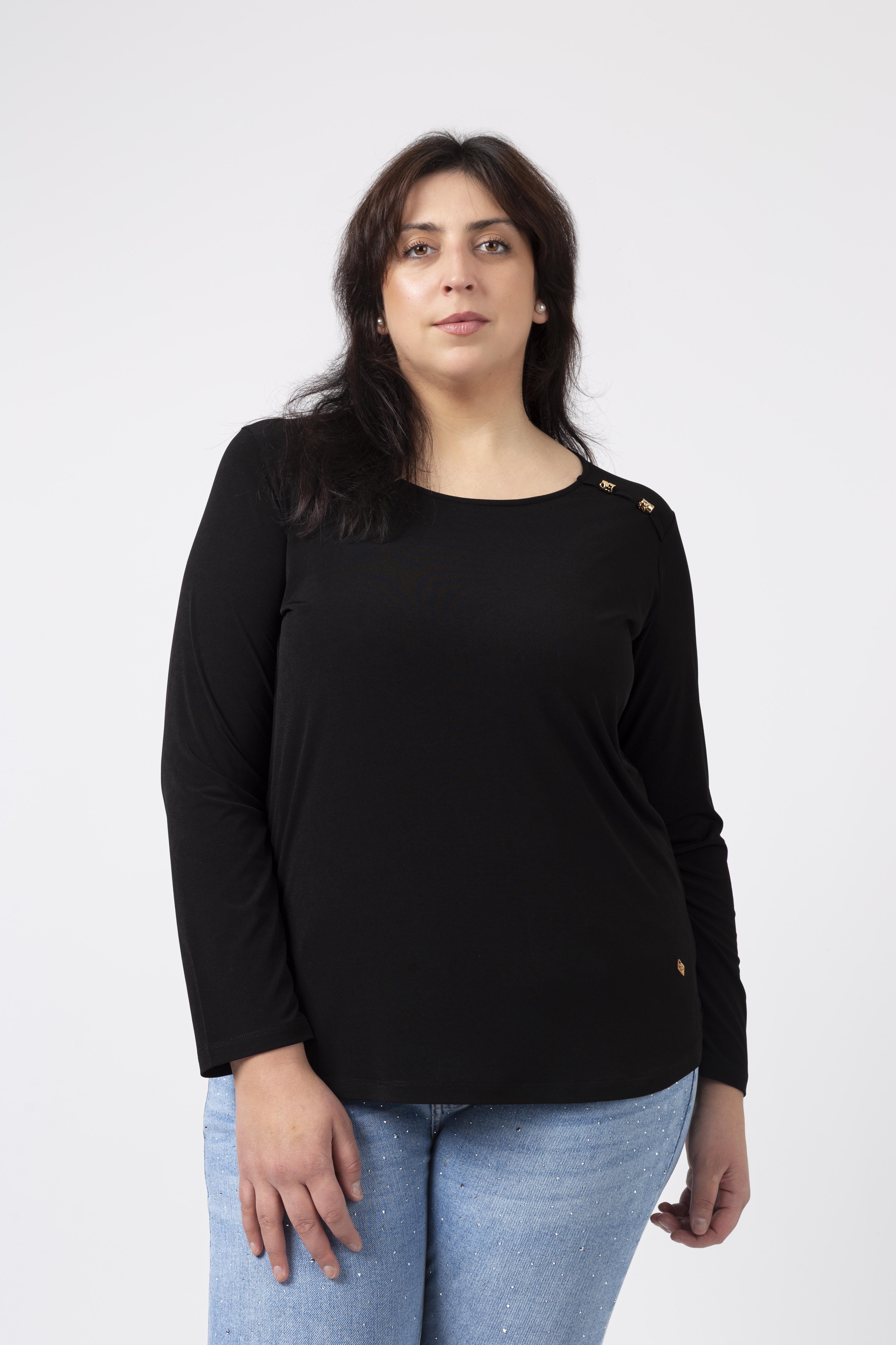 Túnica em malha lisa, manga comprida decote redondo. Duas aplicações metálicas na frente lateral do ombro. Rachas laterais. Disponível em Tamanhos Grandes Produto de desenho e fabrico próprio. Somos uma marca de confeção de vestuário com mais de 50 anos de experiência Modelo: Altura 1.82m e está a vestir o tamanho 3XL.