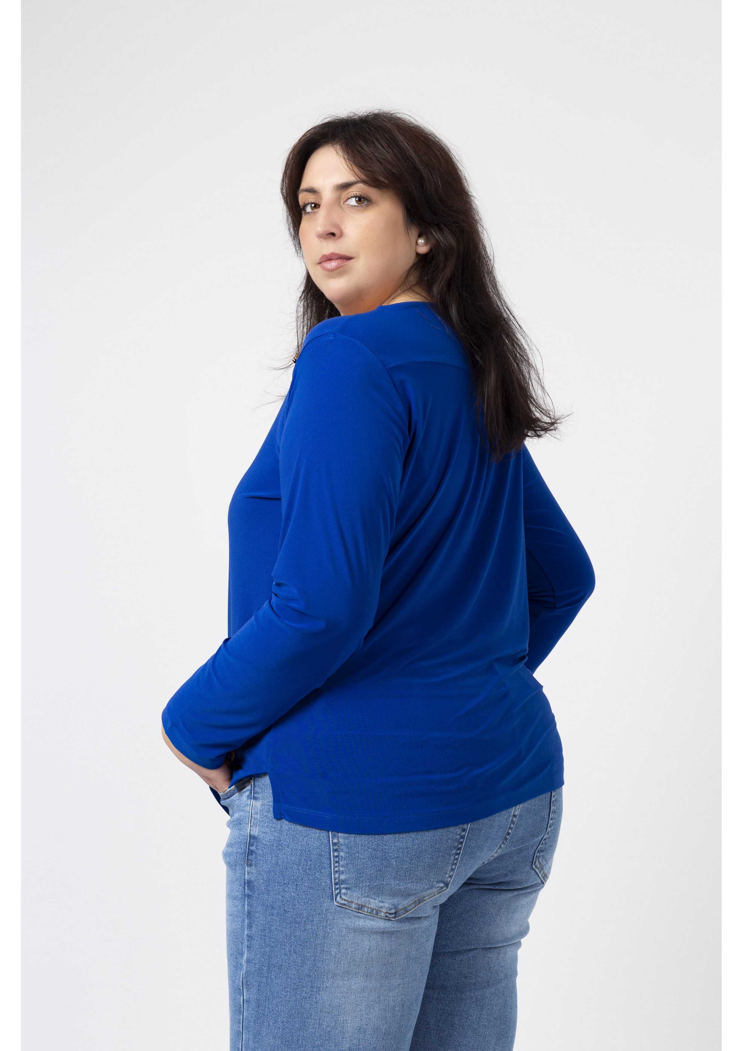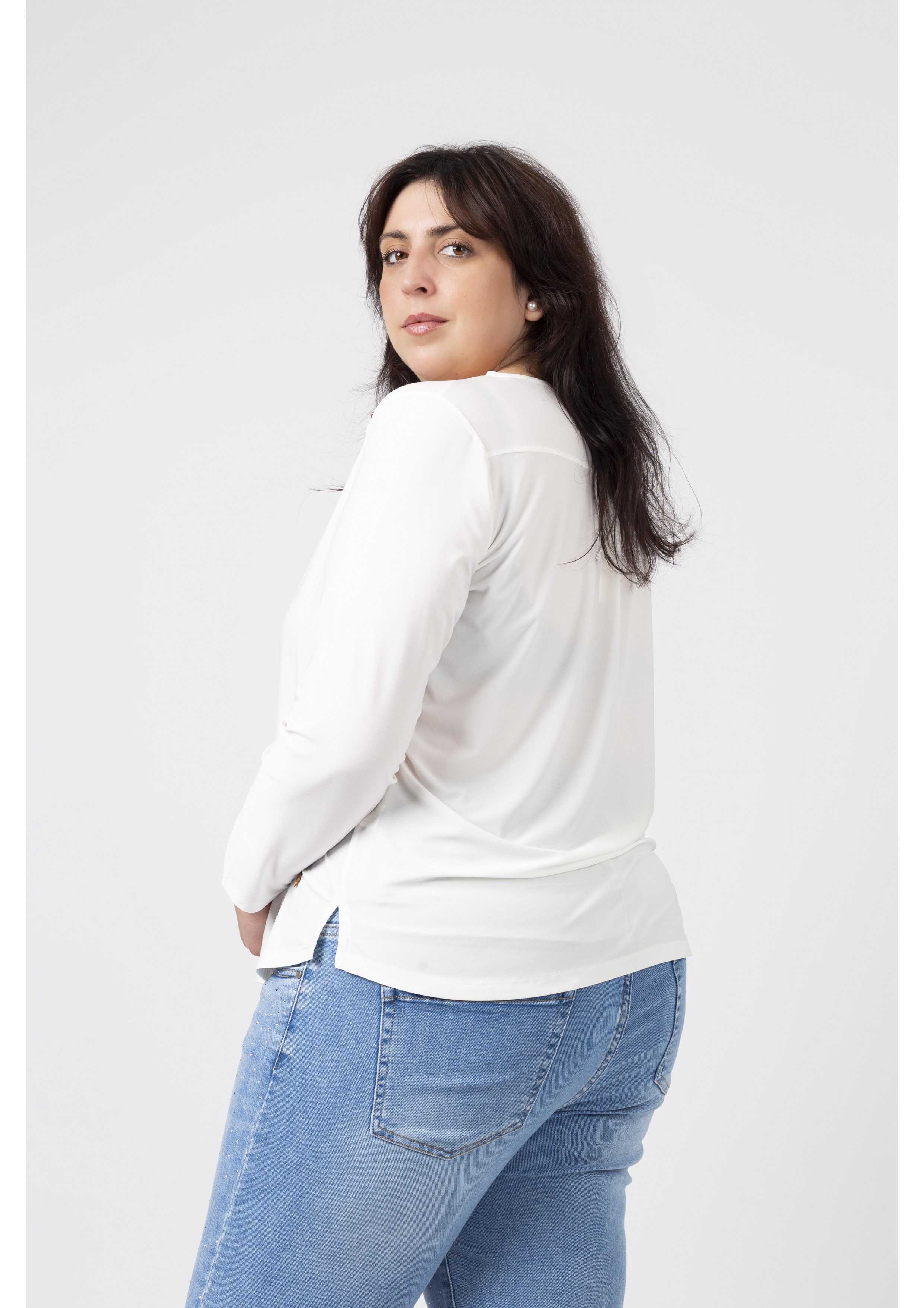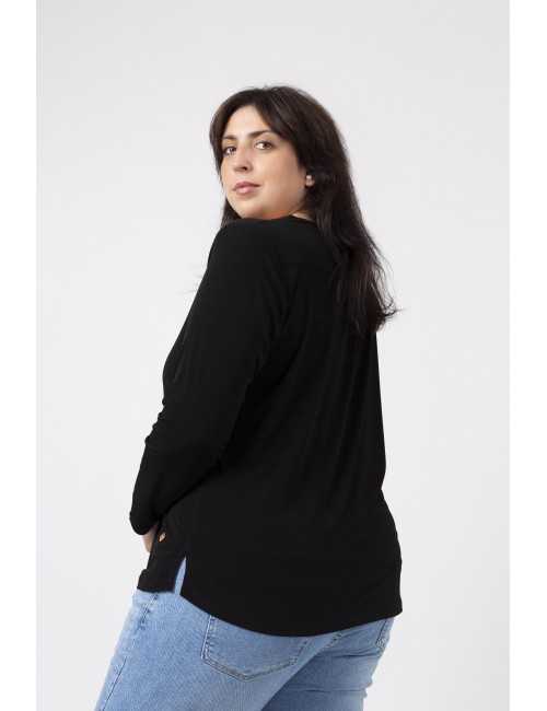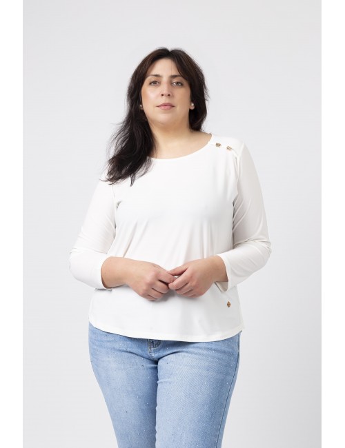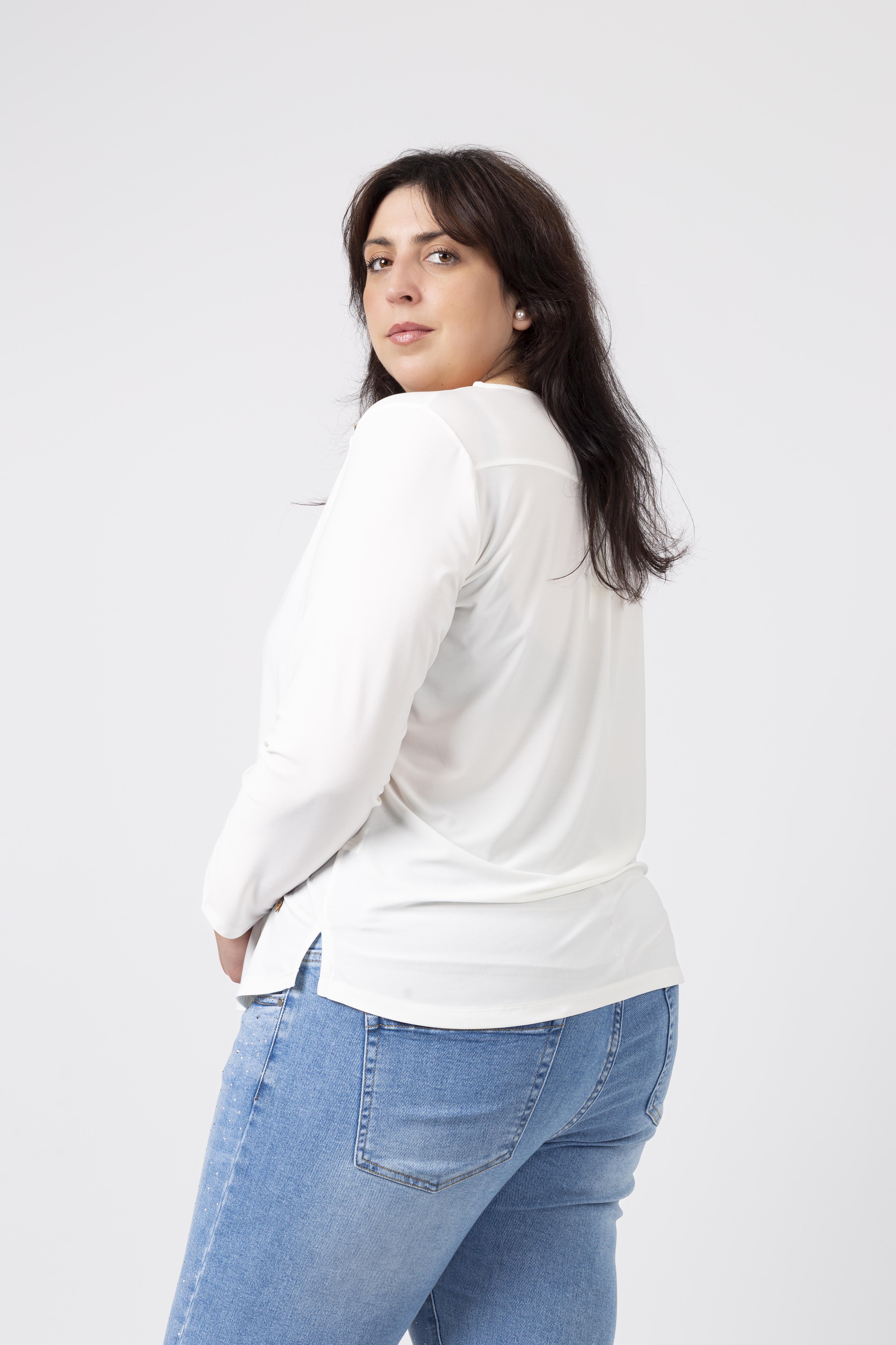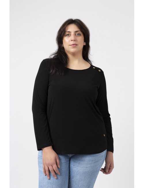 Túnica em malha lisa, manga comprida decote redondo. Duas aplicações metálicas na frente lateral do ombro. Rachas laterais. Disponível em Tamanhos Grandes Produto de desenho e fabrico próprio. Somos uma marca de confeção de vestuário com mais de 50 anos de experiência Modelo: Altura 1.82m e está a vestir o tamanho 3XL.