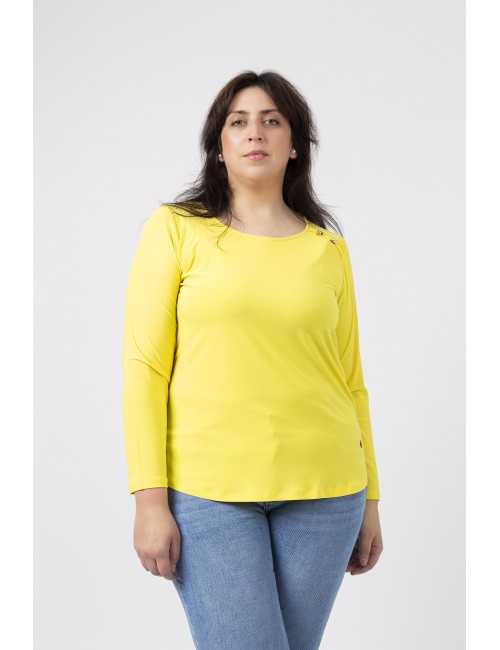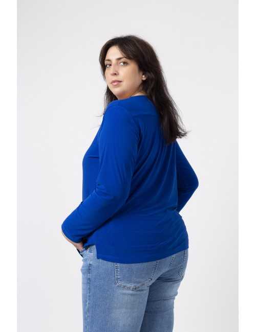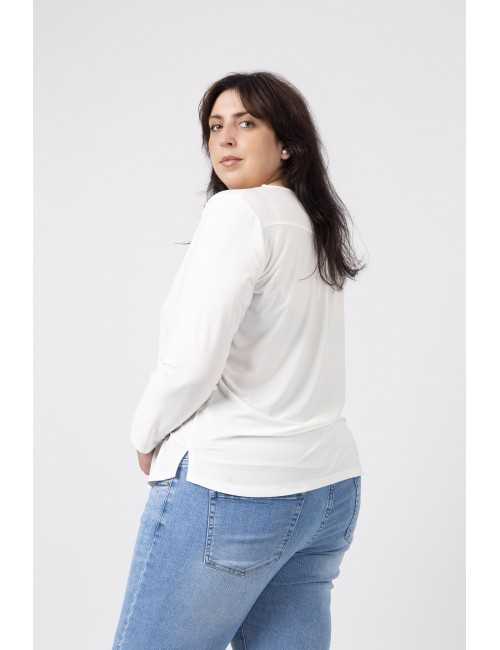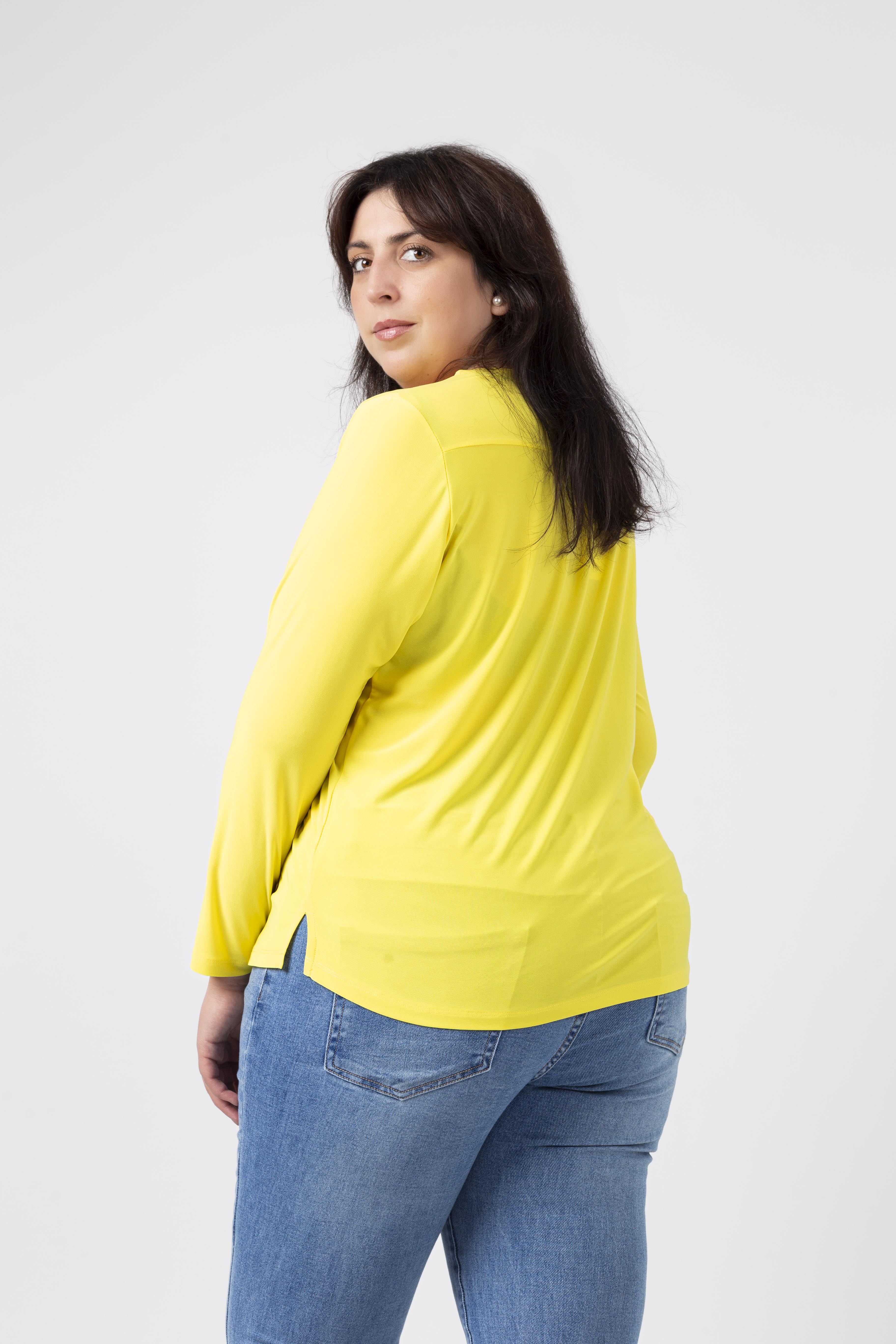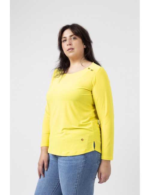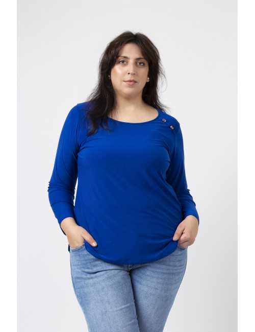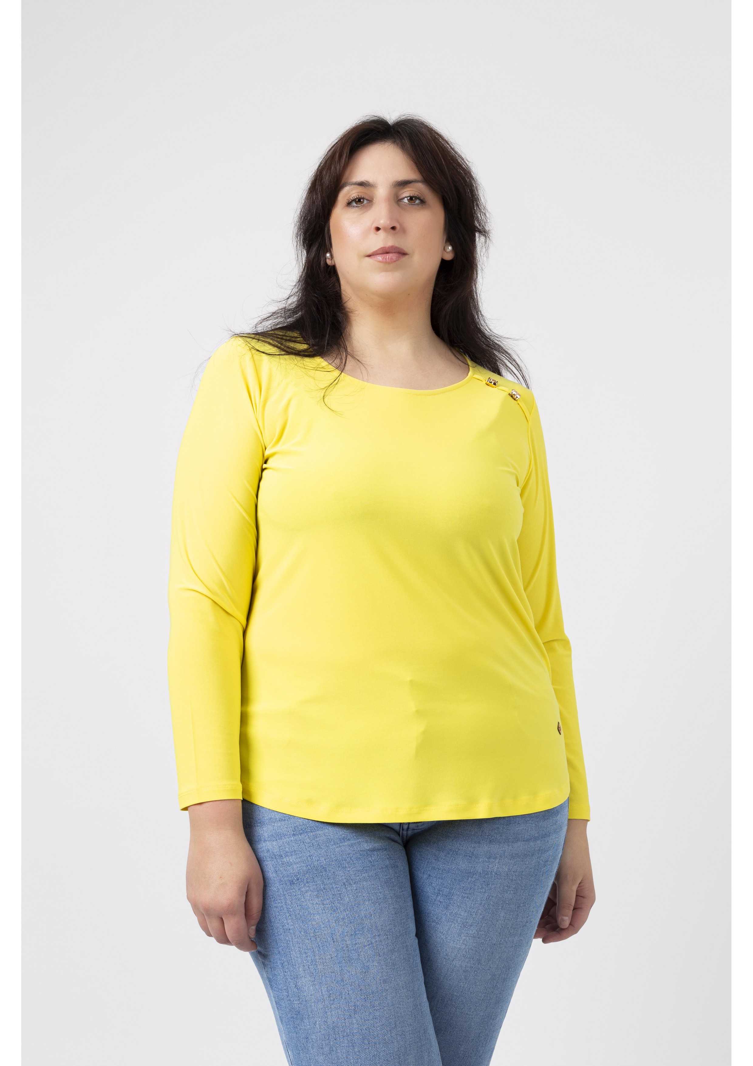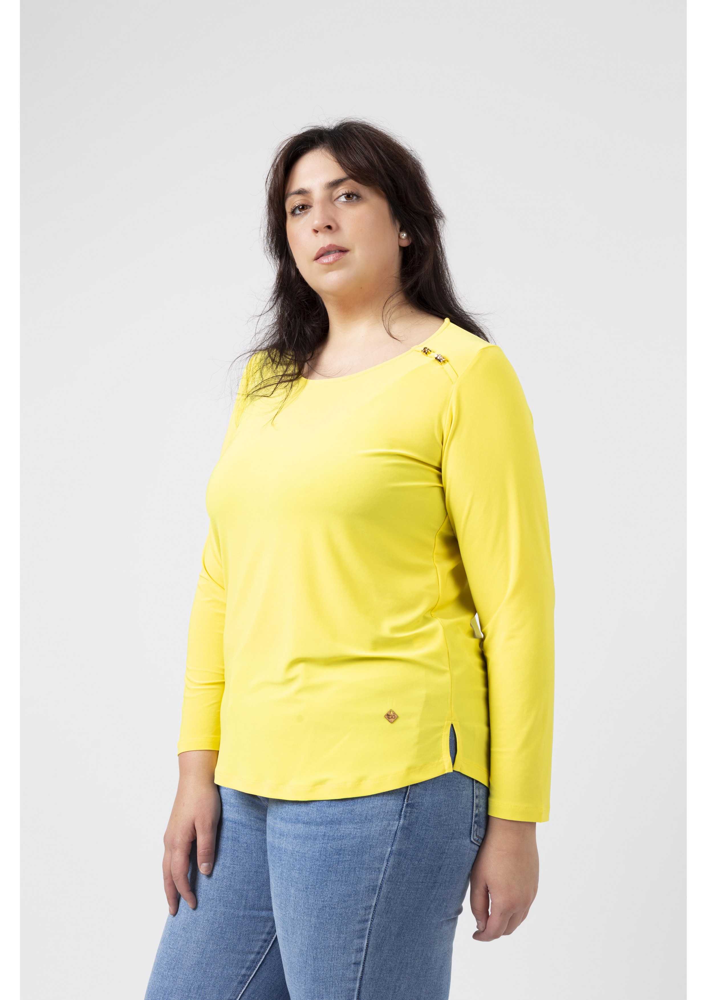 Túnica em malha lisa, manga comprida decote redondo. Duas aplicações metálicas na frente lateral do ombro. Rachas laterais. Disponível em Tamanhos Grandes Produto de desenho e fabrico próprio. Somos uma marca de confeção de vestuário com mais de 50 anos de experiência Modelo: Altura 1.82m e está a vestir o tamanho 3XL.