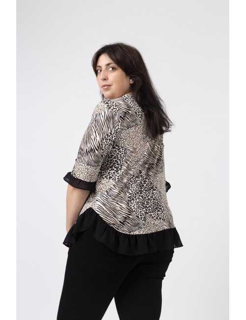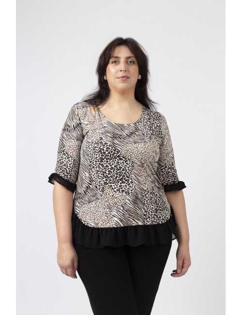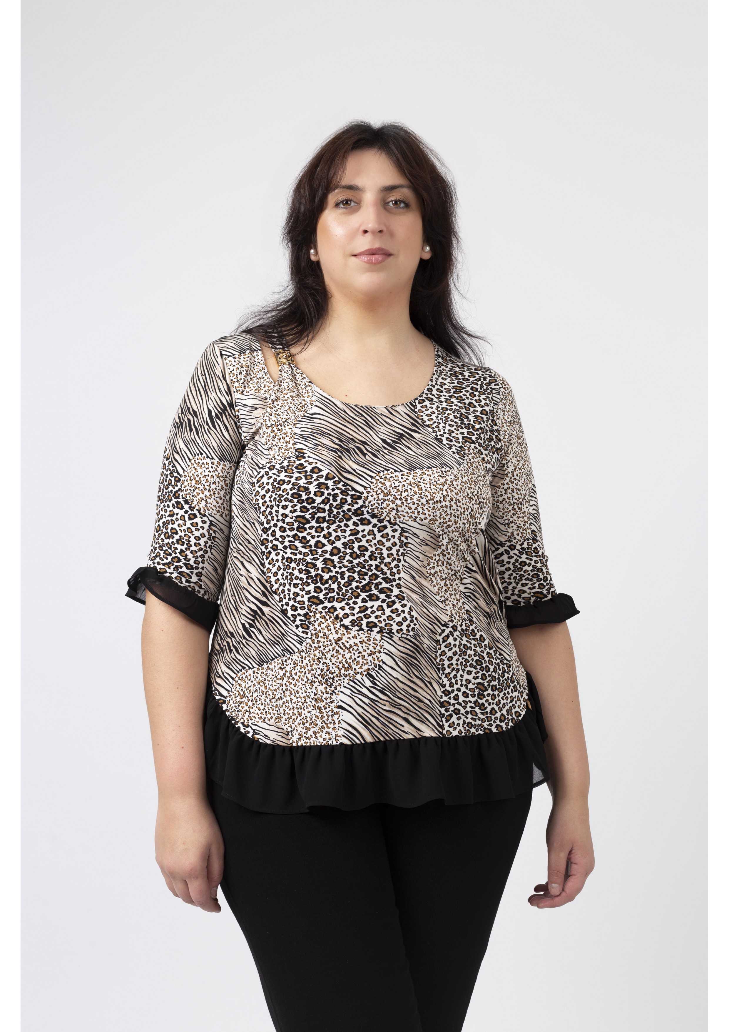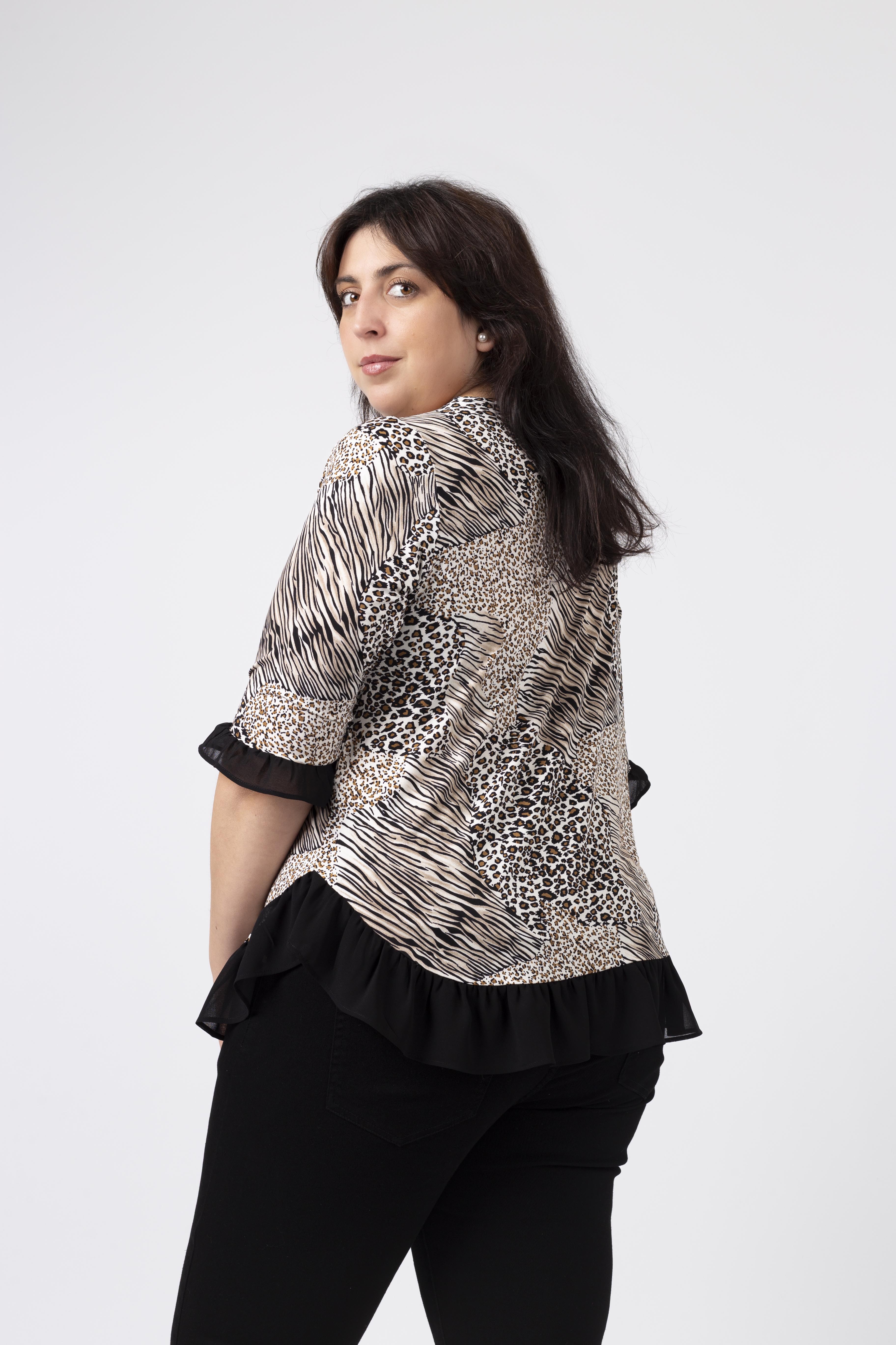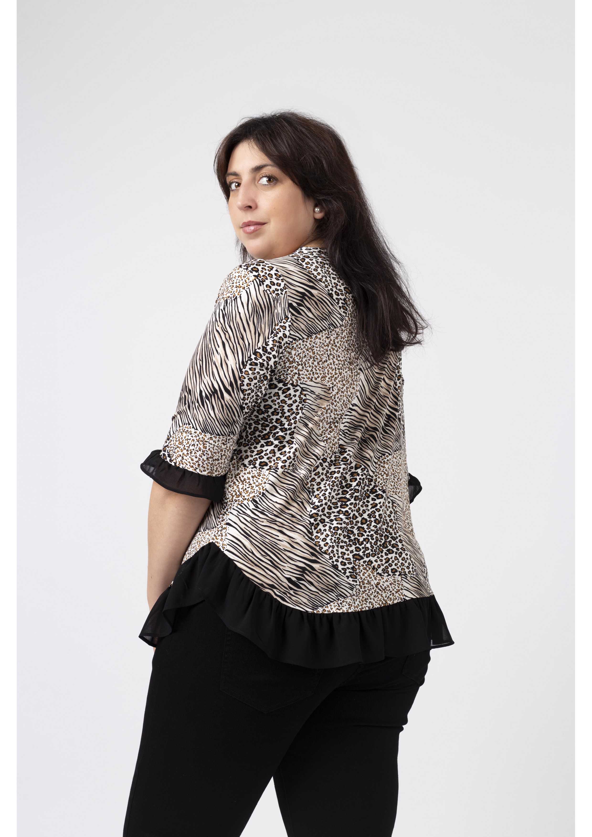 Túnica em malha estampada tons pretos, decote redondo com lágrima fechada no ombro lateral e aplique metálico, Manga 3/4. Folho liso franzido na base da peça e na base da manga. Disponível em Tamanhos Grandes Produto de desenho e fabrico próprio. Somos uma marca de confeção de vestuário com mais de 50 anos de experiência Modelo: Altura 1.82m e está a vestir o tamanho 3XL.