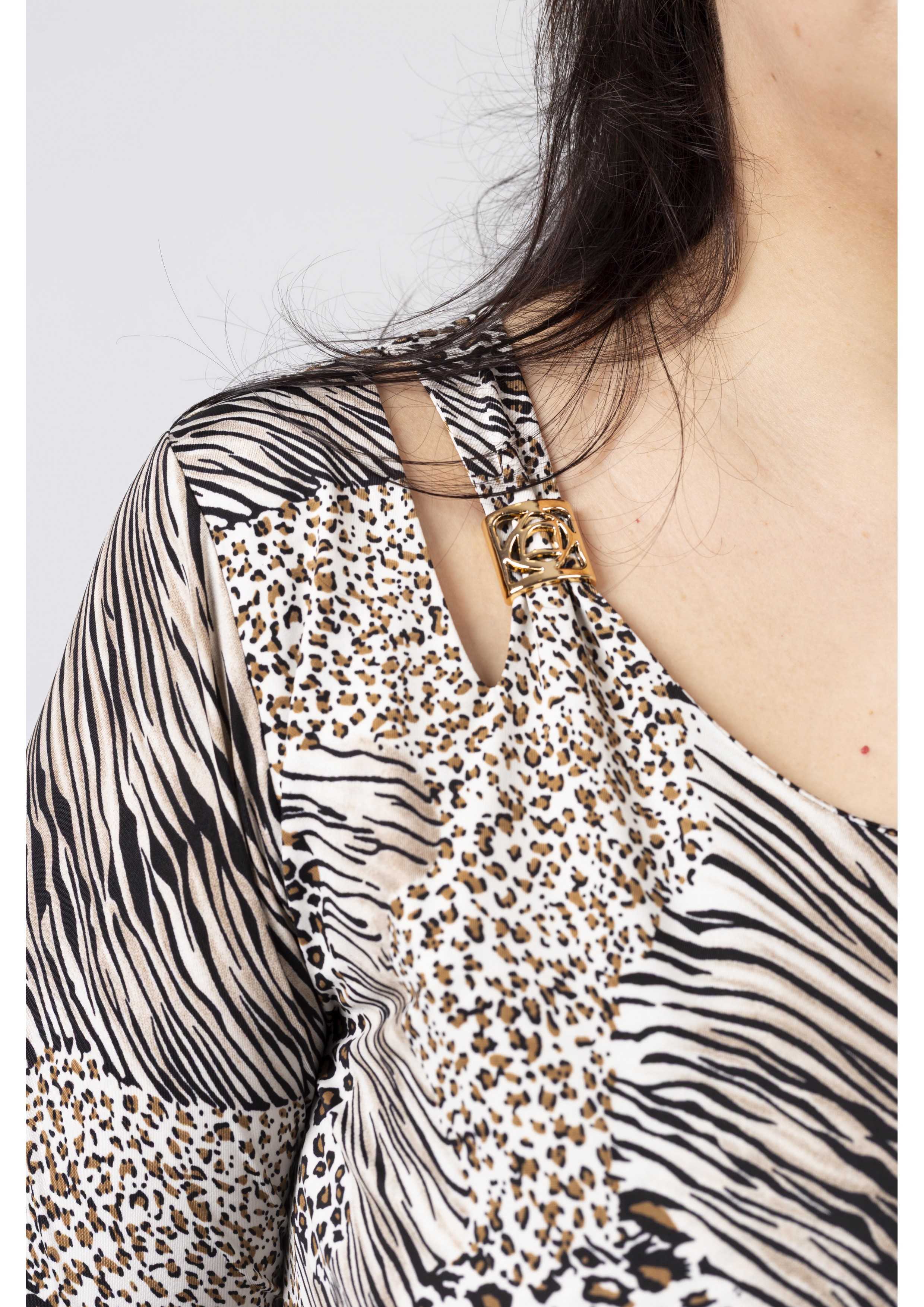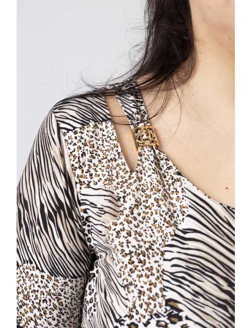 Túnica em malha estampada tons pretos, decote redondo com lágrima fechada no ombro lateral e aplique metálico, Manga 3/4. Folho liso franzido na base da peça e na base da manga.