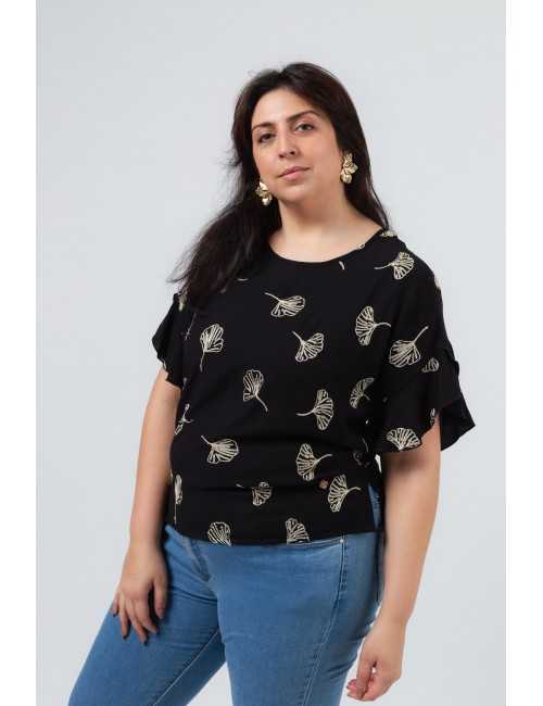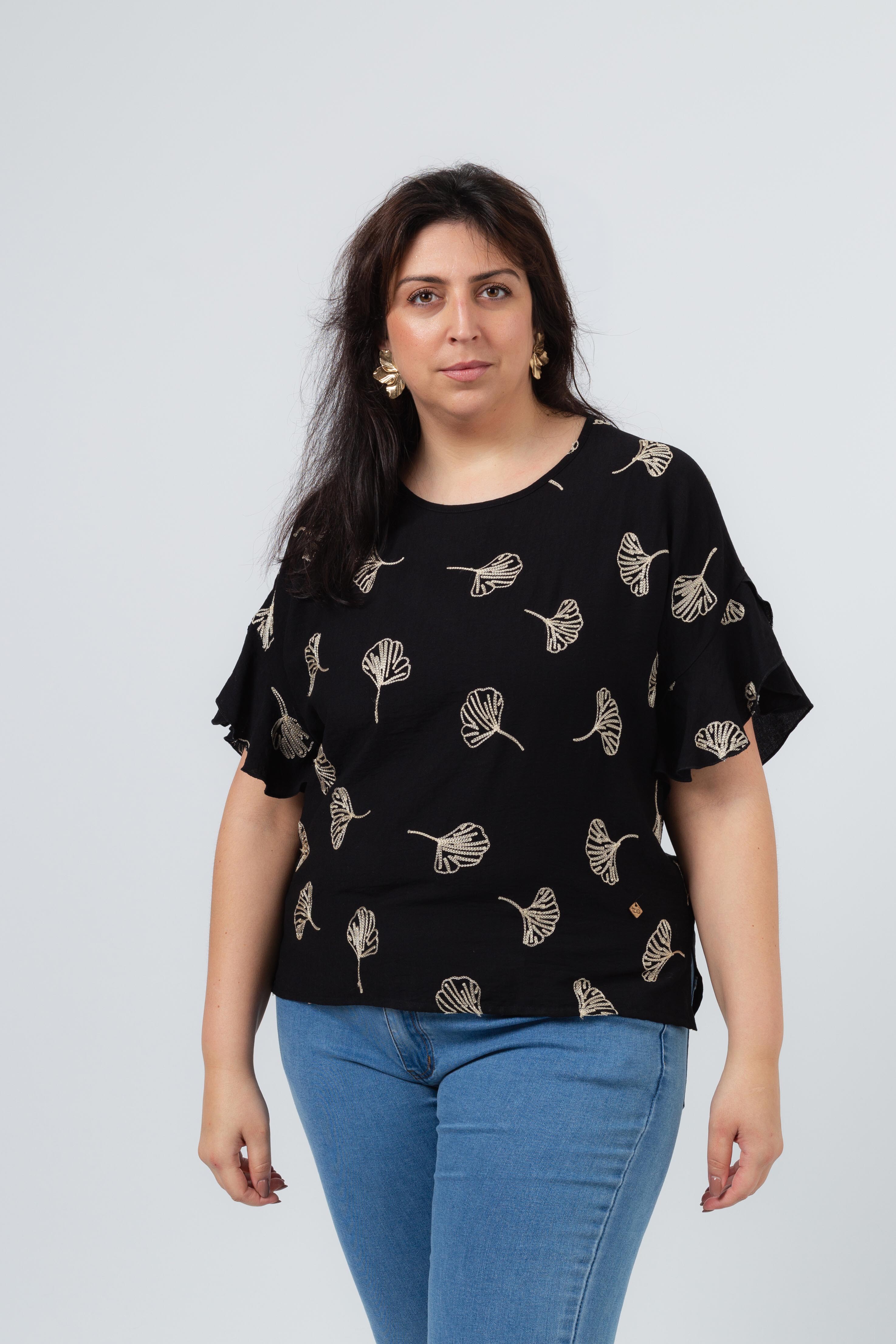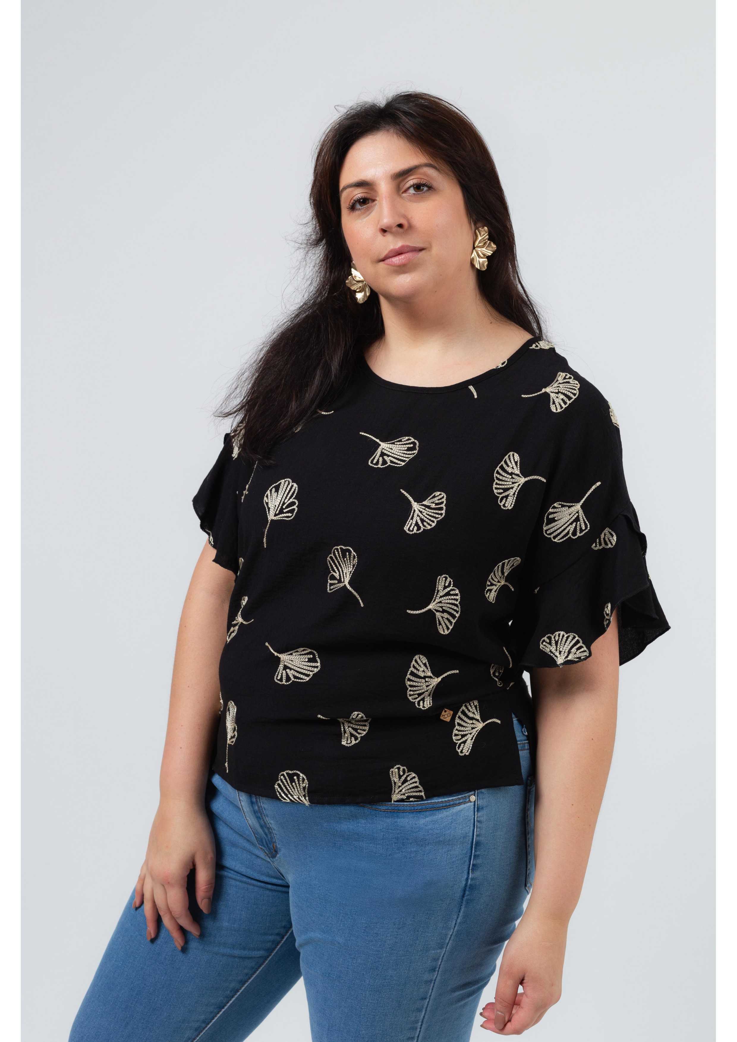 Túnica em tecido liso com bordado de folhas no próprio tecido. Decote redondo, corte nas costas com lágrima fechada. Manga em folho sobreposto, com rolinho e rachas laterais. Disponível em Tamanhos Grandes Produto de desenho e fabrico próprio. Somos uma marca de confeção de vestuário com mais de 50 anos de experiência Modelo: Altura 1.82m e está a vestir o tamanho 3XL.