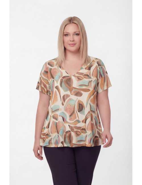 Túnica em malha resil estampada,tons camel, manga curta, decote em bico. Corte na costa, modelo evasé. Peça forrada. Disponível em Tamanhos Grandes Produto de desenho e fabrico próprio. Somos uma marca de confeção de vestuário com mais de 50 anos de experiência