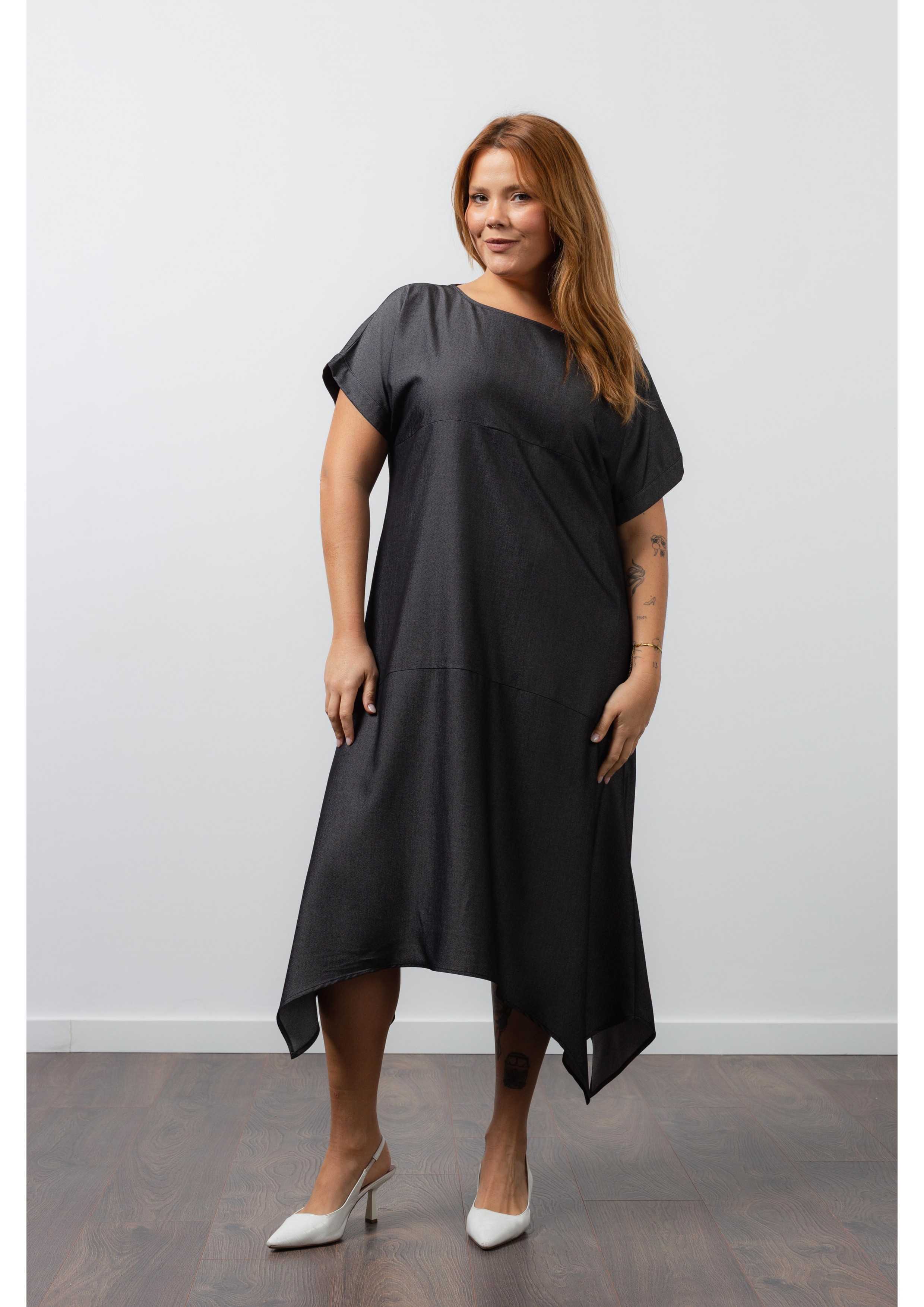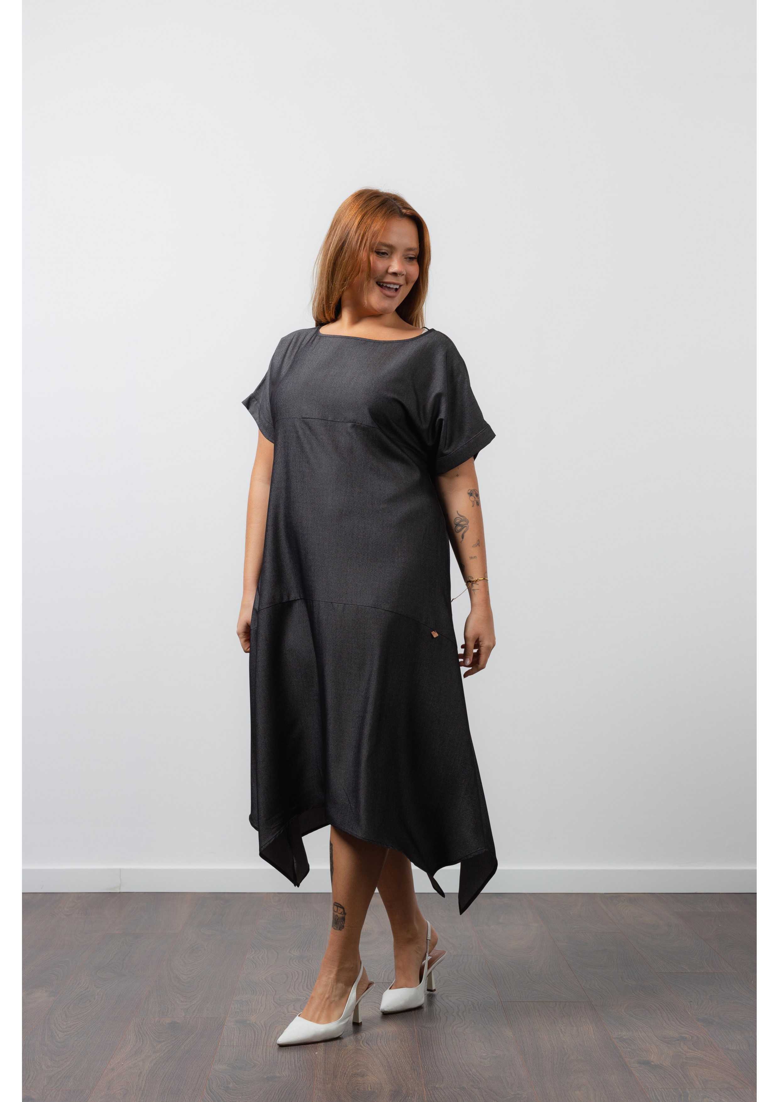 Vestido em tecido liso, efeito ganga, decote redondo, bolsos laterais. Manga morcego com punho pespontado, Cortes no corpo e bicos laterais. Modelo: Altura 1.70m e está a vestir o tamanho XL. |