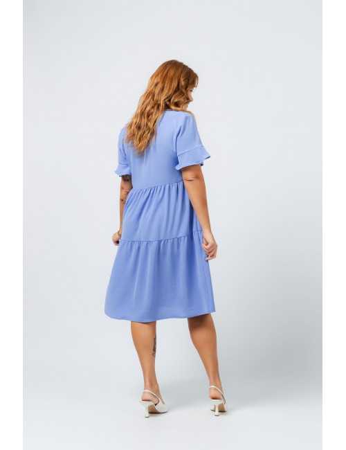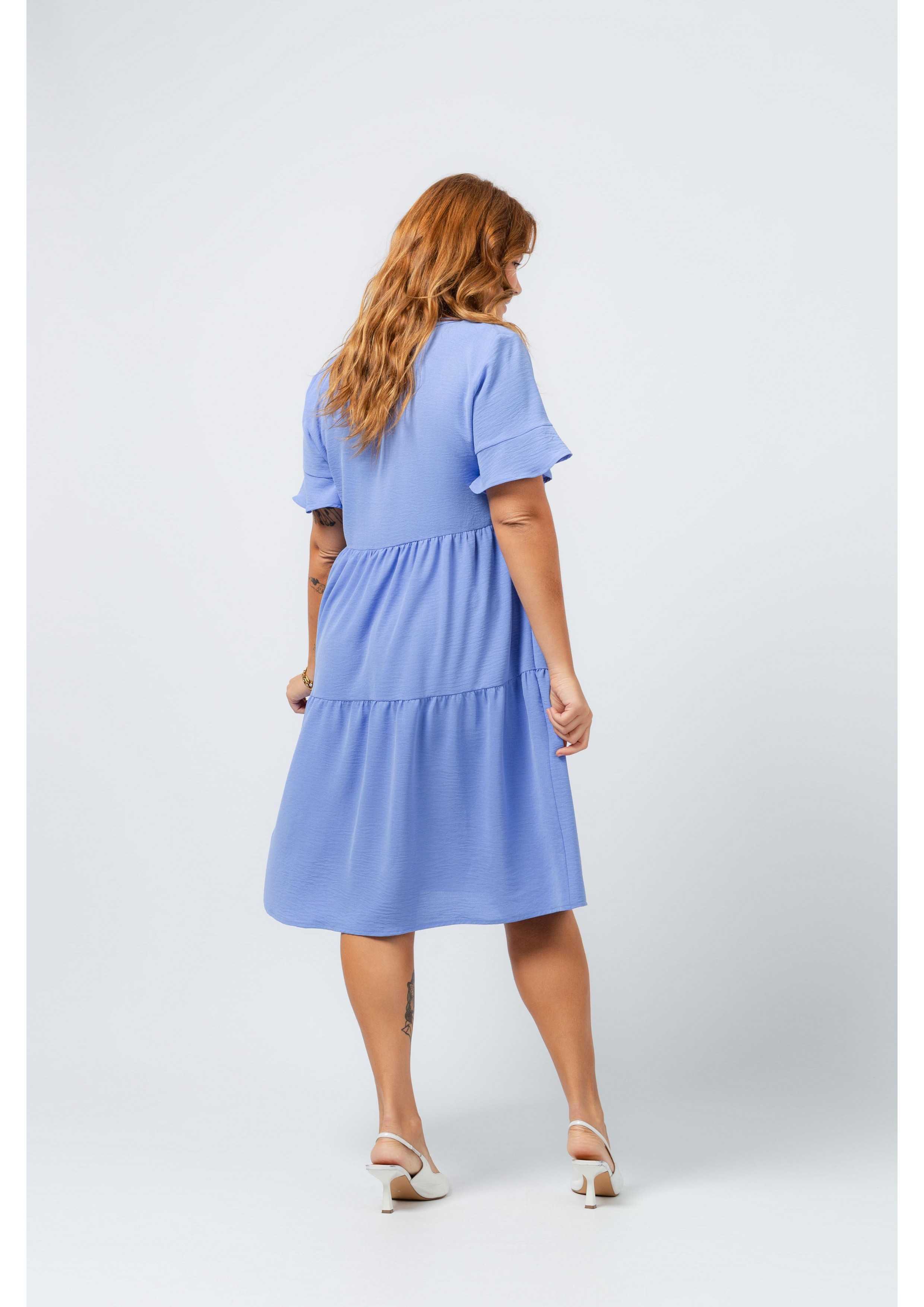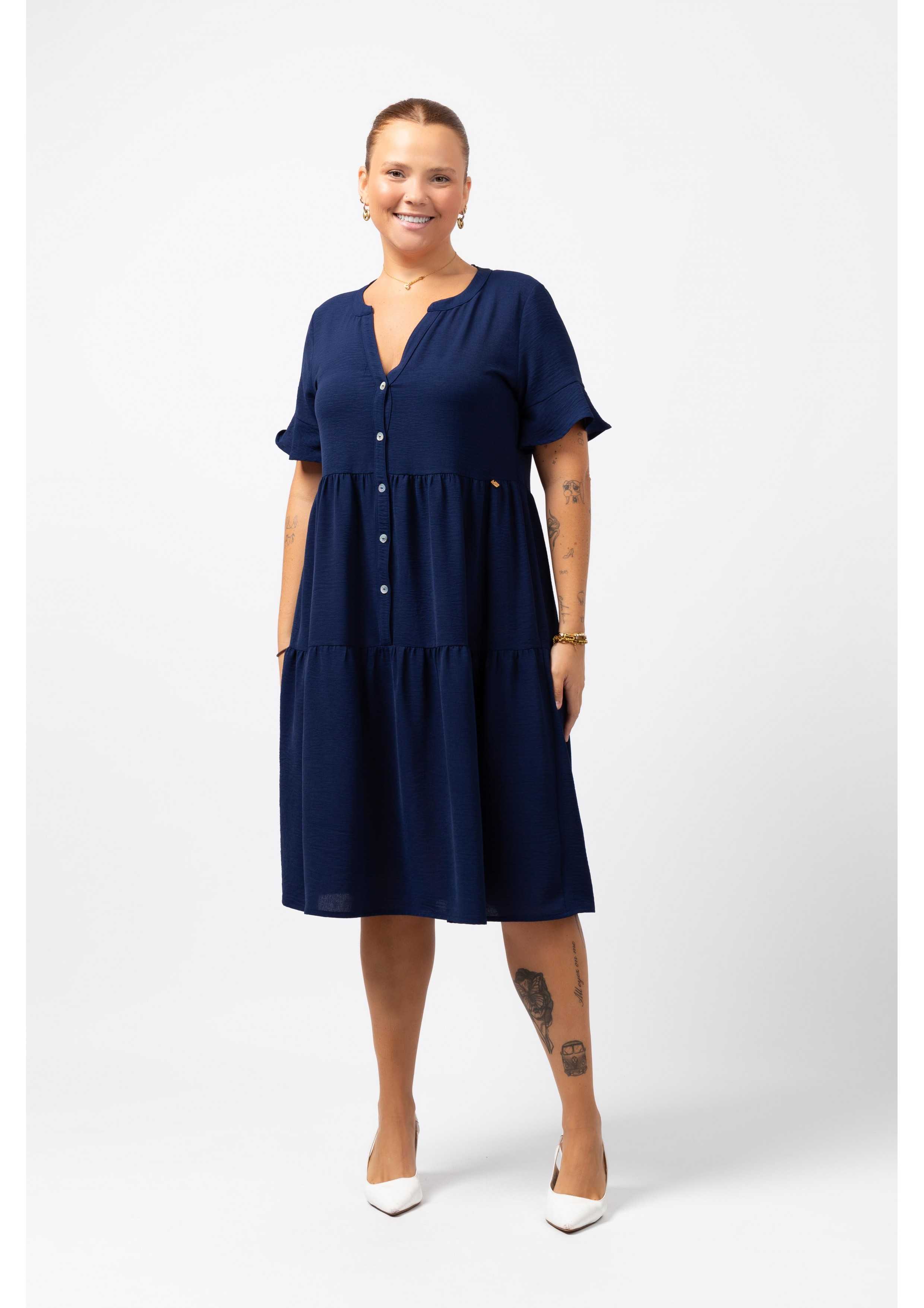 Vestido em tecido liso, gola à padre carcela até meio da peça. Manga curta com folho. Modelo aos folhos franzidos. Modelo: Altura 1.70m e está a vestir o tamanho XL |