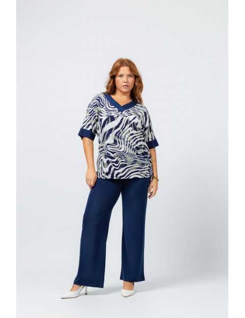Conjunto em malha lisa e estampada, camisola estampada manga morcego, rachas laterais decote em bico e punhos em malha lisa, calça lisa com cinto alto com elástico, modelo largo. Modelo: Altura 1.70m e está a vestir o tamanho XL |
