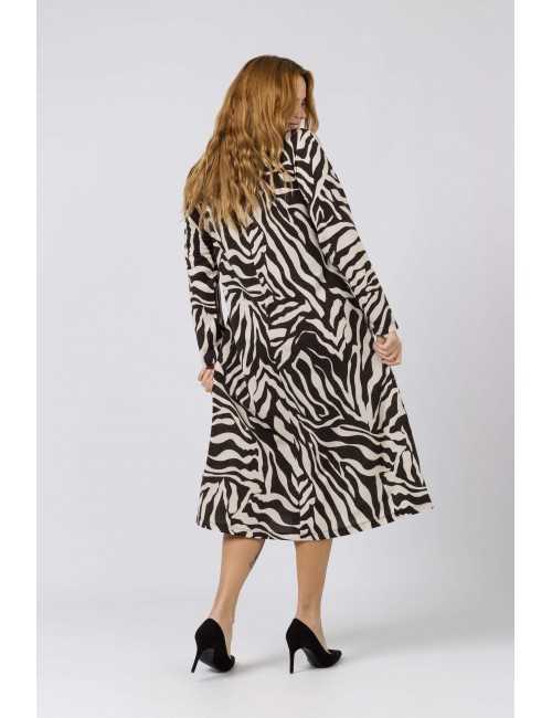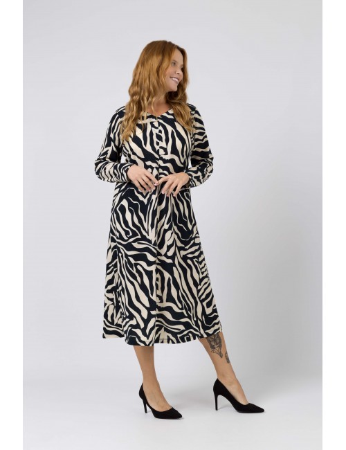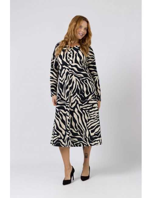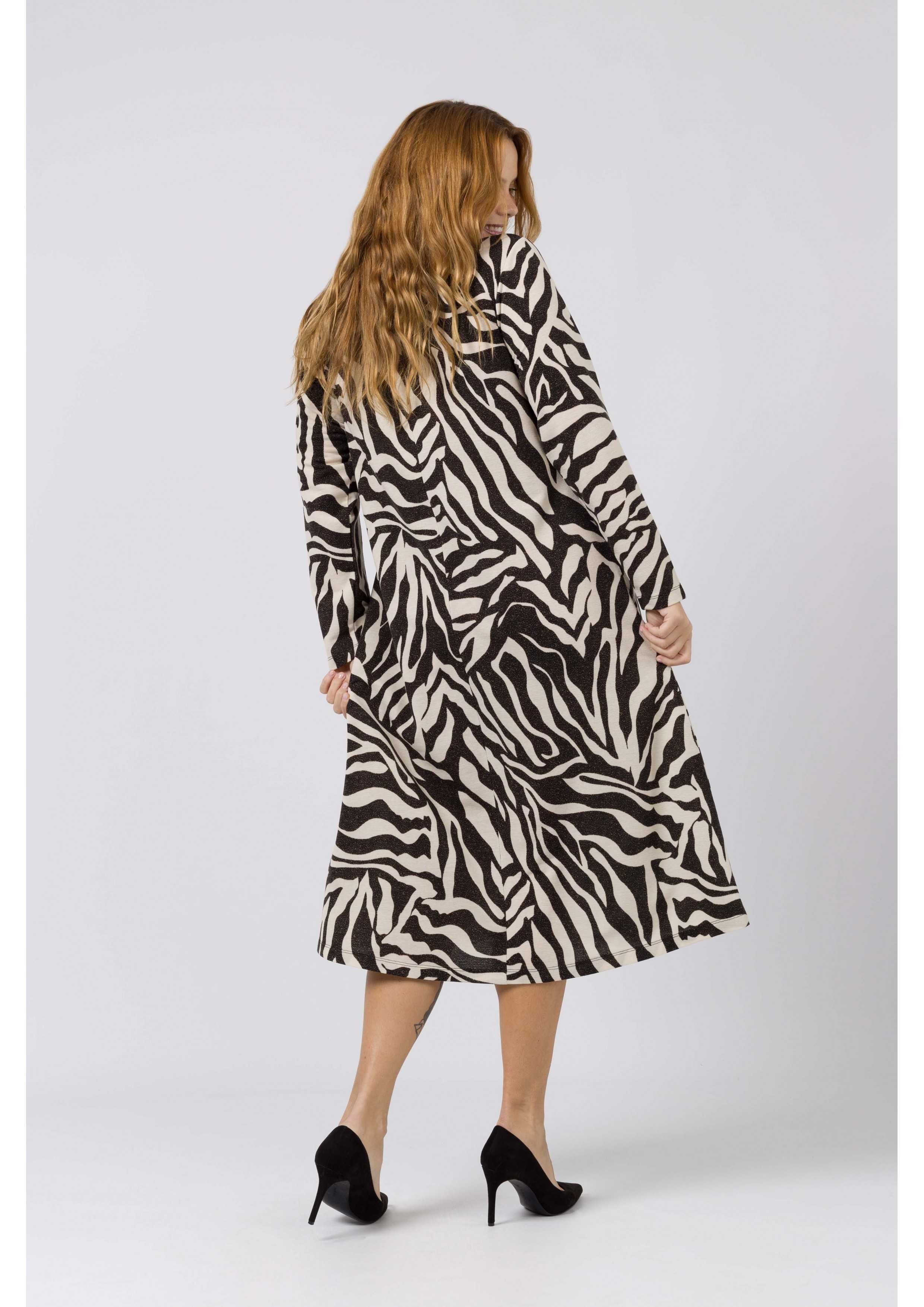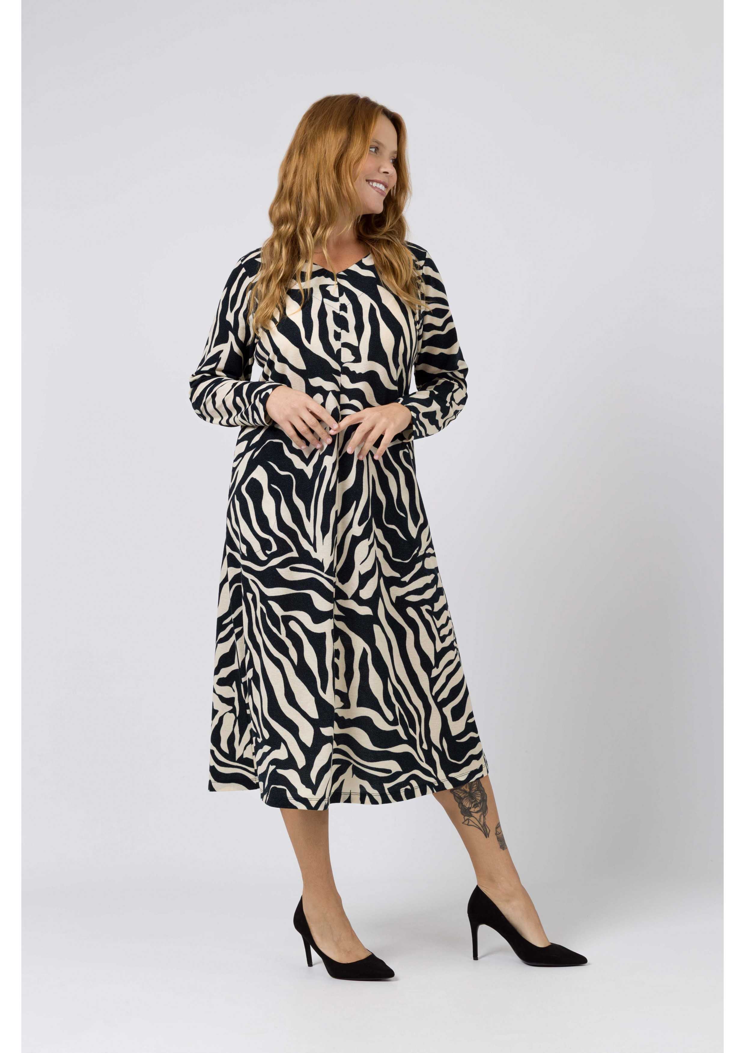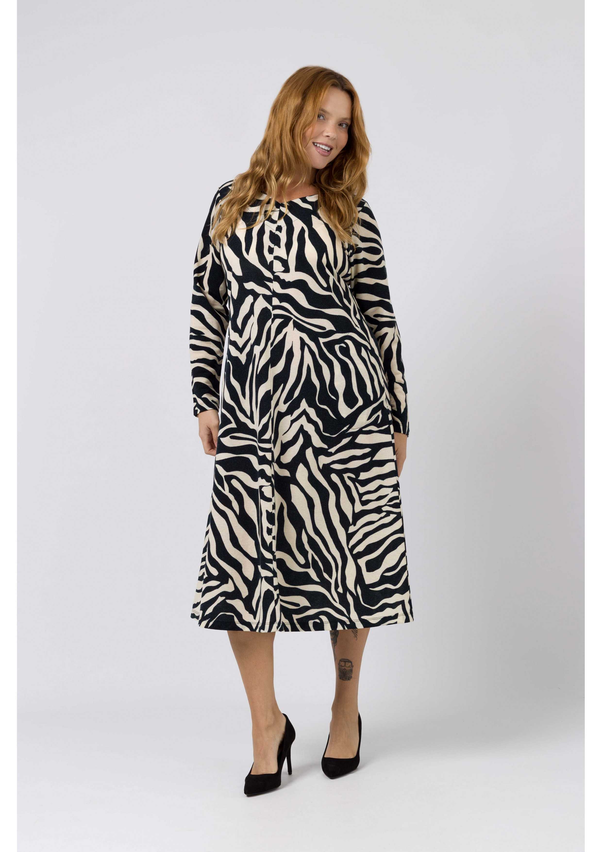 Vestido em malha estampada, manga comprida. Decote em bico com vista pespontada. Corte na frente e costa. Bolsos laterais. Disponível em Tamanhos Grandes Produto de desenho e fabrico próprio. Somos uma marca de confeção de vestuário com mais de 50 anos de experiência Modelo: Altura 1.70m e está a vestir o tamanho XL.