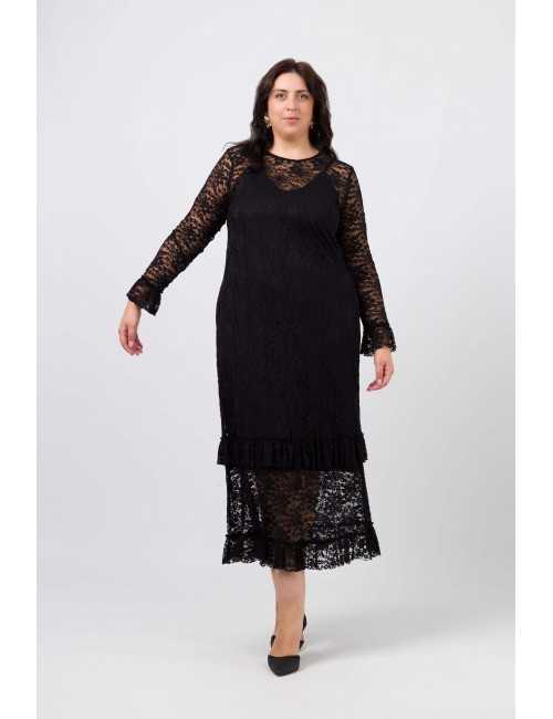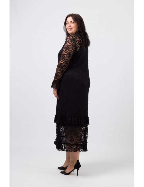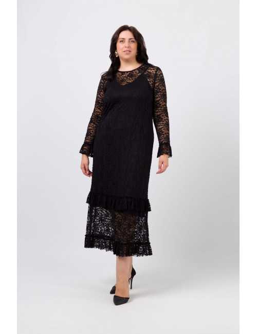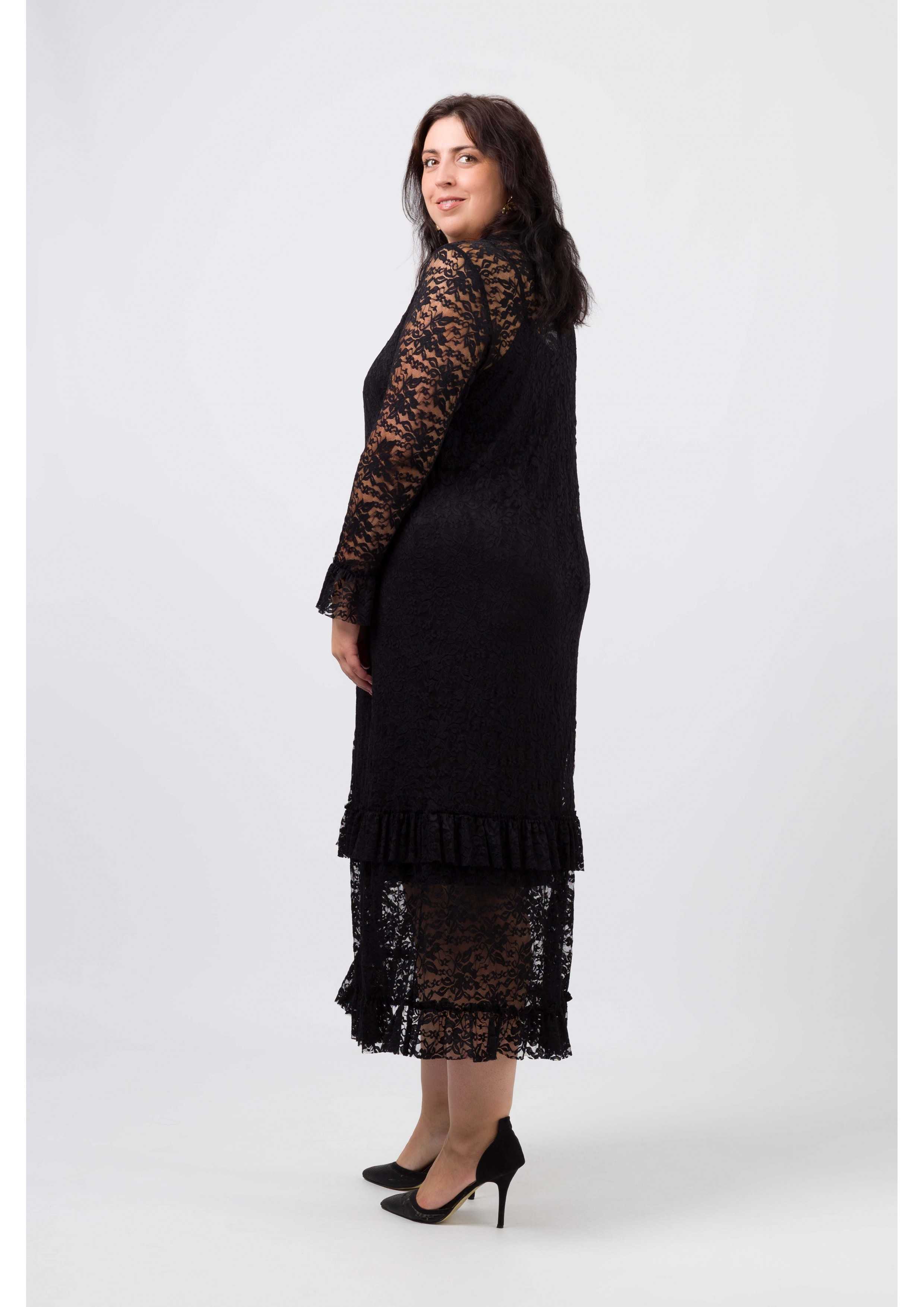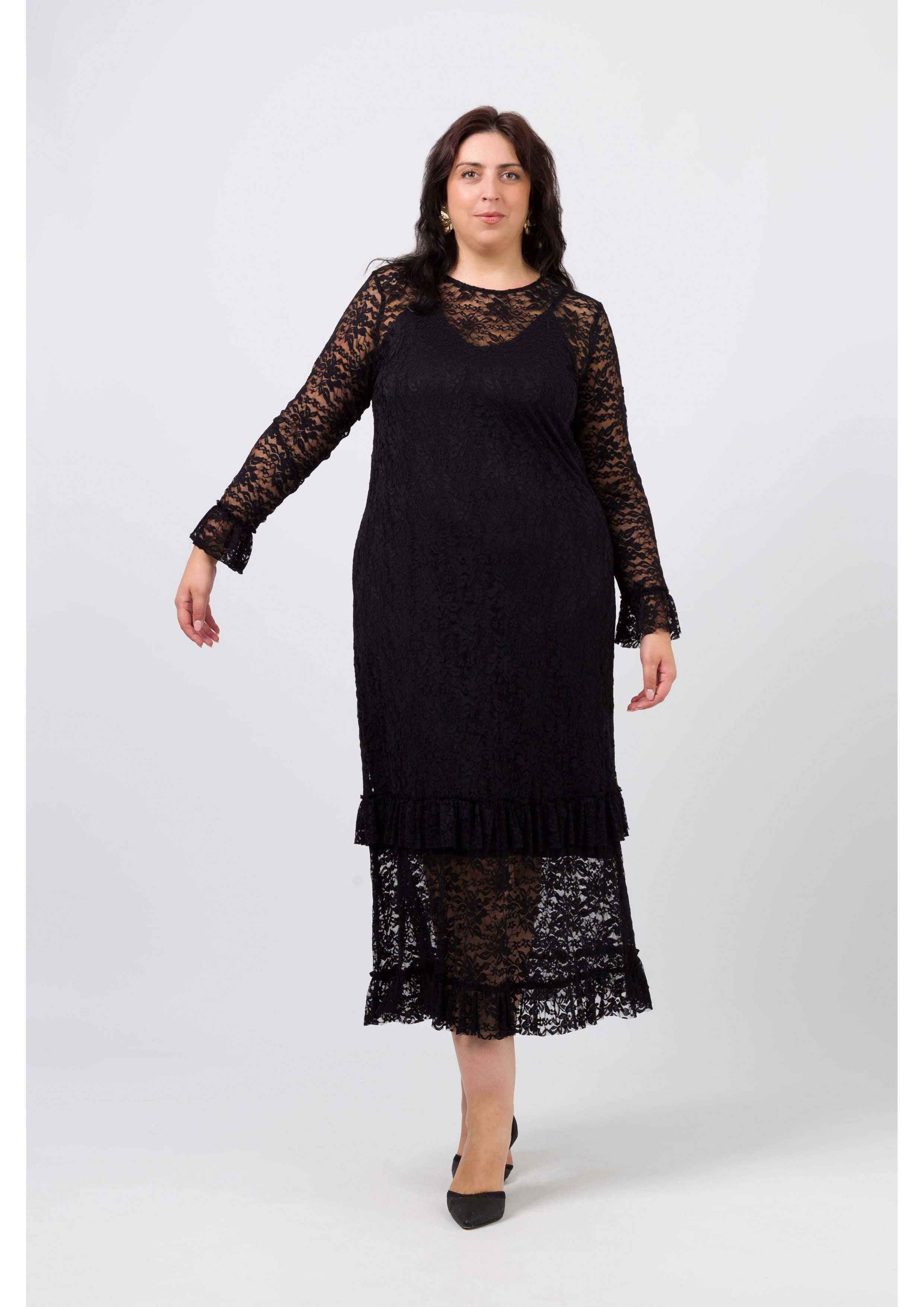 Vestido em renda trabalhada, decote redondo com lágrima costa. manga comprida com folho aplicado, Peça comprida com 2 folhos franzidos. Peça com forro interior solto. Disponível em Tamanhos Grandes Produto de desenho e fabrico próprio. Somos uma marca de confeção de vestuário com mais de 50 anos de experiência Modelo: Altura 1.73m e está a vestir o tamanho 3XL.