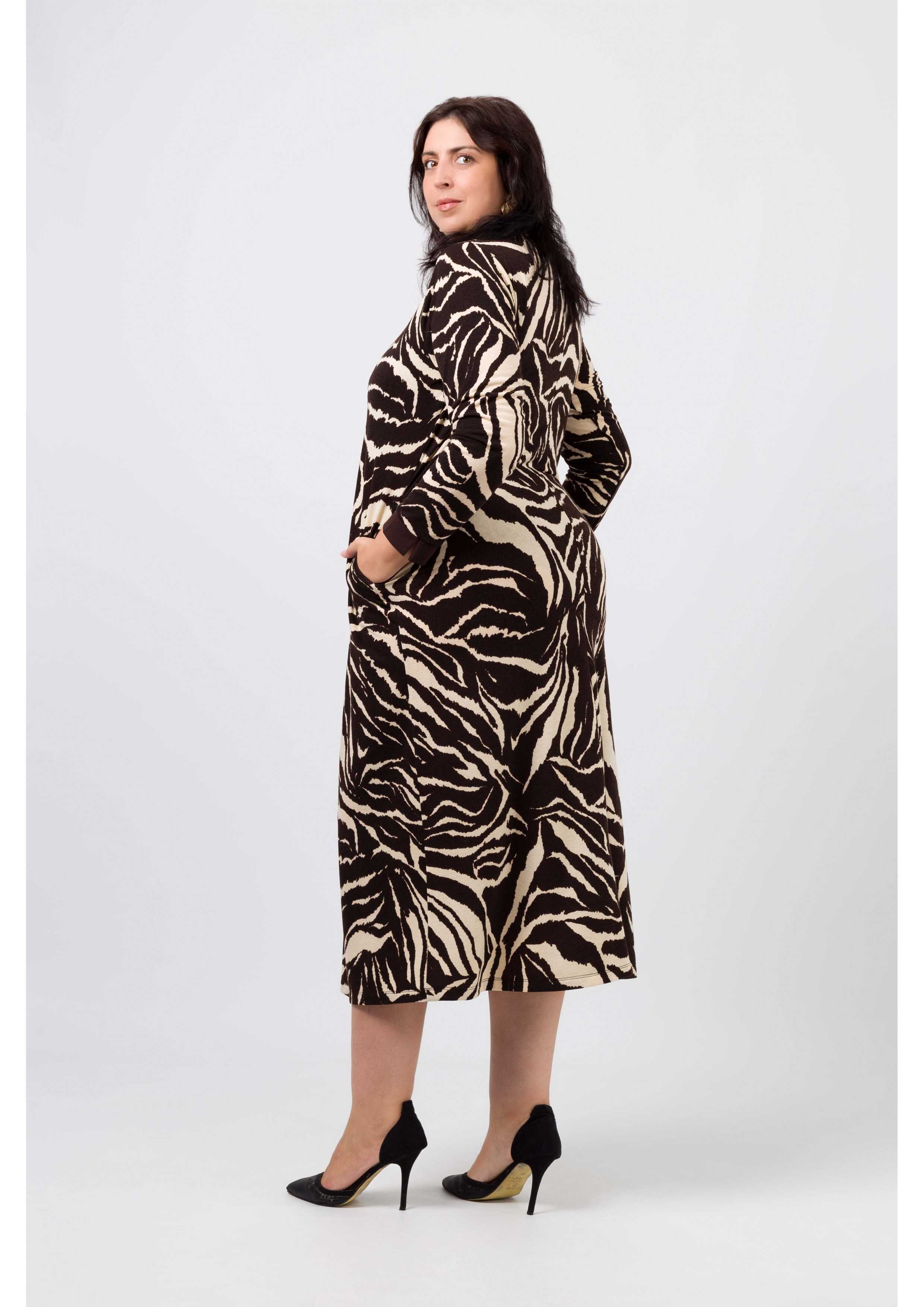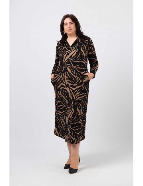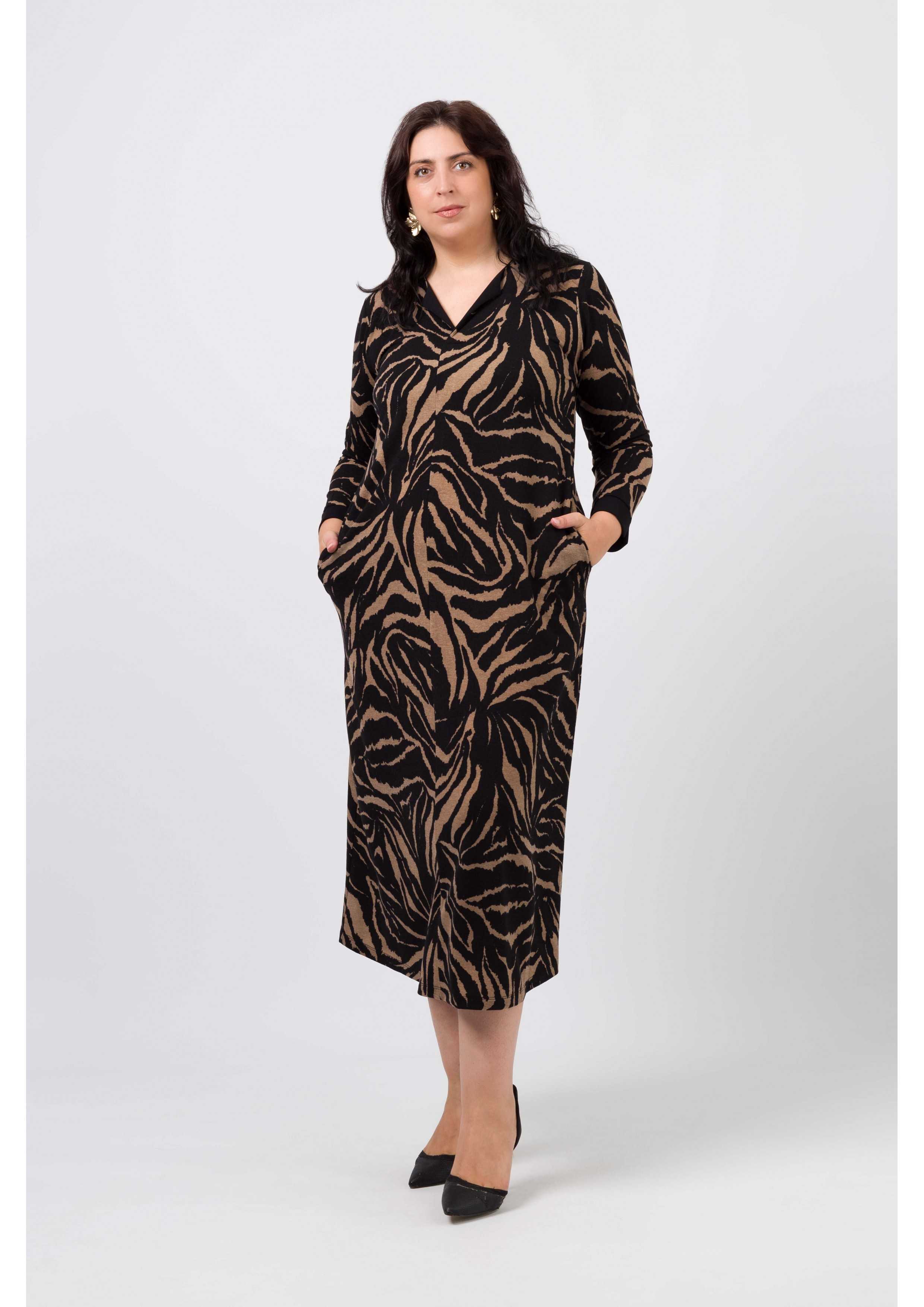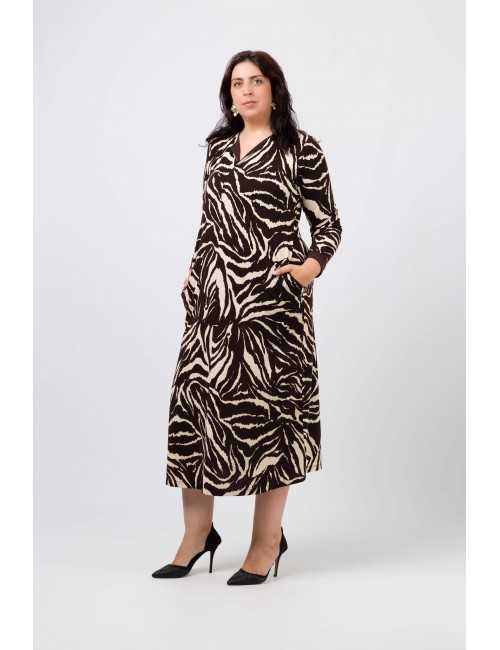 Vestido em malha estampada, corte frente e costa. Decote com imitação de virados em tecido liso. Manga comprida com punhos com rachas. Bolsos laterais. Disponível em Tamanhos Grandes Produto de desenho e fabrico próprio. Somos uma marca de confeção de vestuário com mais de 50 anos de experiência Modelo: Altura 1.73m e está a vestir o tamanho 3XL.