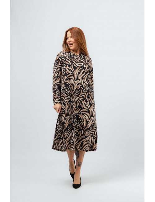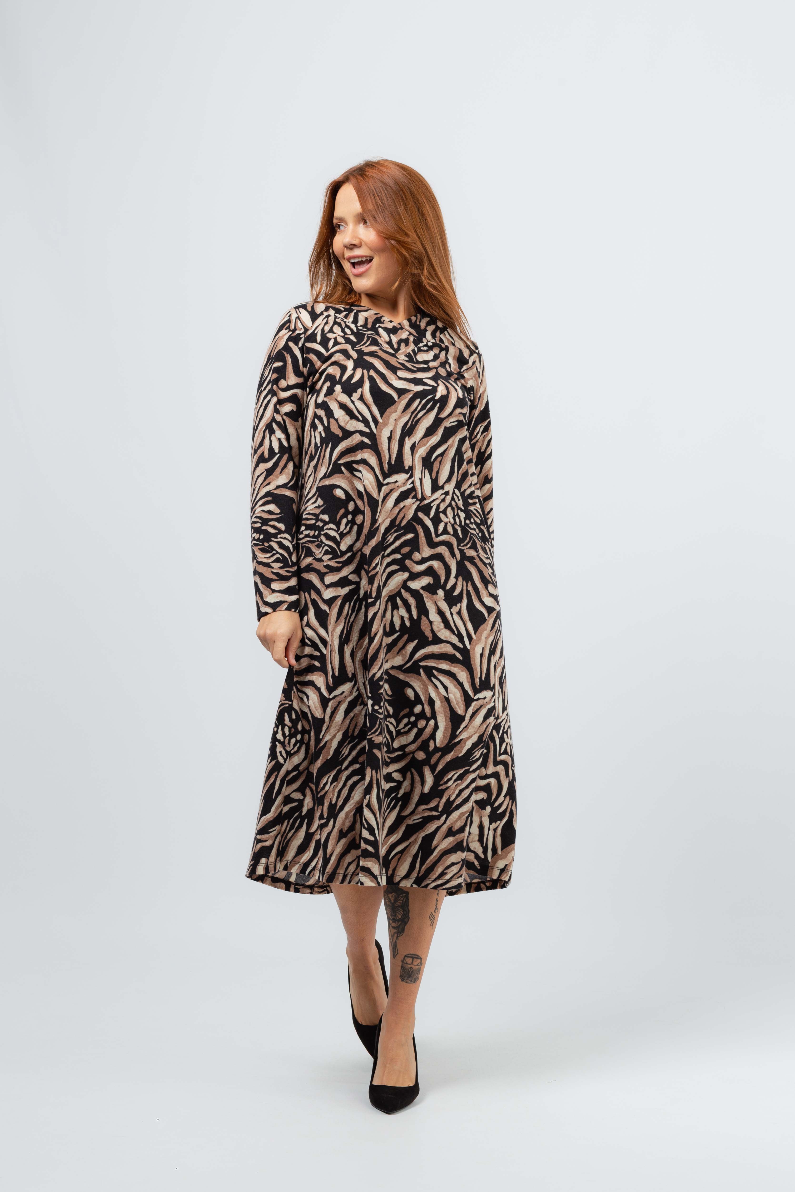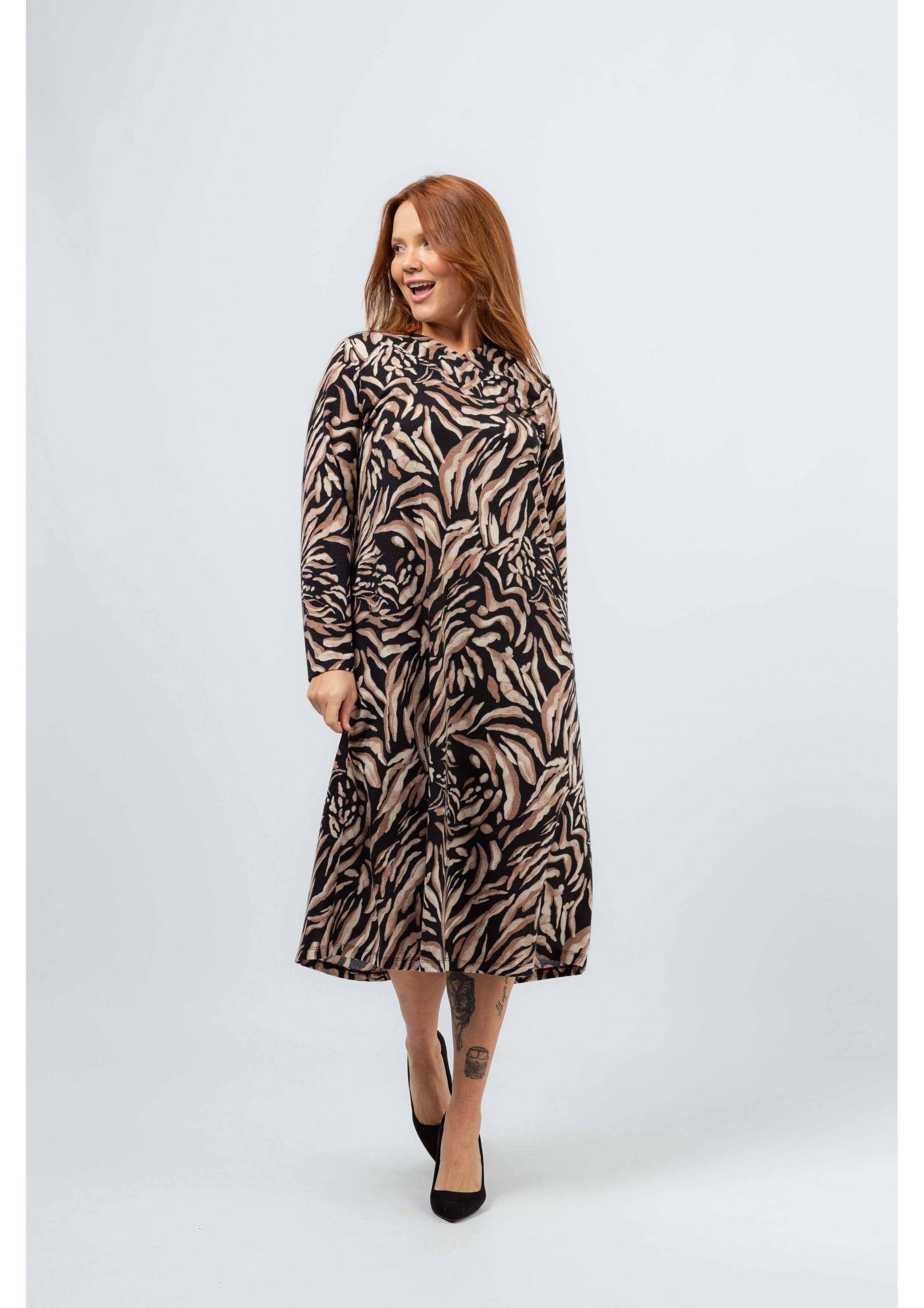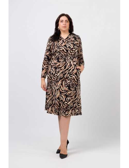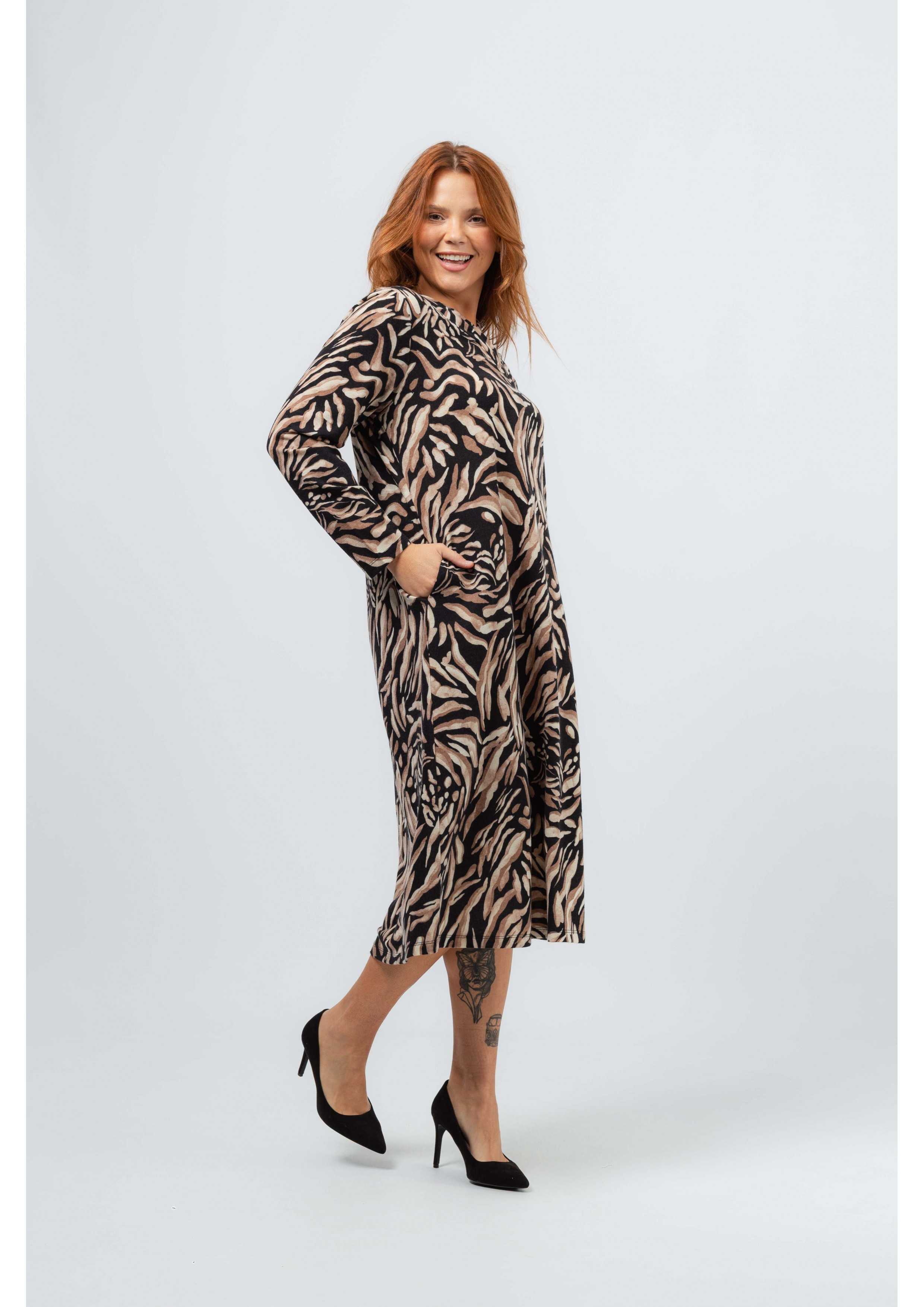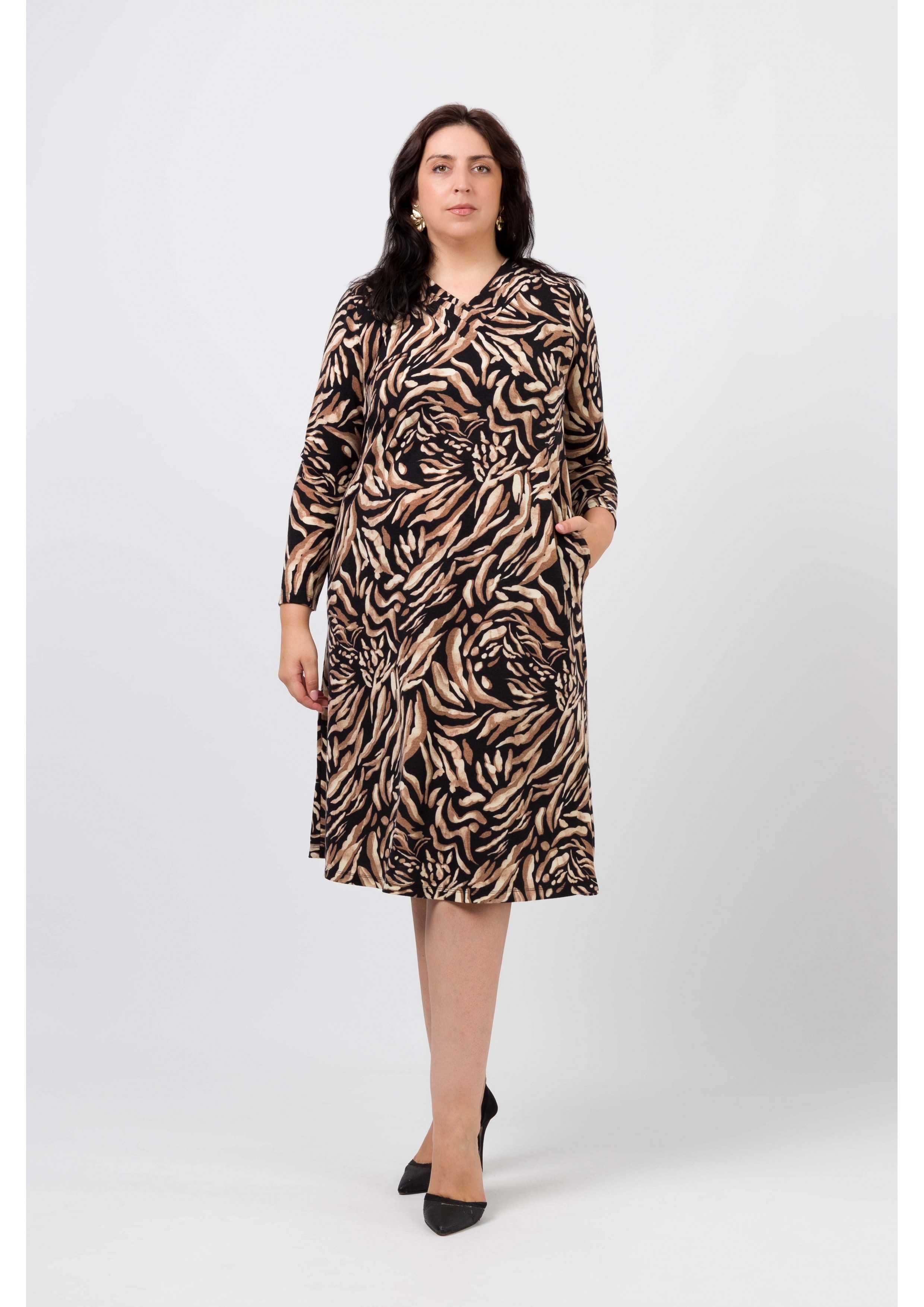 Vestido em malha estampada, manga comprida. Modelo ligeiramente evasé. Decote em bico com pregas num lado só. Bolsos laterais. Corte na costa. Disponível em Tamanhos Grandes Produto de desenho e fabrico próprio. Somos uma marca de confeção de vestuário com mais de 50 anos de experiência Modelo: Altura 1.73m e está a vestir o tamanho 3XL.