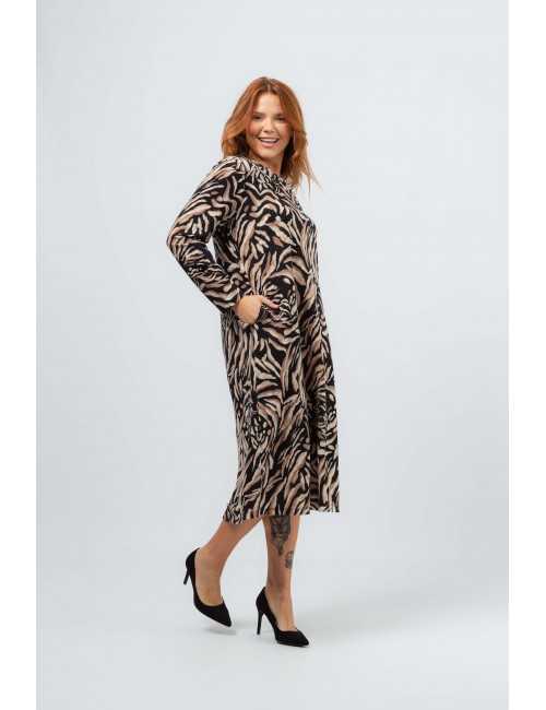 Vestido em malha estampada, manga comprida. Modelo ligeiramente evasé. Decote em bico com pregas num lado só. Bolsos laterais. Corte na costa.