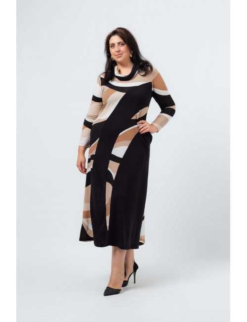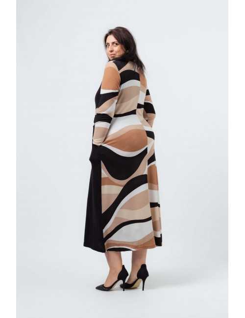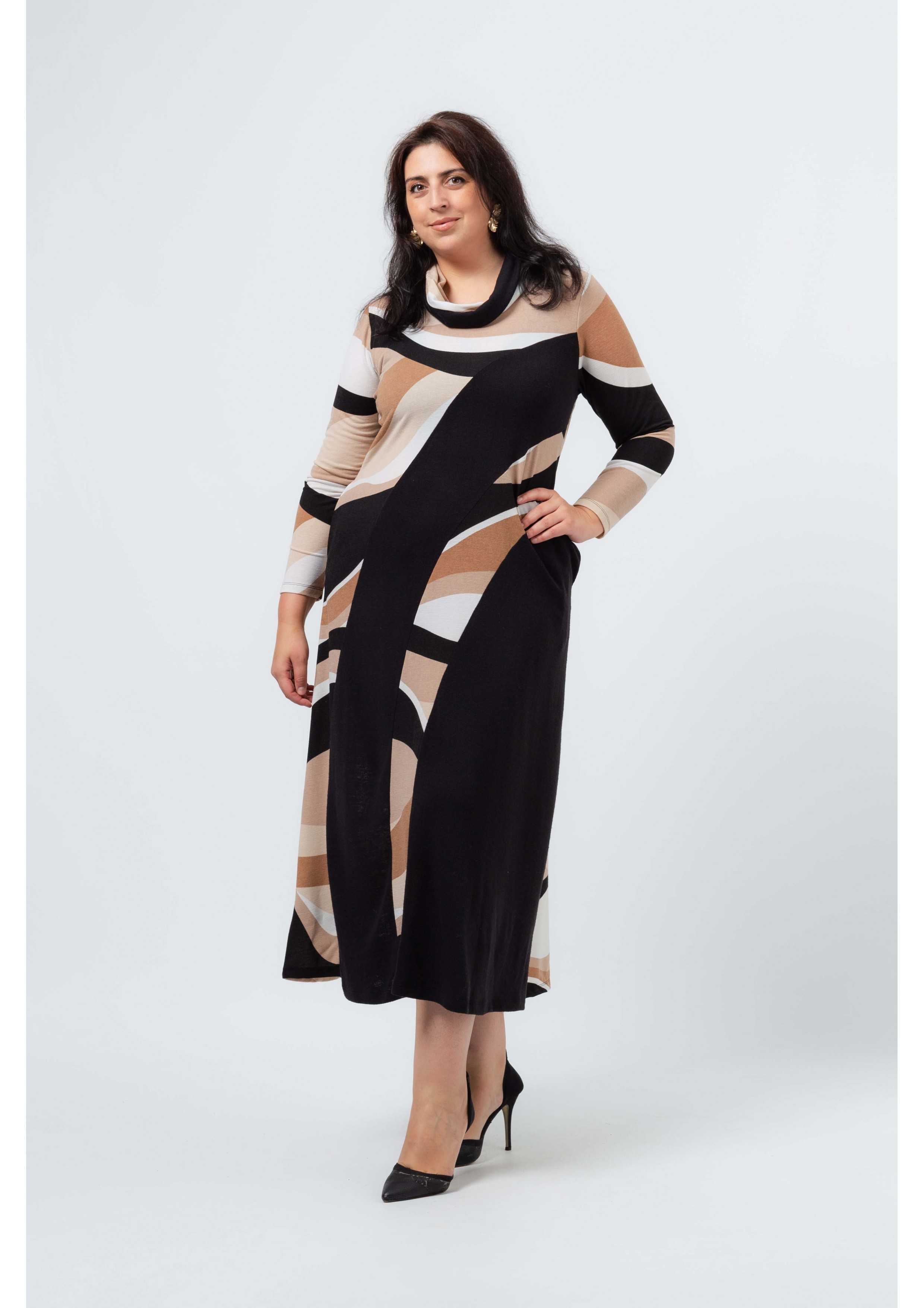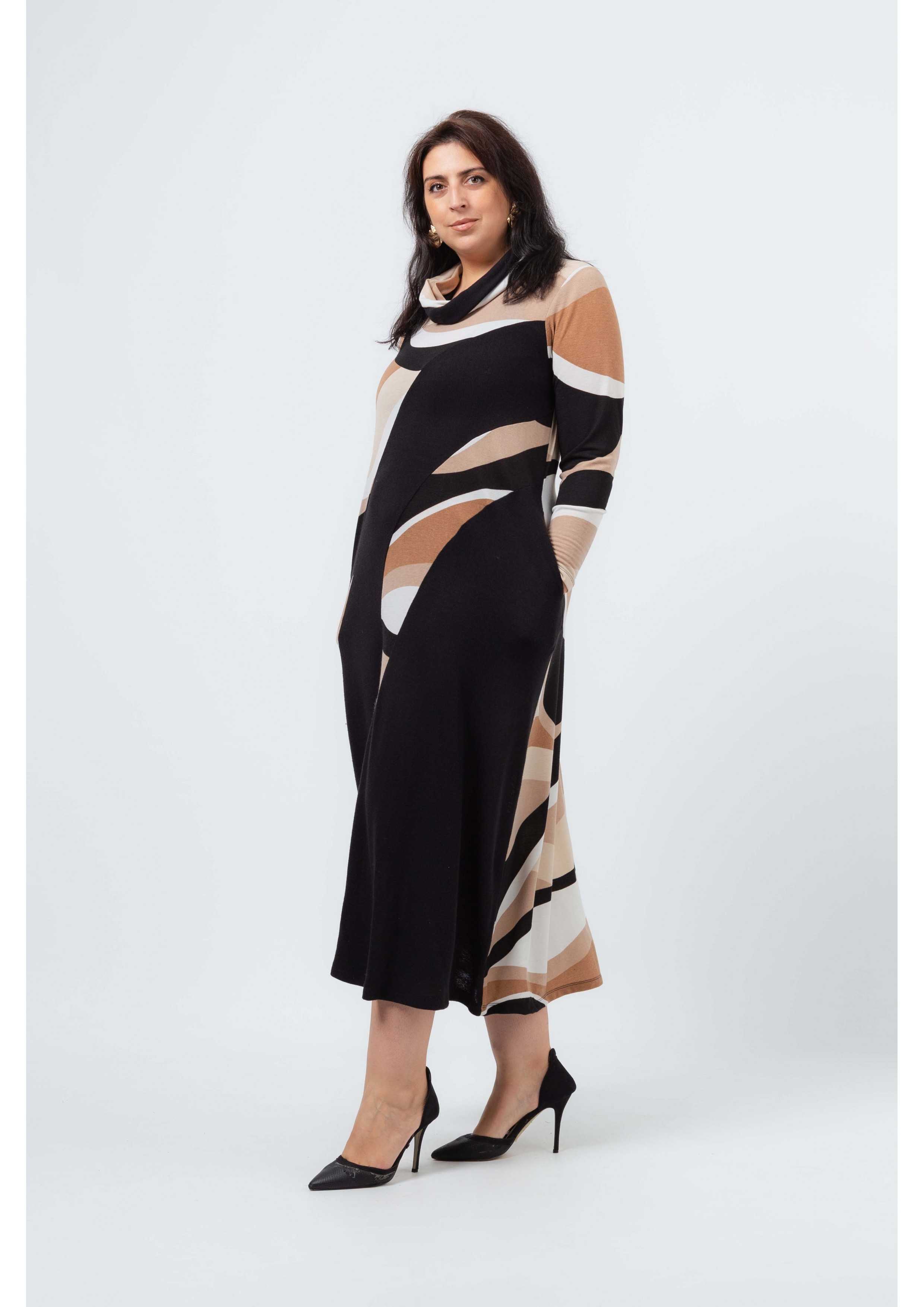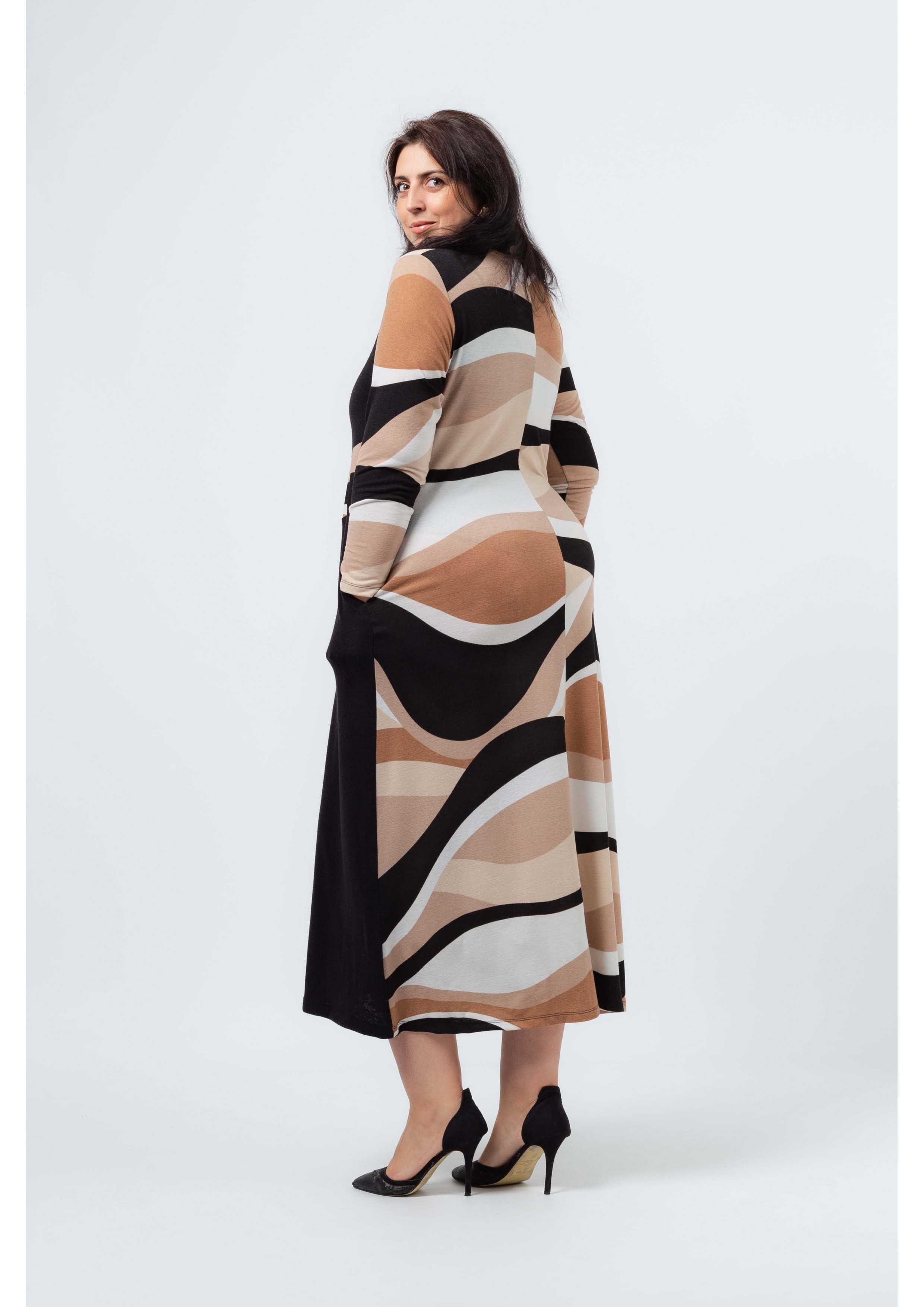 Vestido em malha estampada, tons camel, com encaixes lisos. decote redondo. Manga comprida. Bolsos laterais. corte na costa. Gola 2 cores por e tirar. Disponível em Tamanhos Grandes Produto de desenho e fabrico próprio. Somos uma marca de confeção de vestuário com mais de 50 anos de experiência Modelo: Altura 1.73m e está a vestir o tamanho 3XL.