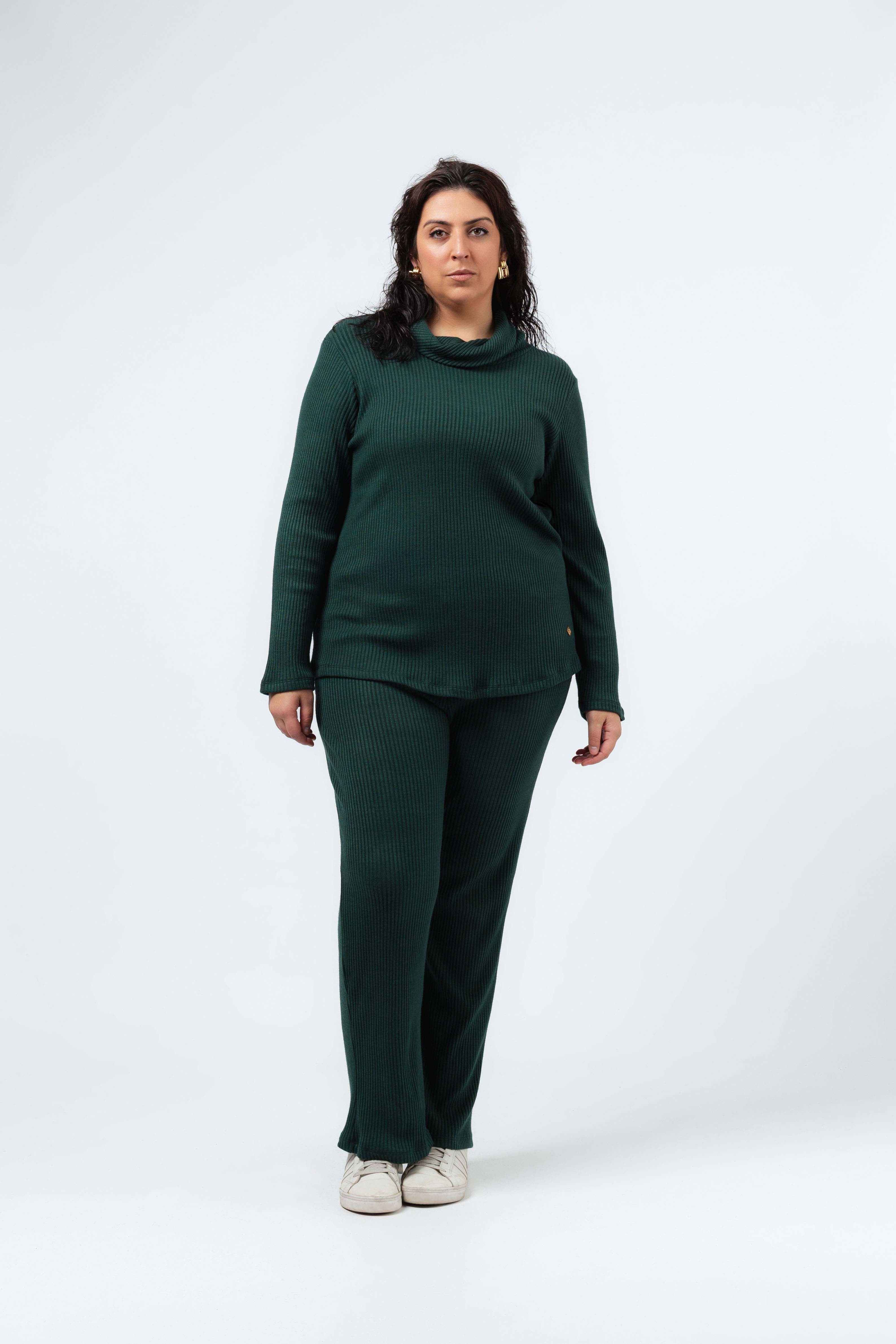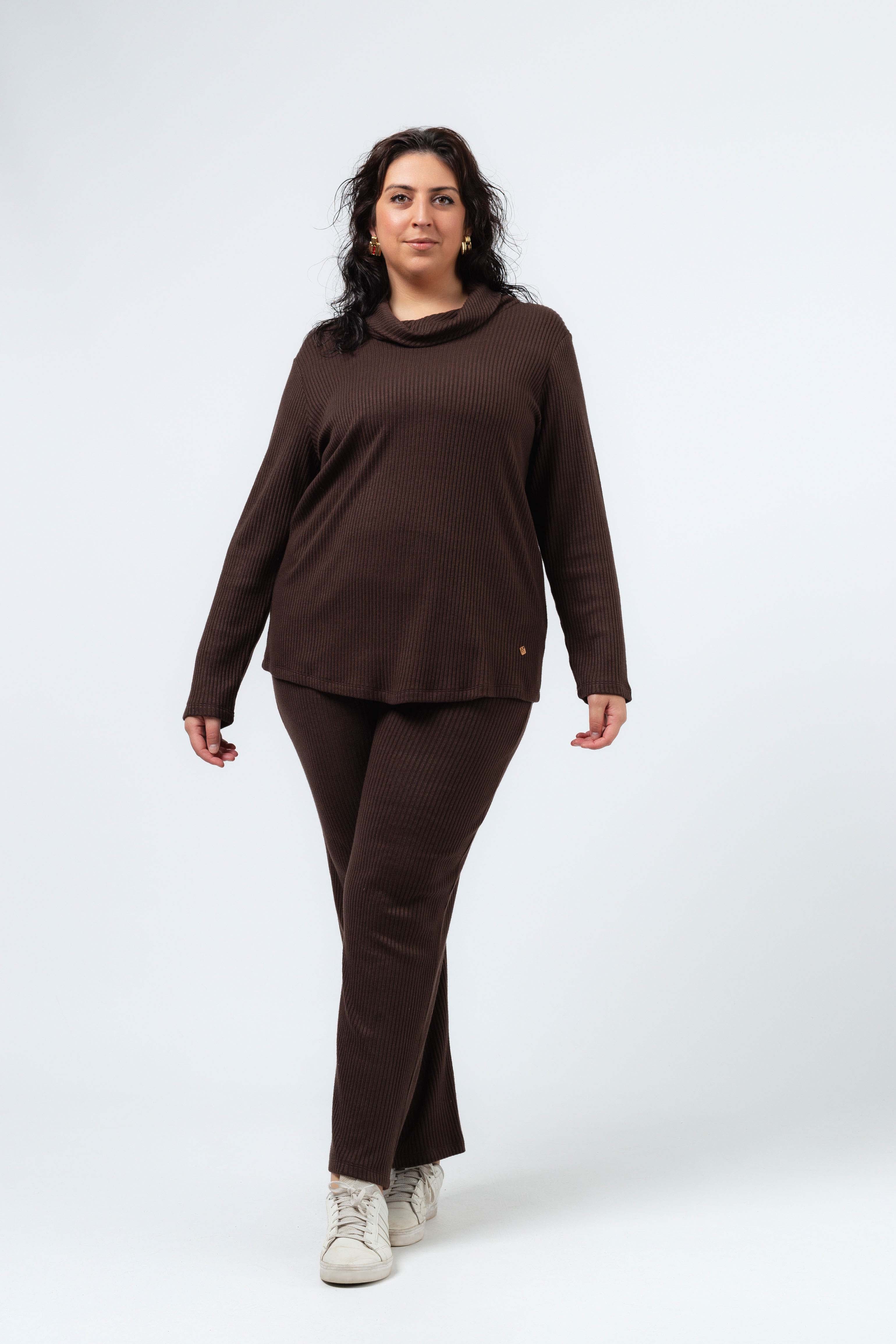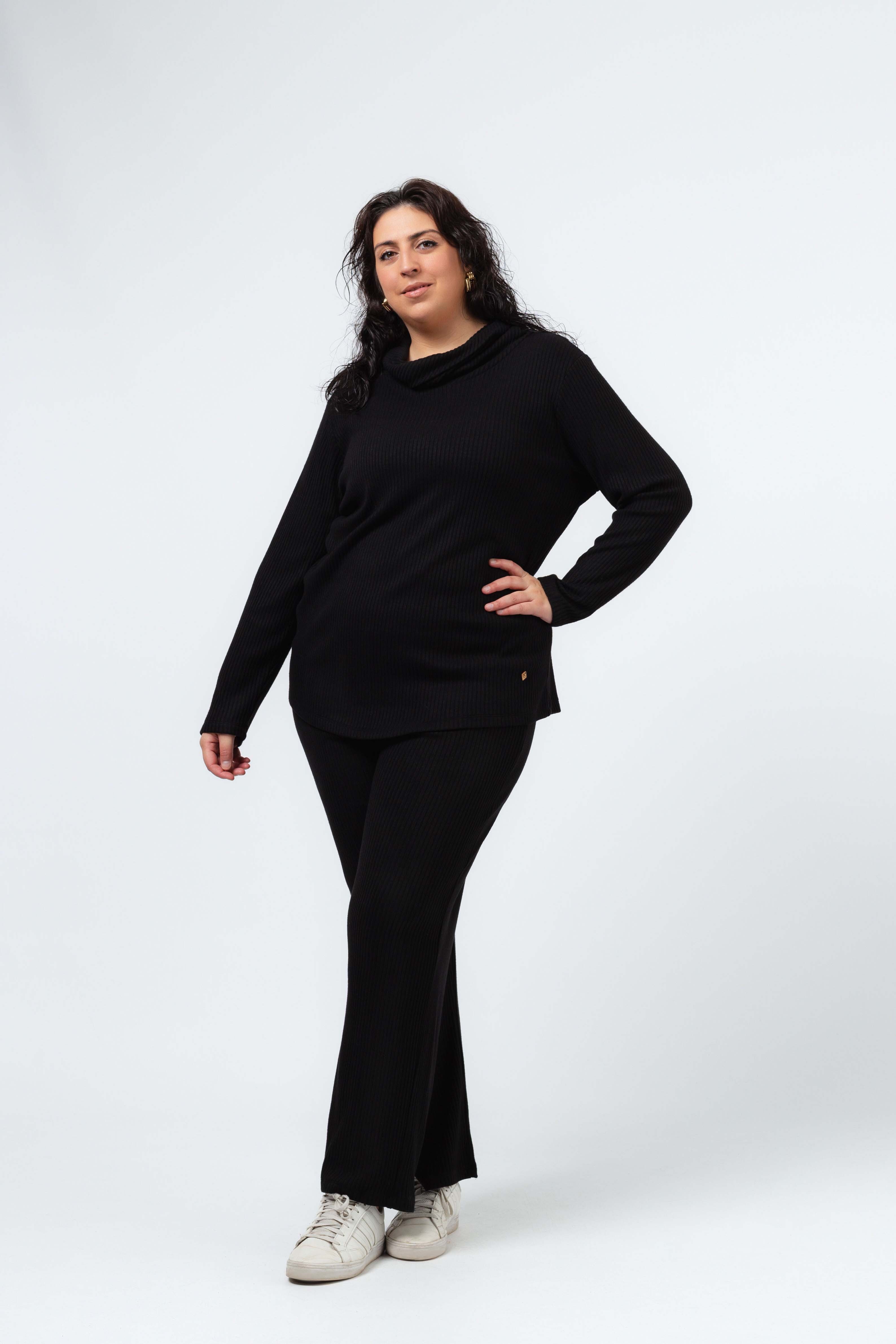 Conjunto em malha lisa canelada, camisola gola alta caída, base arredondada, calça com elástico recoberto na cintura.